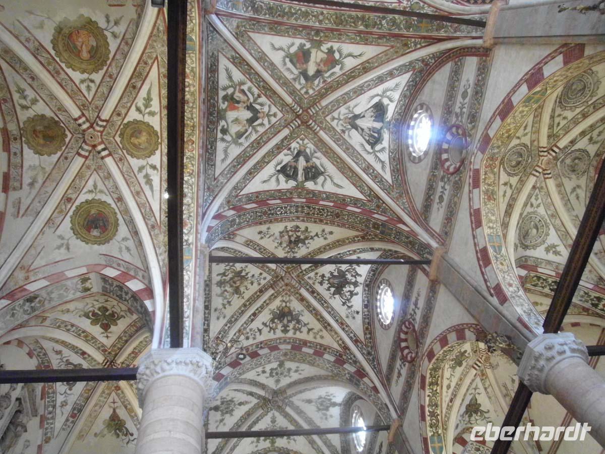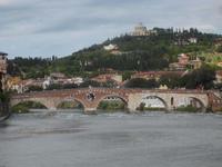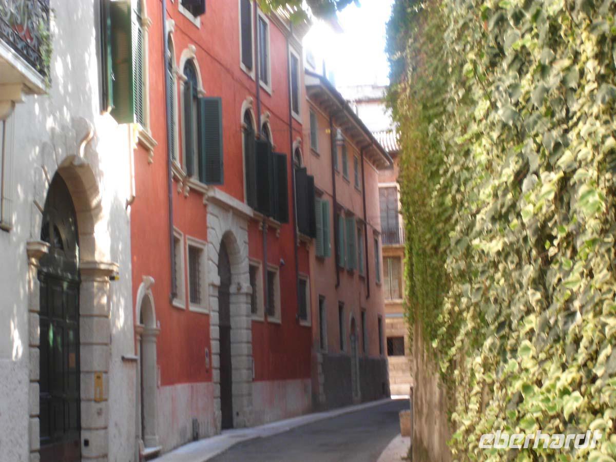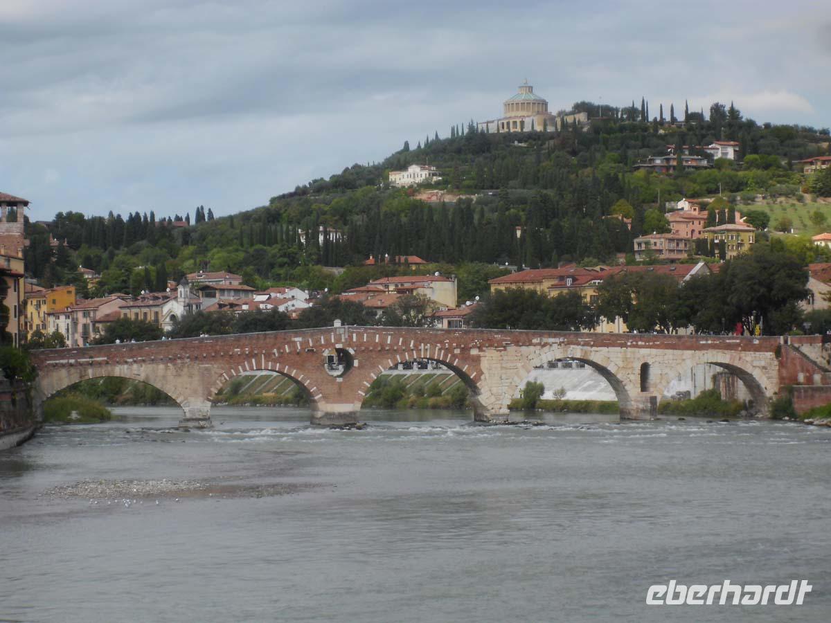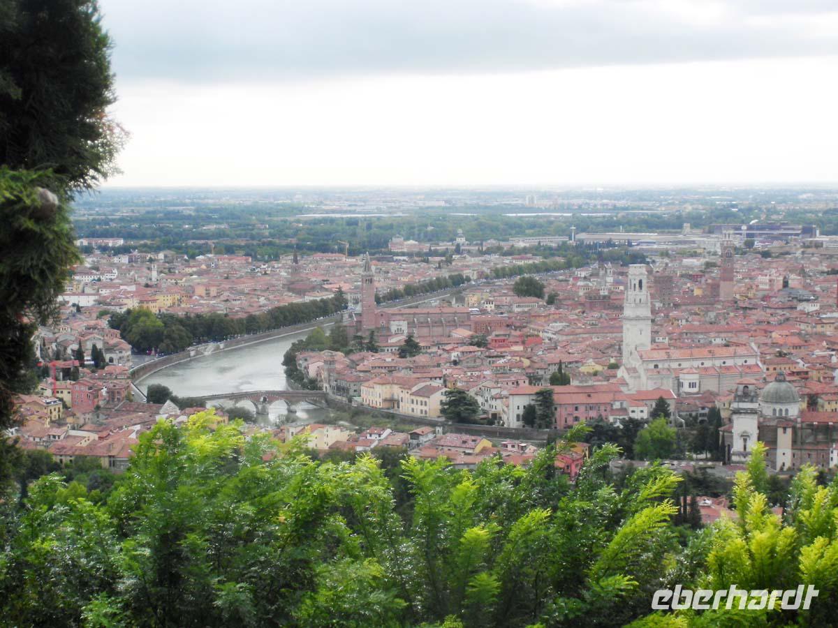 Unsere Stadtrundfahrt führt uns zunächst an den mächtigen Bastionen der Befestigung vorbei zum Santuario Sta. Maria di Lourdes. Das ist zwar kunsthistorisch nicht so interessant, jedoch bietet sich hier ein überwältigender Blick von oben auf die gesamte Stadt. Genau der richtige, um sich zunächst einen Überblick zu verschaffen. Umflossen von der Etsch, befindet sich das Zentrum der riesigen Altstadt mitten in der Flußschleife. Unterhalb der mächtigen Skaligerburg steigen wir aus dem Bus und begeben uns zu Fuß durch die engen Gassen mit den gotischen und renaissancezeitlichen Palazzi.
