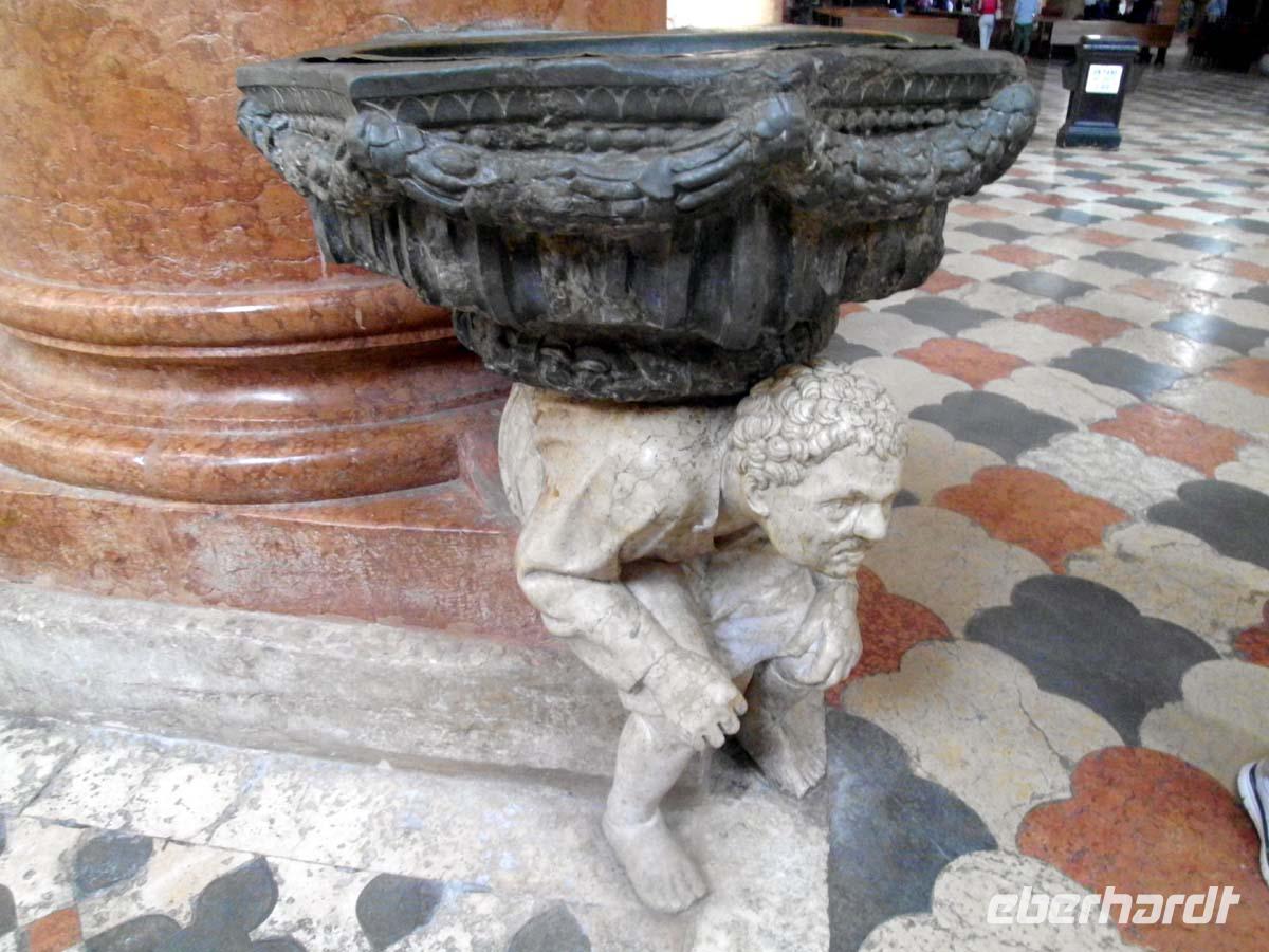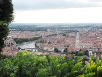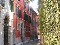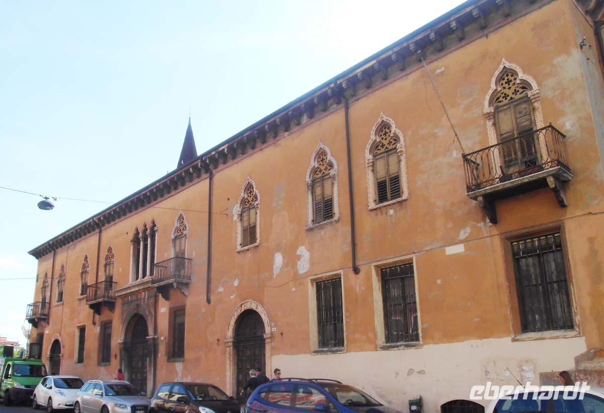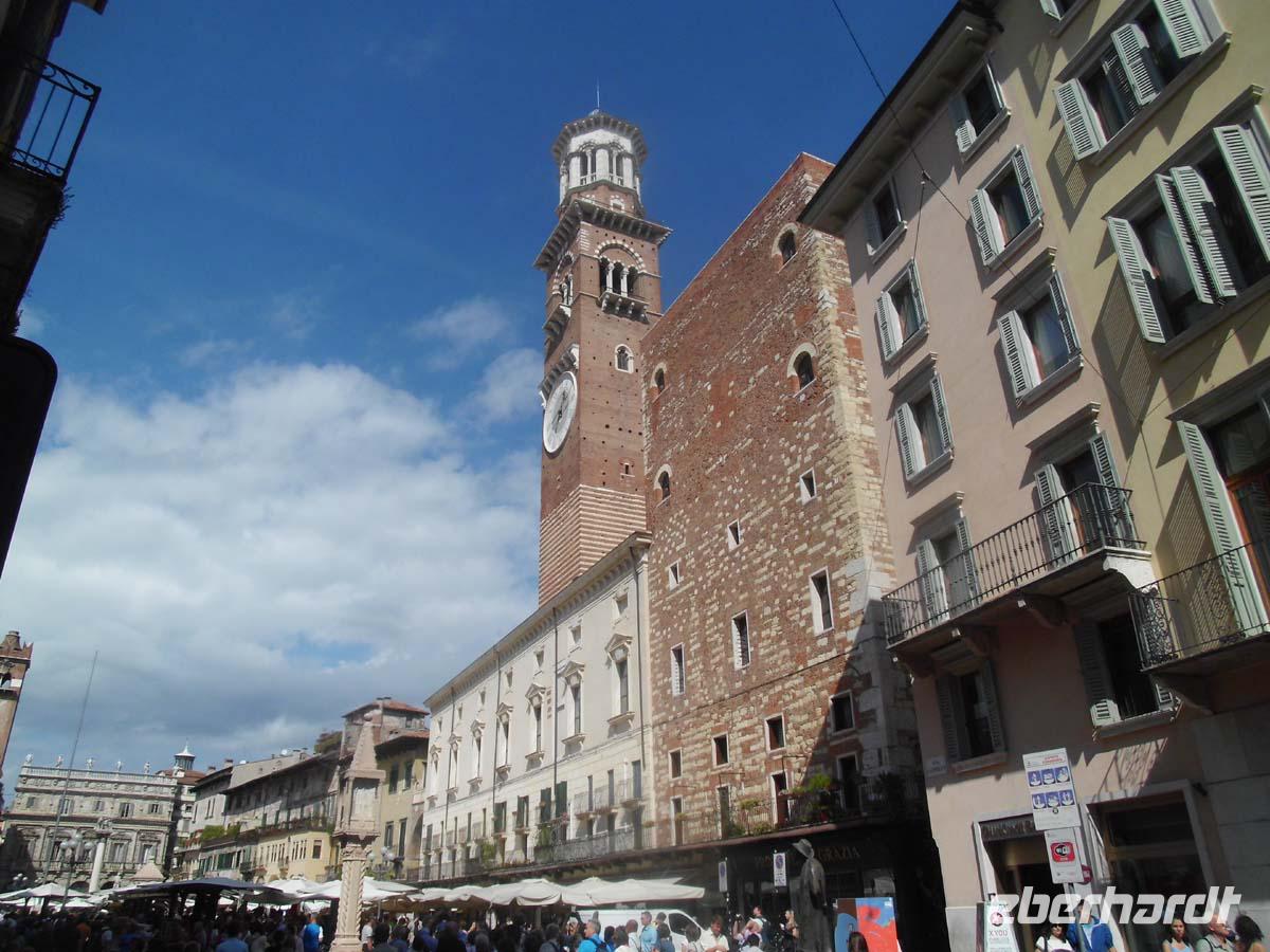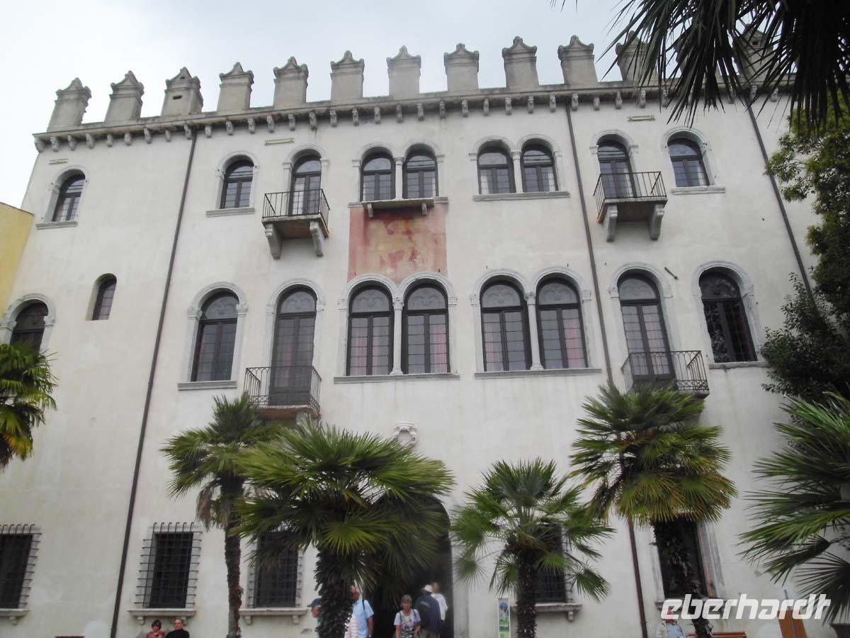 Unsere Stadtrundfahrt führt uns zunächst an den mächtigen Bastionen der Befestigung vorbei zum Santuario Sta. Maria di Lourdes. Das ist zwar kunsthistorisch nicht so interessant, jedoch bietet sich hier ein überwältigender Blick von oben auf die gesamte Stadt. Genau der richtige, um sich zunächst einen Überblick zu verschaffen. Umflossen von der Etsch, befindet sich das Zentrum der riesigen Altstadt mitten in der Flußschleife. Unterhalb der mächtigen Skaligerburg steigen wir aus dem Bus und begeben uns zu Fuß durch die engen Gassen mit den gotischen und renaissancezeitlichen Palazzi.