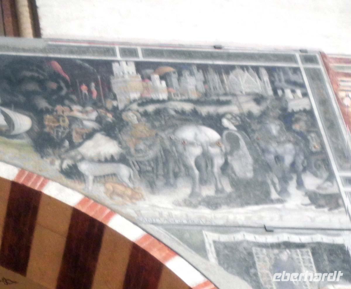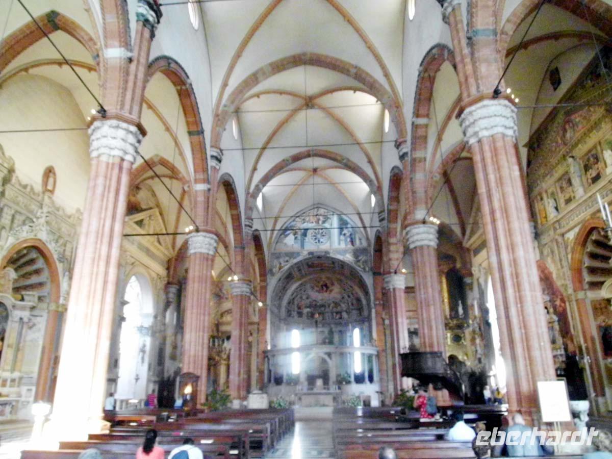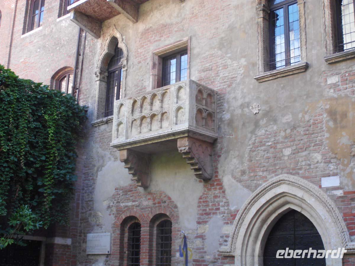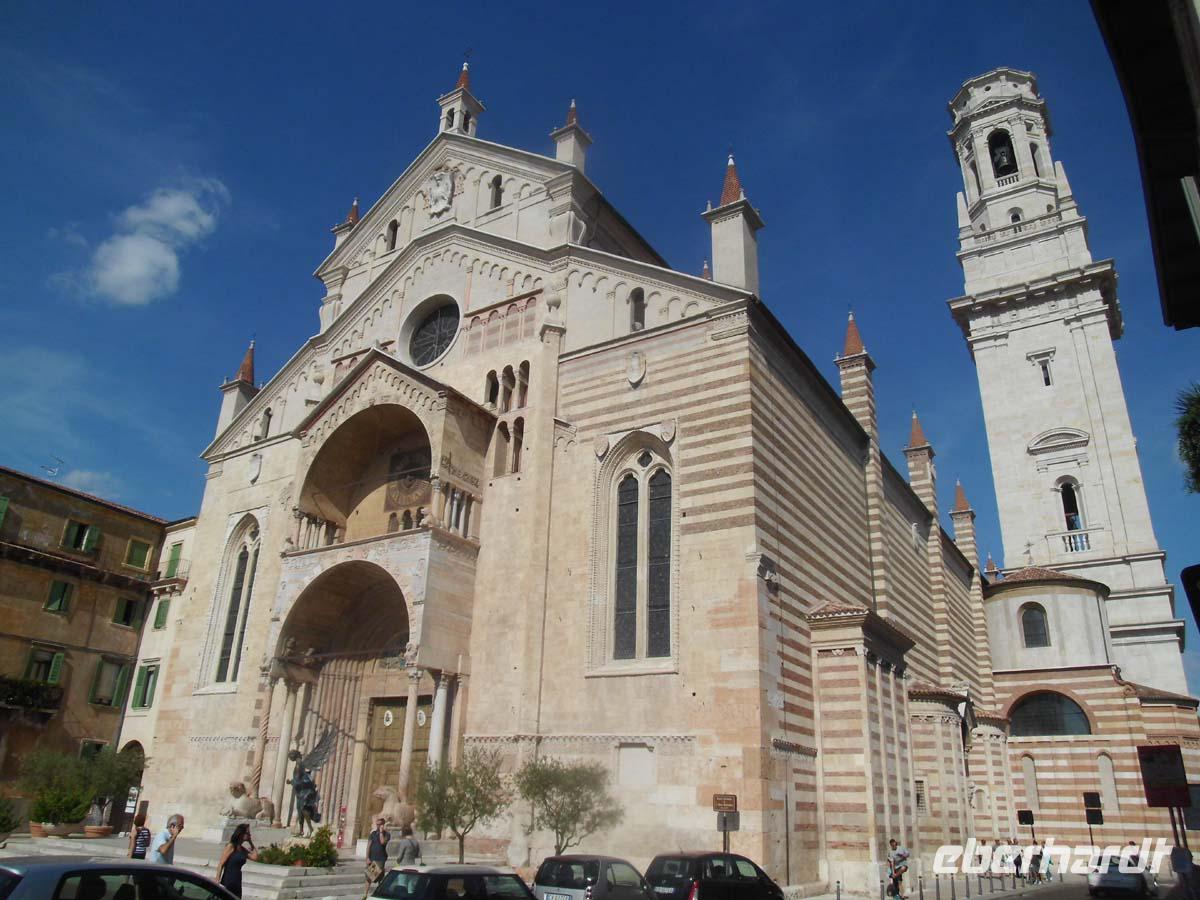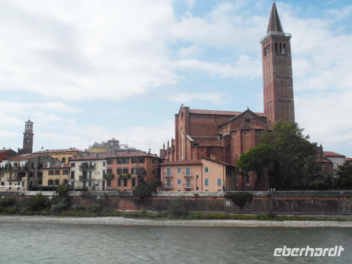Die Piazza Dante neben dem alten Markt schauen wir uns genauso an, wie die Piazza delle Erbe, dem heutigen Herz der Stadt. An ersterem liegt der Stadtpalast der Della Sacala, die 127 Jahre lang im Mittelalter die Stadt beherrschten, und sich gegenüber einen prunkvollen Privatfriedhof leisten konnten. Natürlich lassen wir die Häuser von Romeo und Julia nicht aus und beschauen uns den berühmtesten Balkon der Stadt. Unsere Führung endet an der riesigen römischen Arena, dem Amphitheater, in dem seit 1913 Opern aufgeführt werden. Aida von Verdi ist fast jedes Jahr mit dabei. Die Arena ist ca. 50 Jahre älter als das Colosseum in Rom und stammt aus dem frühen 1. Jh. Nun gilt es für die nächsten Stunden auf eigene Faust Erkundungen einzuziehen. Viele Cafes und Restaurants locken zum Verweilen. Für Kunstbeflissene ist ein Besuch des Doms lohnenswert mit einem Altargemälde von Tizian, oder aber die prächtige ehem. Dominikanerkirche Sant´ Anastasia, die einen Höhepunkt und den Schlußstein der höfischen Gotik in Italien bildet. Hier kommt es vor allem auf ein Fresko von Antonio Pisanello an, der den „Aufbruch des hl. Georg zum Kampf mit dem Drachen" zwischen 1433 und 1438 malte. Man spürt förmlich schon die heraufziehende Renaissance in diesem noch der Gotik zuzuordnenden Fresco. Verona macht einfach Lust, sich dort länger aufzuhalten.