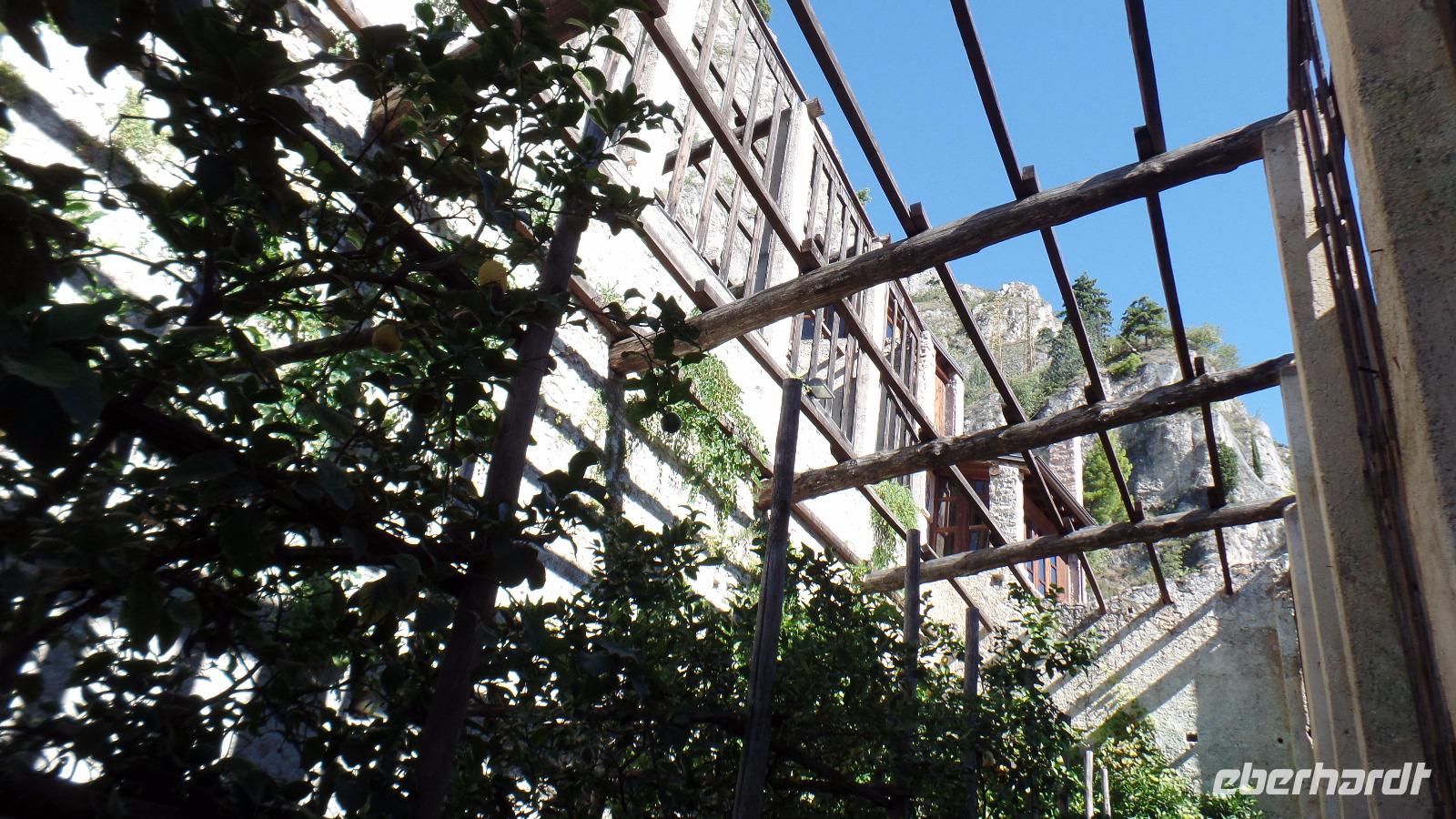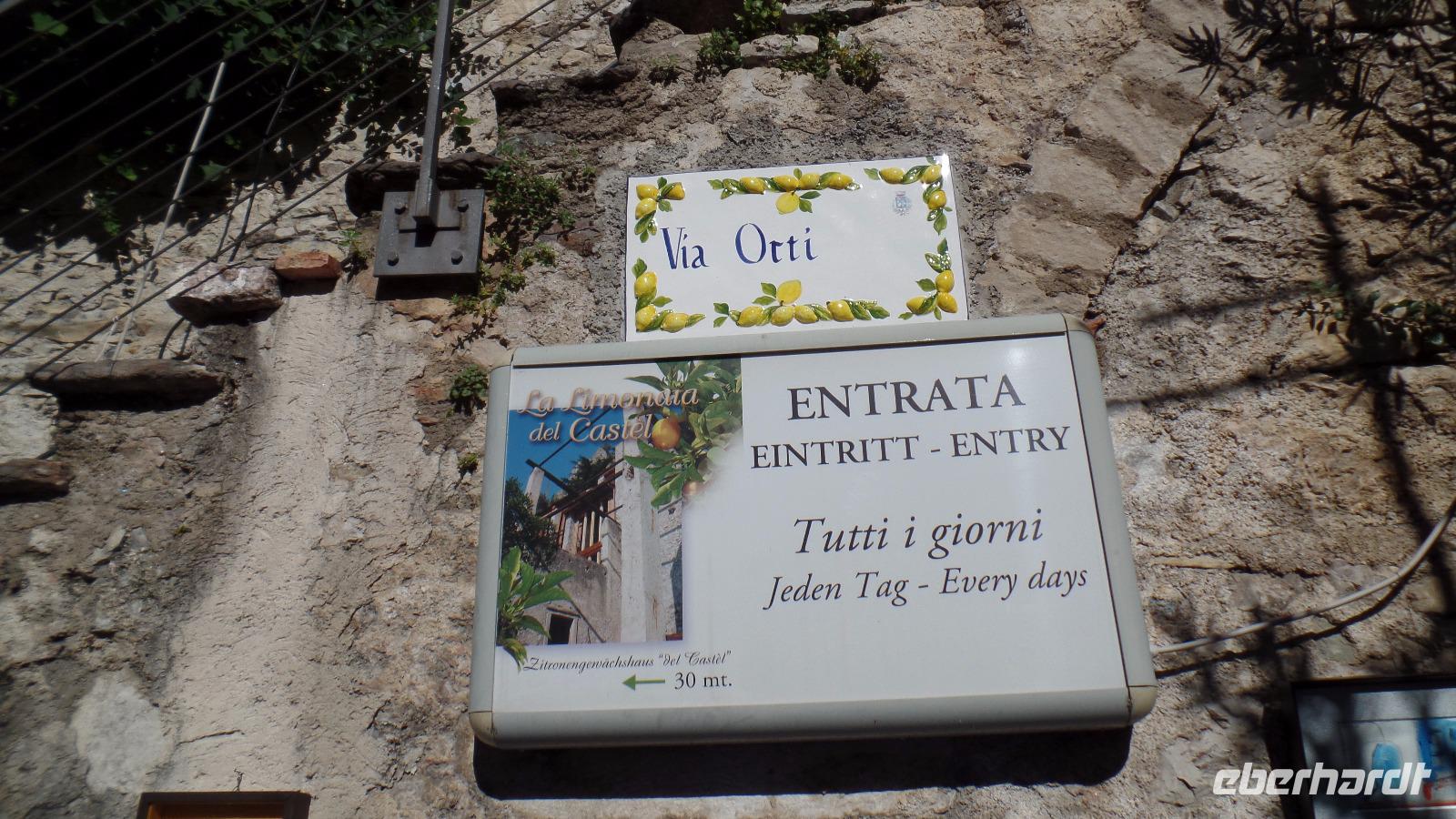 Der Bus bringt uns zum Hafen nach Riva. Weiter fahren wir mit dem Schiff über Torbole nach Limone. Eine schöne Fahrt bei herrlichem Sonnenschein über den See. Dort holt uns Franco ab, um uns die Limonaie, die Zitronengewächshäuser der Burg, zu zeigen. Wir erfahren die Geschichte dieser Anlagen in der Vergangenheit, und Vieles über die Zitrusfrüchte. Um die Bäume und Früchte vor dem Frost zu schützen, wurden ab dem 17. Jahrhundert die ersten Zitronengewächshäuser gebaut. In den Wintermonaten wurden sie mit Bretterabdeckungen und Glasscheiben verkleidet. Nachdem die Anlage in Limone verfallen war, restaurierte die Gemeinde sie liebevoll. Es wurden an die 50 unterschiedlichen Zitrusgewächse angepflanzt, die wir nun bewundern können. 2004 wurden die Limonaie der Öffentlichkeit zugänglich gemacht und sind nun ein Touristenmagnet. Natürlich verkosten wir auch die Produkte - Limoncellolikör, Bitterorangenmarmelade und Zitronencarpaccio. Lecker!