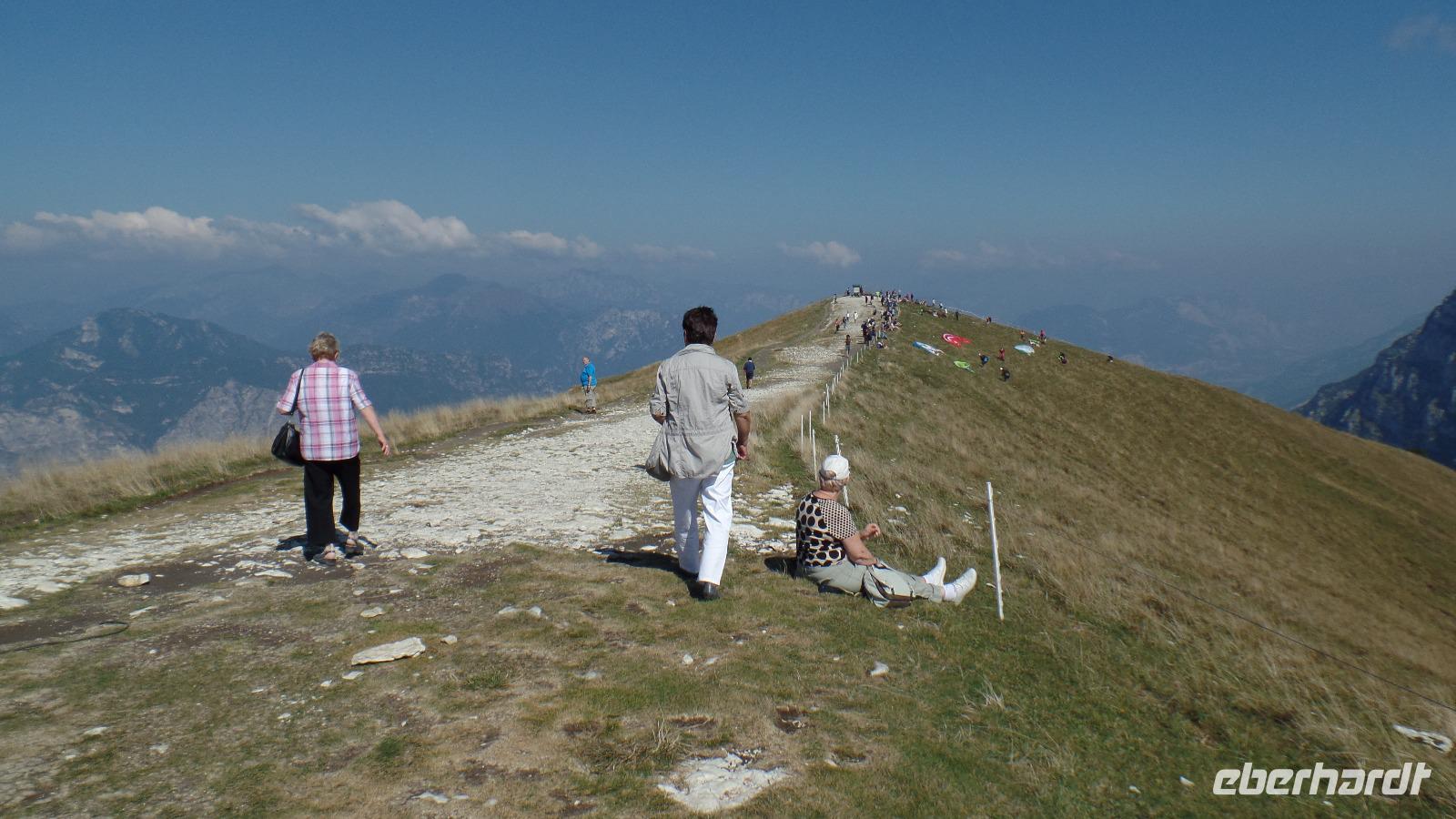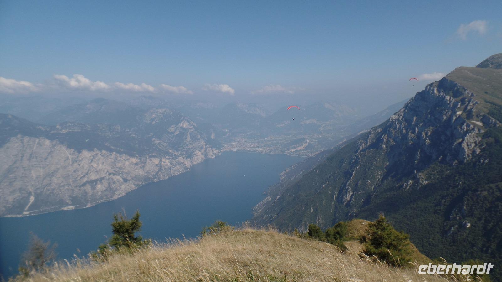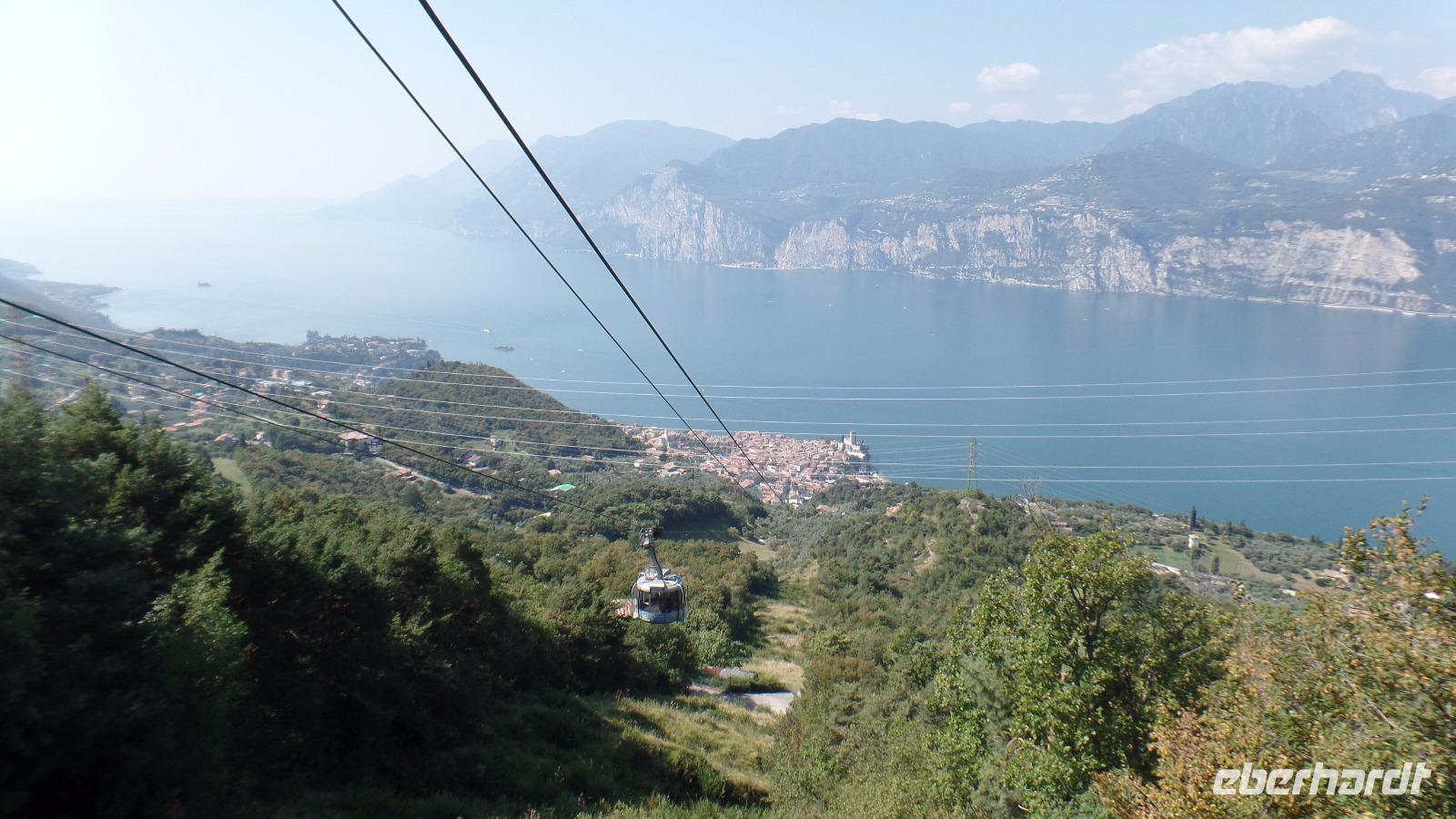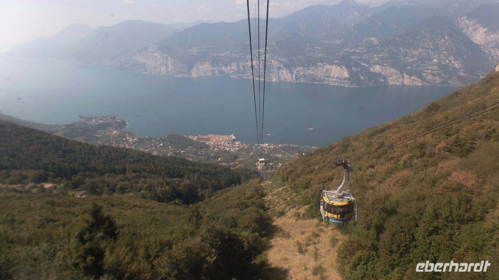 Fast alle Gäste nehmen heute am fakultativen Ausflug zum Monte Baldo teil. Unser Bus bringt uns nach Malcesine. Aber an der Seilbahn ist erst mal wieder fast eine Stunde Warten angesagt. Mit der Seilbahn fahren wir auf den Berg zur Bergstation Tratto Spino bis auf 1760 Meter. Langsam rotiert die Kabine in der zweiten Teilstrecke um 360°. Wir wandern über Grasmatten zu einem Aussichtspunkt, und genießen den herrlichen Ausblick über den See und die Berge. Der Monte Baldo wird als Botanischer Garten von Italien oder sogar von Europa bezeichnet, da hier Hunderte Pflanzen gedeihen, einige sind sogar endemisch! Allerdings ist jetzt im September keine Vielfalt mehr zu entdecken, nur noch einige Enzianblüten ragen aus den nun schon recht vertrockneten Wiesen. Interessant ist es, die Gleitschirmflieger bei ihrem Start in das unendliche Blau über dem See zu beobachten. Und es ist hier oben angenehm kühl!