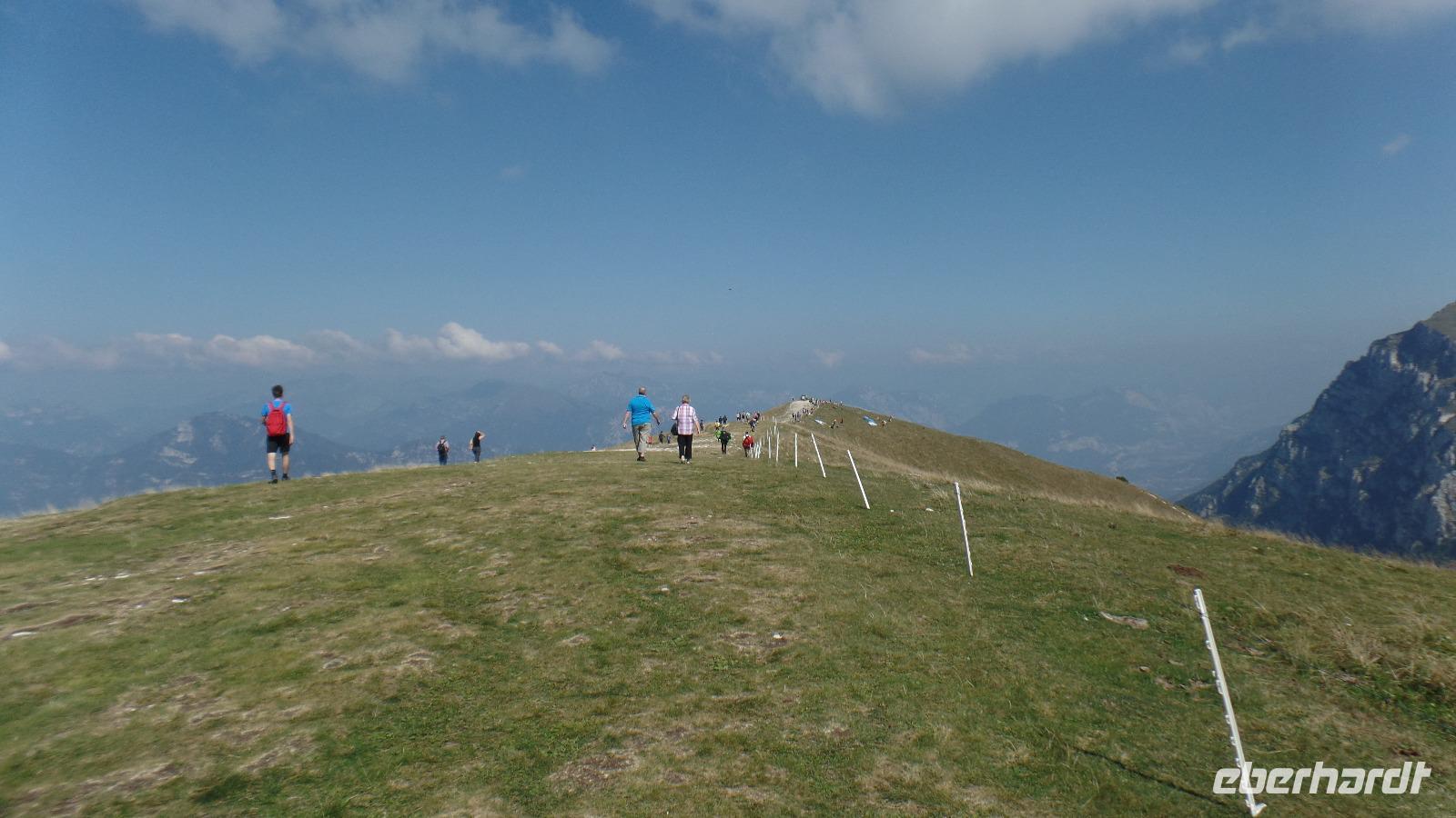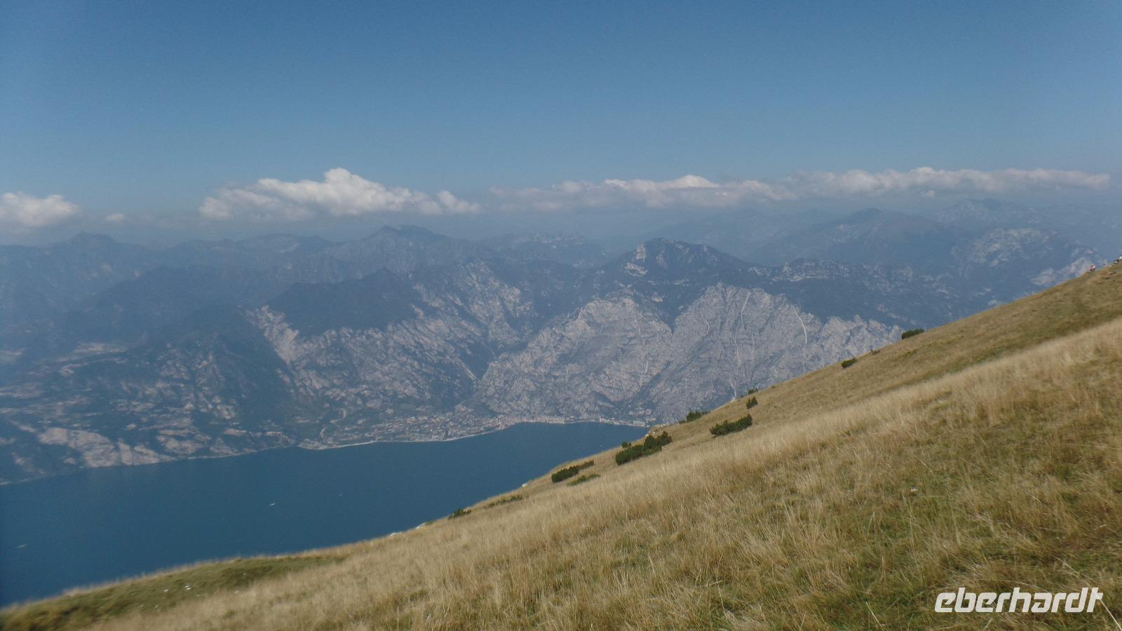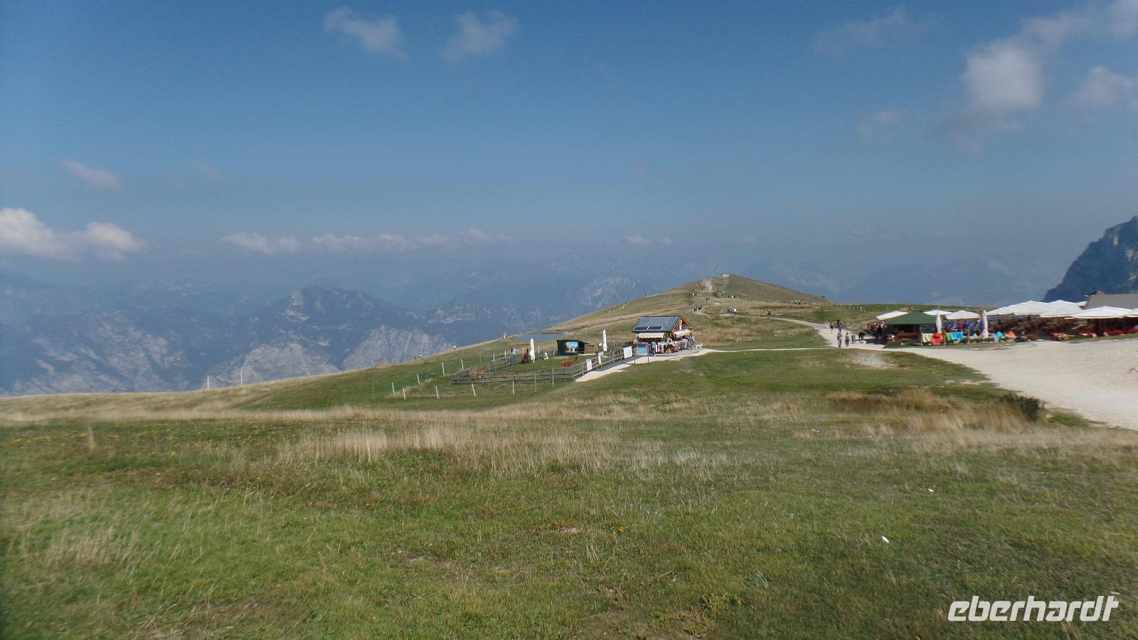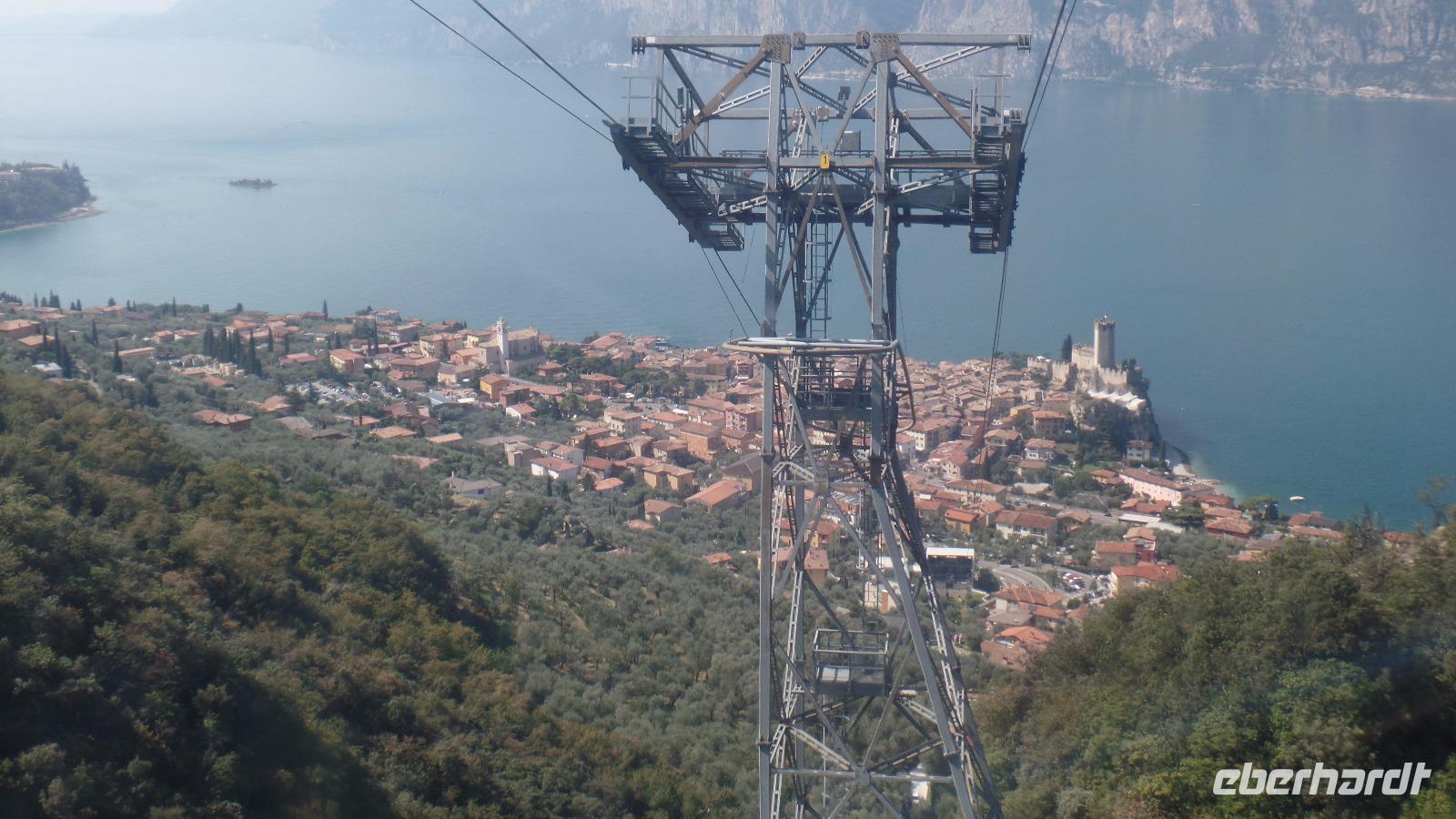 Fast alle Gäste nehmen heute am fakultativen Ausflug zum Monte Baldo teil. Unser Bus bringt uns nach Malcesine. Aber an der Seilbahn ist erst mal wieder fast eine Stunde Warten angesagt. Mit der Seilbahn fahren wir auf den Berg zur Bergstation Tratto Spino bis auf 1760 Meter. Langsam rotiert die Kabine in der zweiten Teilstrecke um 360°. Wir wandern über Grasmatten zu einem Aussichtspunkt, und genießen den herrlichen Ausblick über den See und die Berge. Der Monte Baldo wird als Botanischer Garten von Italien oder sogar von Europa bezeichnet, da hier Hunderte Pflanzen gedeihen, einige sind sogar endemisch! Allerdings ist jetzt im September keine Vielfalt mehr zu entdecken, nur noch einige Enzianblüten ragen aus den nun schon recht vertrockneten Wiesen. Interessant ist es, die Gleitschirmflieger bei ihrem Start in das unendliche Blau über dem See zu beobachten. Und es ist hier oben angenehm kühl!