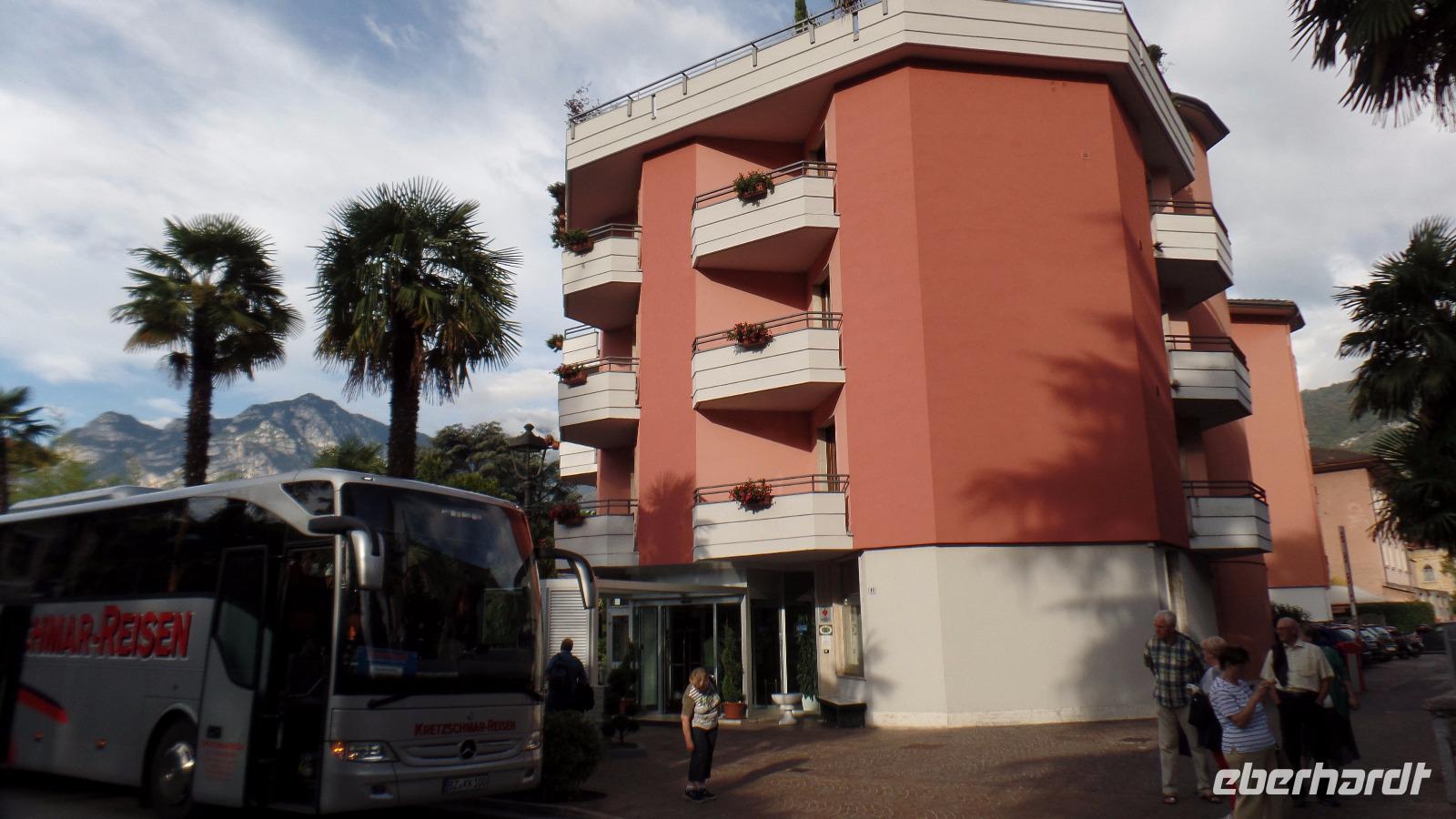 Mit einem Bus der Firma Kretzschmar starten wir morgens um Sechs in Dresden zur Fahrt nach Italien. Einige Gäste steigen noch unterwegs zu, und ab Münchberg ist unsere Gruppe von Eberhardt-Travel Dresden mit 23 Gästen komplett. Vorbei an Bayreuth, Nürnberg, München geht die Reise in die Bergwelt der Alpen. Über die Inntalautobahn und Brennerautobahn erreichen wir Italien und die Autobahn führt uns im Eisack- und Etschtal ins Trentino. In Rovereto fahren wir über den San Giovanni Pass ins Hinterland vom Gardasee nach Arco. In unserem Palace Hotel Citta kommen wir heute erst gegen 20.00 Uhr an. Immer wieder haben wir im Stau gestanden.