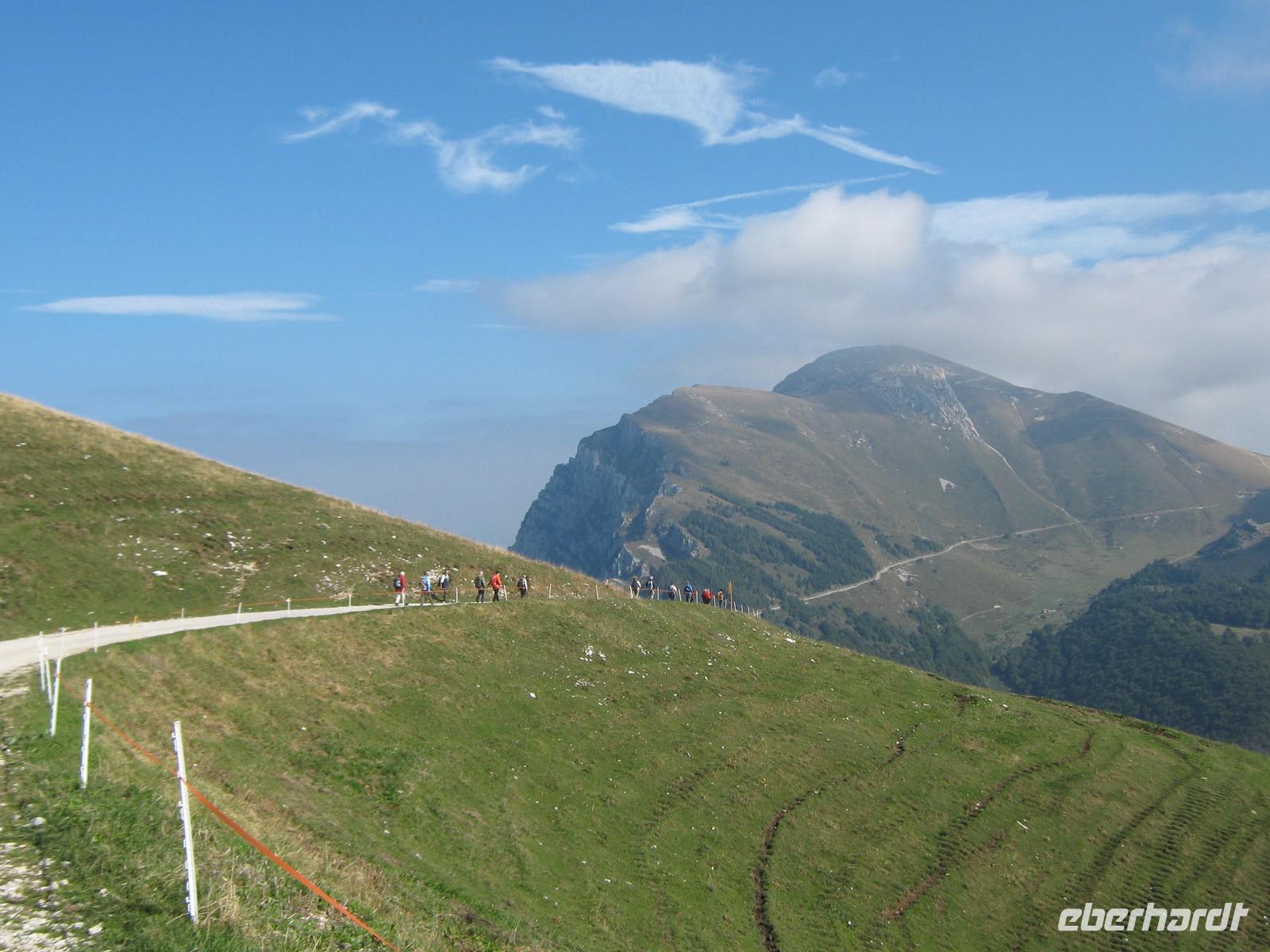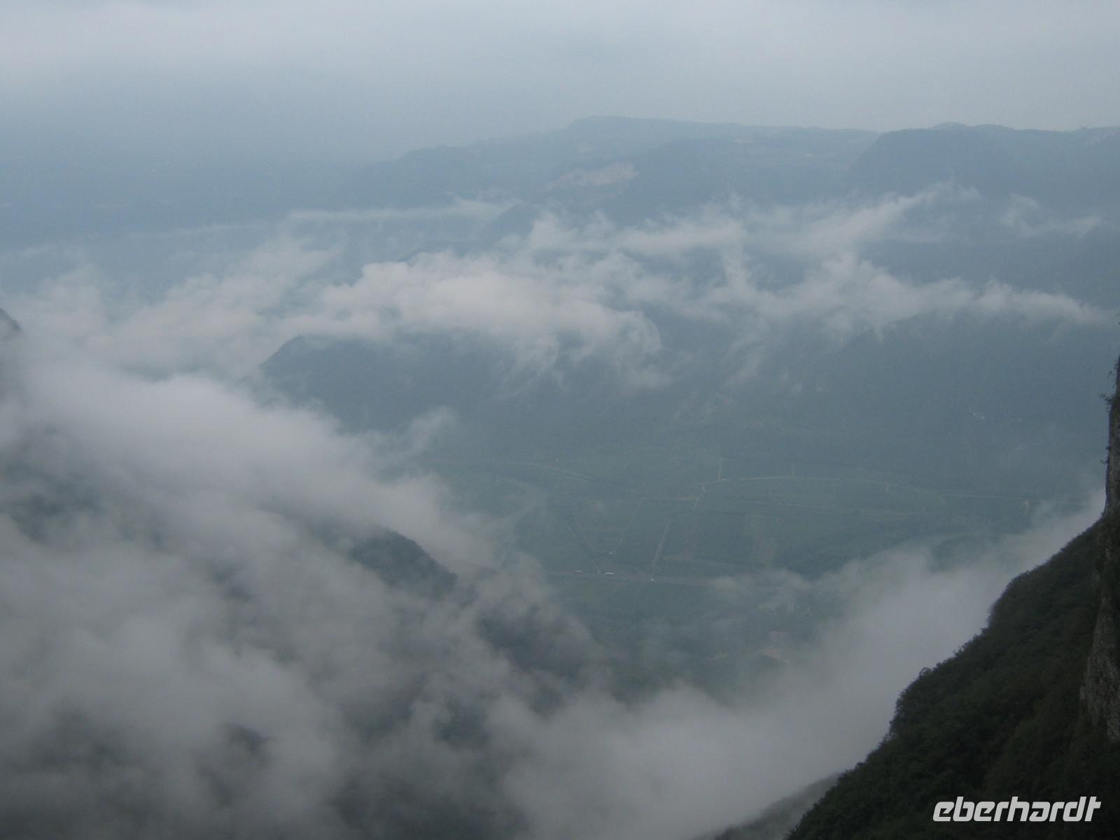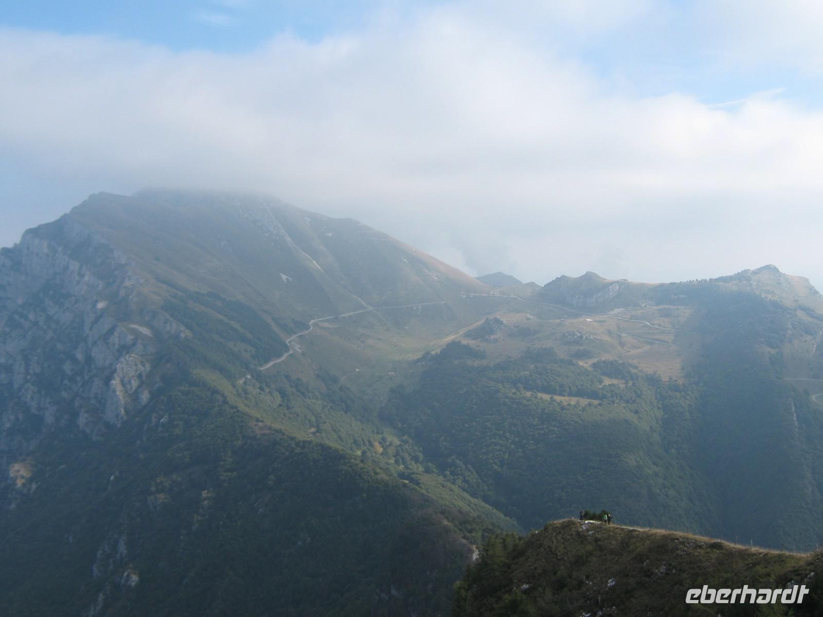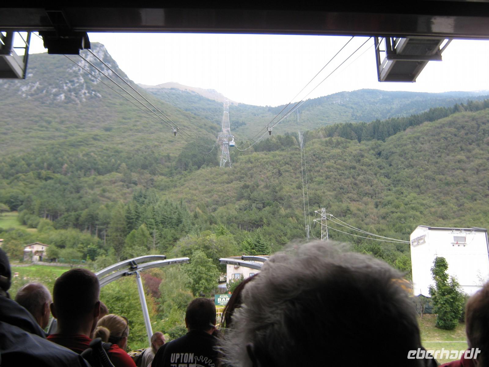 Wie angekündigt fangen wir dann auch mit dem eigentlich letzen Tag an. Stefan fährt uns bis zum Fuße des Plateaus, wo neben uns auch eine kleine Hochzeitsgesellschaft mit der Seilbahn fahren möchte. Und diese Seilbahn ist einzigartig! Einsteigen kann man nicht, man muss reinspringen, doch bei unserer sportlichen Gruppe schafft das natürlich jeder mit Bravour! Die viertelstündige Fahrt lässt uns Zeit, den Ausblick hinab zum Gardasee zu genießen. Unter uns weiden die Kühe, das Bimmeln ihrer Kuhglocken ist ein Geräusch, welches uns in den nächsten Tagen öfters begleiten wird.Oben angekommen, müssen wir dann erstmal etwas warten, sind doch auf dem Weg nach oben ein paar Wanderstücke verloren gegangen. Wie von Zauberhand hängen diese aber eine viertel Stunde später an einer der Gondeln und wir können unseren Weg beginnen. Das Tagesziel lautet Monte Telegrafo auf 2200m. Nachdem uns die Gondel schon von 1000m auf 1800m gebracht hat, können wir den ersten Teil der Strecke ohne größere Steigungen genießen, allerdings sieht man, wie der Berg langsam vom Nebel einghüllt wird. So können wir die Aussicht beim ersten Halt noch genießen, alle weiteren werden uns verwehrt und wir blicken auf eine Nebelwand. Trotzdem halten wir immermal kurz an, damit Wolfgang uns gerade die typische Fauna besser erklären kann. Wir laufen über relativ schmale Wege, je höher wir steigen desto nebliger wird es, teilweise ist der Untergrund nur Schotter und abgebrochener Stein. Nach gut 2,5 Stunden erreichen wir das Gipfelkreuz, Fotoapparate werden gezückt. Für einen kurzen Moment reißt sgoar der Nebel auf und wir erhaschen einen Blick auf den Gardasee, welcher weit unter uns liegt. An der Refugio machen wir Mittagspause, ein paar von uns bleiben draußen und essen das Lunchpaket, welches wir jeden Tag vom Hotel bekommen, die anderen gehen in die Baude hinein, wärmen sich bei Kaffee oder Tee auf. Der Rückweg gleicht dem Hinweg und mittlerweile ist der komplette Berg in Nebel gehüllt. Jeder scheint etwas in Gedanken, es ist ruhig. Erst als Wolfgang einen kleinen, allerdings etwas schwieriger zu laufenden Weg anbietet, scheinen alle wieder munter zu werden. Die Gruppe teilt sich und erst an der Seilbahnstation kommen wir wieder zusammen. Die Kälte und der Nebel haben uns zugesetzt und so beschließen wir, auch den Rückweg mit der Seilbahn zu nehmen. Unten werden wir dann von schönstem Sonnenschein begrüßt, doch ein Blick noch oben zeigt das Hochplateau immernoch in Nebel gehüllt. Letztendlich war es jedoch ein schöner erster Wandertag, welcher mit dem guten Abendessen im Hotel abgerundet wird.