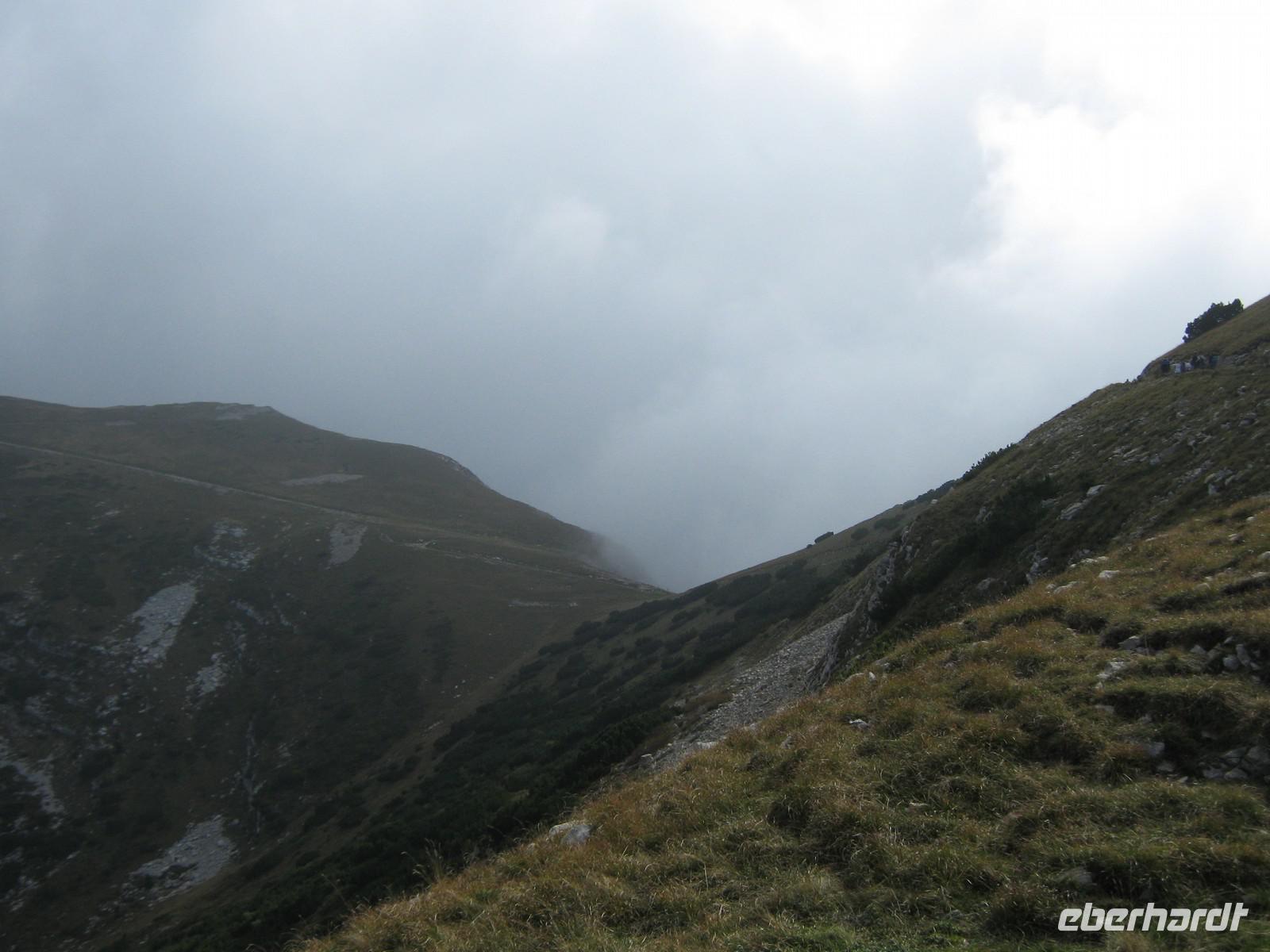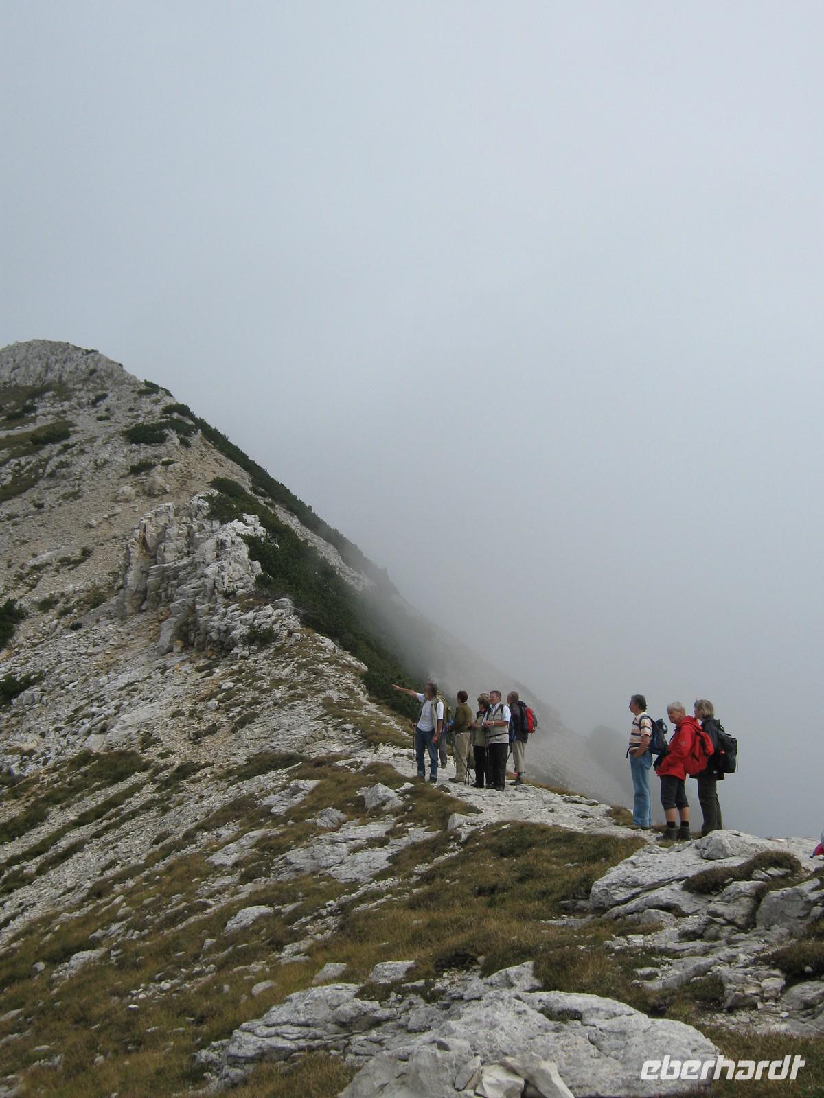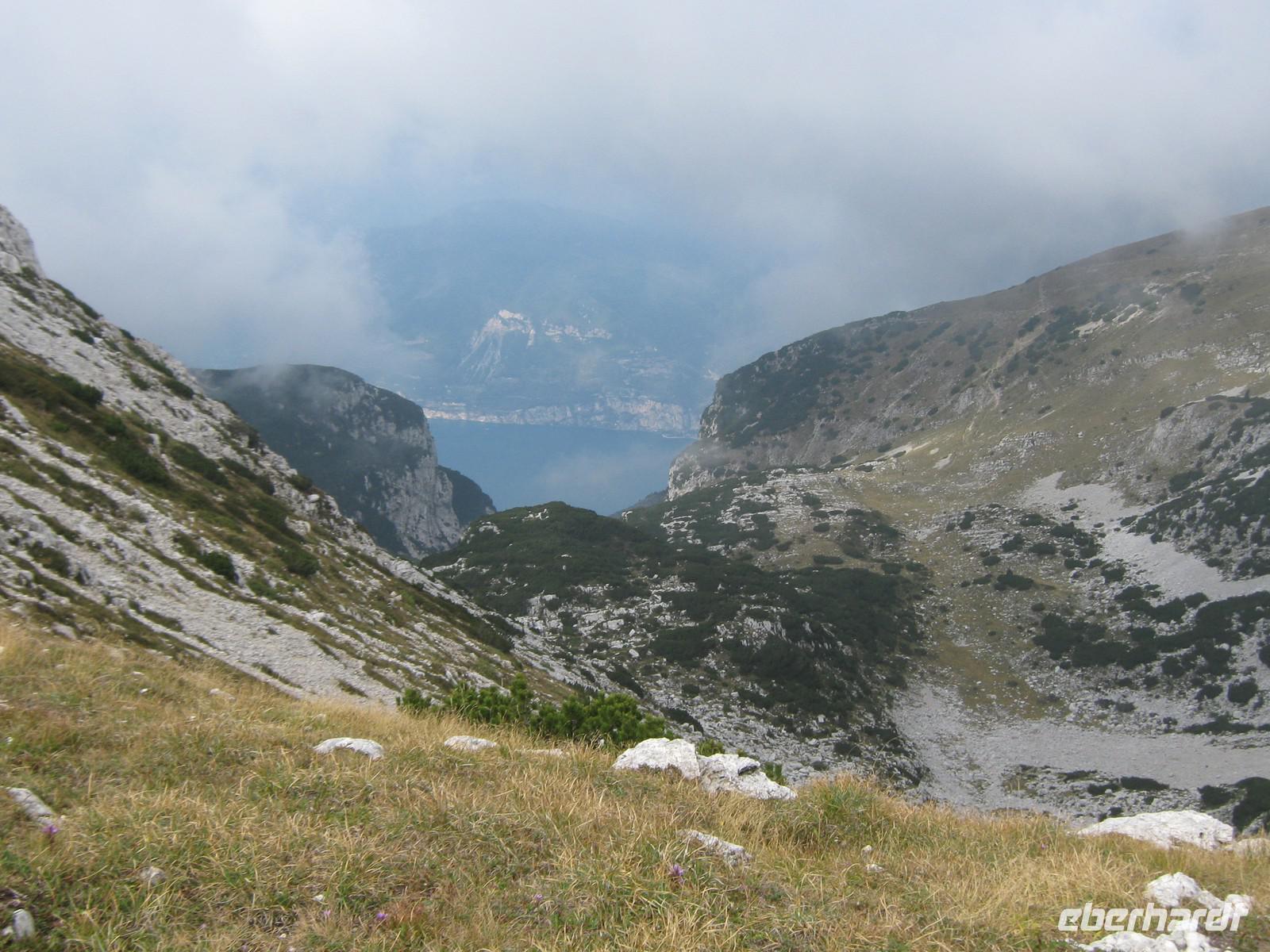 Wie angekündigt fangen wir dann auch mit dem eigentlich letzen Tag an. Stefan fährt uns bis zum Fuße des Plateaus, wo neben uns auch eine kleine Hochzeitsgesellschaft mit der Seilbahn fahren möchte. Und diese Seilbahn ist einzigartig! Einsteigen kann man nicht, man muss reinspringen, doch bei unserer sportlichen Gruppe schafft das natürlich jeder mit Bravour! Die viertelstündige Fahrt lässt uns Zeit, den Ausblick hinab zum Gardasee zu genießen. Unter uns weiden die Kühe, das Bimmeln ihrer Kuhglocken ist ein Geräusch, welches uns in den nächsten Tagen öfters begleiten wird.Oben angekommen, müssen wir dann erstmal etwas warten, sind doch auf dem Weg nach oben ein paar Wanderstücke verloren gegangen. Wie von Zauberhand hängen diese aber eine viertel Stunde später an einer der Gondeln und wir können unseren Weg beginnen. Das Tagesziel lautet Monte Telegrafo auf 2200m. Nachdem uns die Gondel schon von 1000m auf 1800m gebracht hat, können wir den ersten Teil der Strecke ohne größere Steigungen genießen, allerdings sieht man, wie der Berg langsam vom Nebel einghüllt wird. So können wir die Aussicht beim ersten Halt noch genießen, alle weiteren werden uns verwehrt und wir blicken auf eine Nebelwand. Trotzdem halten wir immermal kurz an, damit Wolfgang uns gerade die typische Fauna besser erklären kann. Wir laufen über relativ schmale Wege, je höher wir steigen desto nebliger wird es, teilweise ist der Untergrund nur Schotter und abgebrochener Stein. Nach gut 2,5 Stunden erreichen wir das Gipfelkreuz, Fotoapparate werden gezückt. Für einen kurzen Moment reißt sgoar der Nebel auf und wir erhaschen einen Blick auf den Gardasee, welcher weit unter uns liegt. An der Refugio machen wir Mittagspause, ein paar von uns bleiben draußen und essen das Lunchpaket, welches wir jeden Tag vom Hotel bekommen, die anderen gehen in die Baude hinein, wärmen sich bei Kaffee oder Tee auf. Der Rückweg gleicht dem Hinweg und mittlerweile ist der komplette Berg in Nebel gehüllt. Jeder scheint etwas in Gedanken, es ist ruhig. Erst als Wolfgang einen kleinen, allerdings etwas schwieriger zu laufenden Weg anbietet, scheinen alle wieder munter zu werden. Die Gruppe teilt sich und erst an der Seilbahnstation kommen wir wieder zusammen. Die Kälte und der Nebel haben uns zugesetzt und so beschließen wir, auch den Rückweg mit der Seilbahn zu nehmen. Unten werden wir dann von schönstem Sonnenschein begrüßt, doch ein Blick noch oben zeigt das Hochplateau immernoch in Nebel gehüllt. Letztendlich war es jedoch ein schöner erster Wandertag, welcher mit dem guten Abendessen im Hotel abgerundet wird.