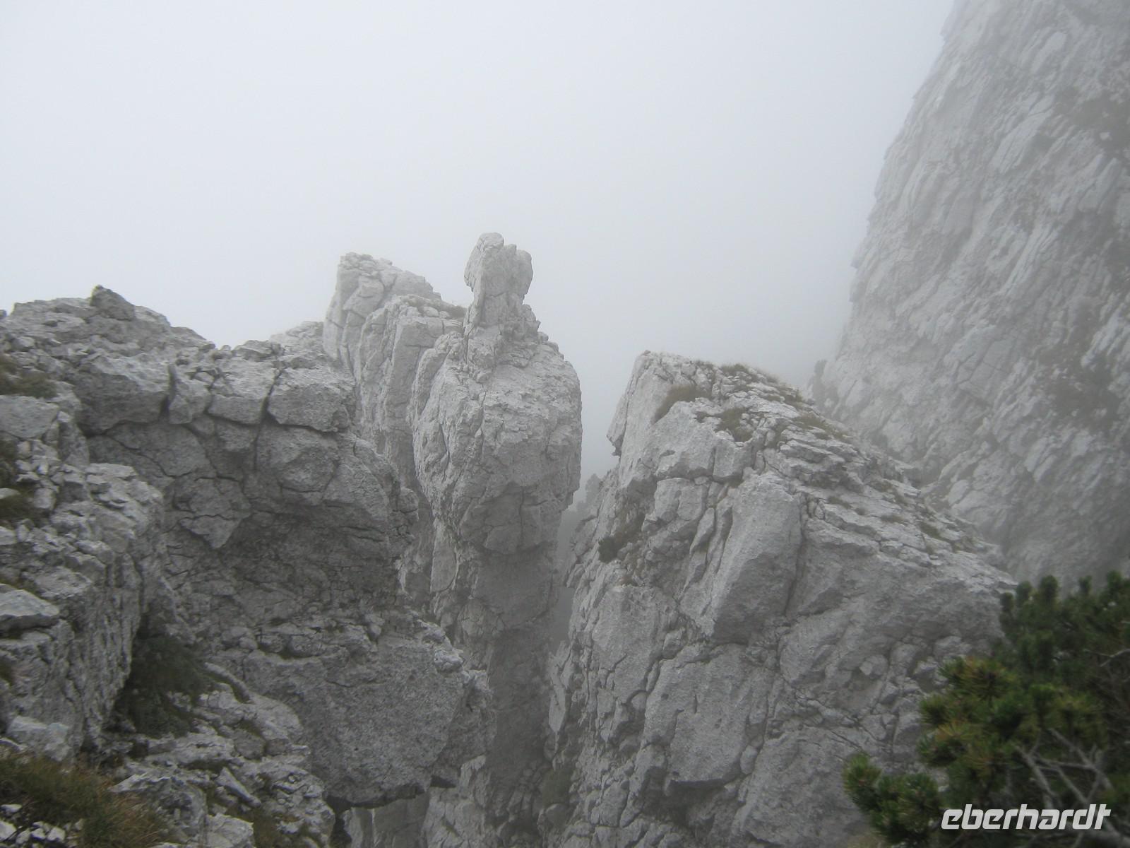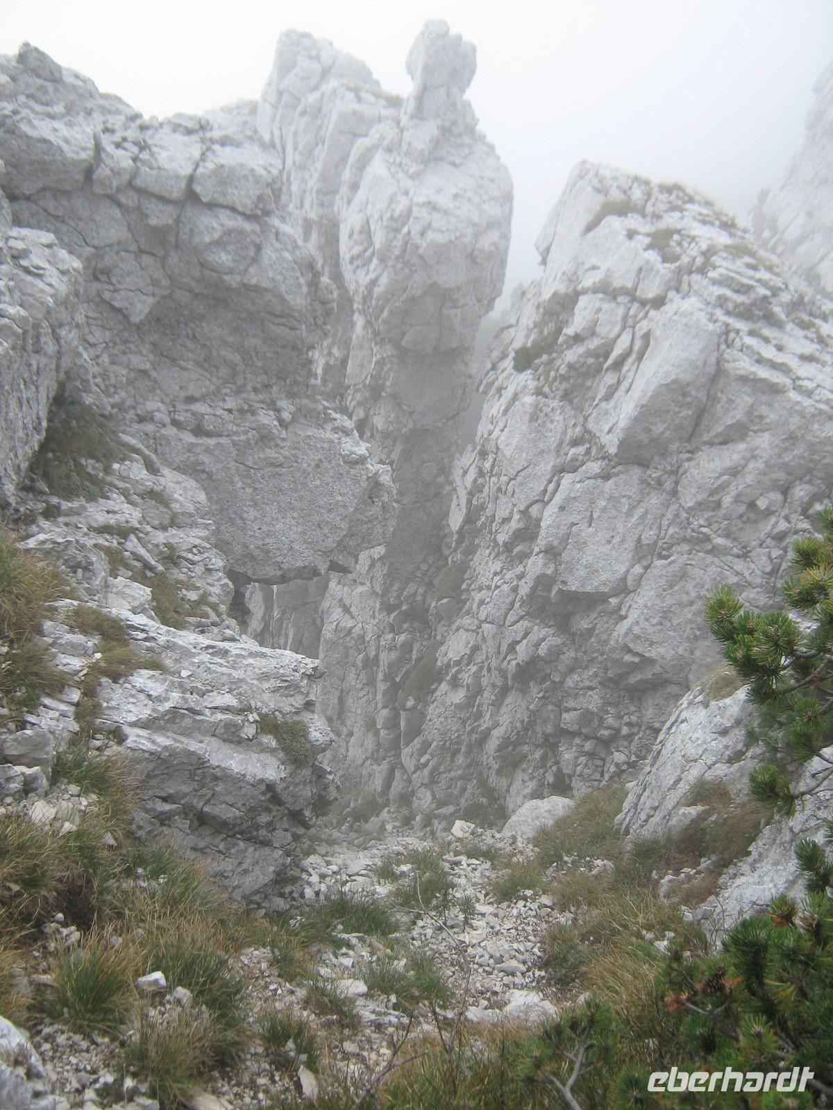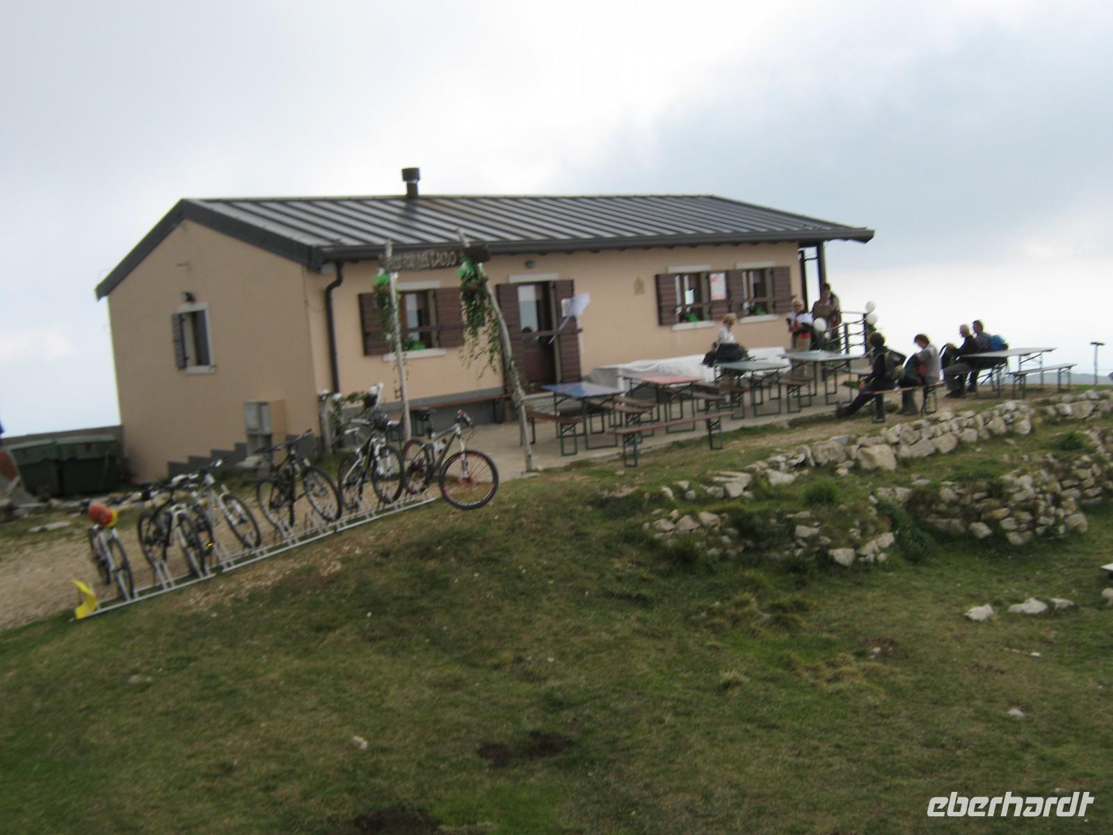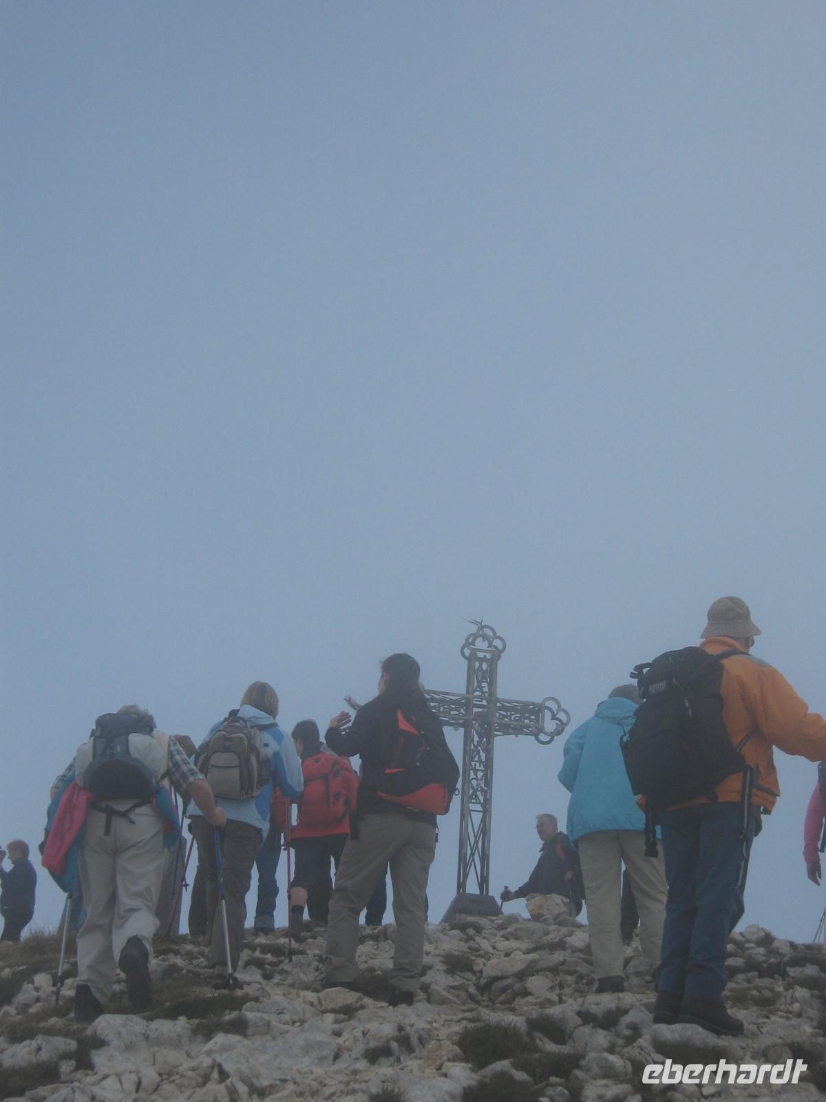 Wie angekündigt fangen wir dann auch mit dem eigentlich letzen Tag an. Stefan fährt uns bis zum Fuße des Plateaus, wo neben uns auch eine kleine Hochzeitsgesellschaft mit der Seilbahn fahren möchte. Und diese Seilbahn ist einzigartig! Einsteigen kann man nicht, man muss reinspringen, doch bei unserer sportlichen Gruppe schafft das natürlich jeder mit Bravour! Die viertelstündige Fahrt lässt uns Zeit, den Ausblick hinab zum Gardasee zu genießen. Unter uns weiden die Kühe, das Bimmeln ihrer Kuhglocken ist ein Geräusch, welches uns in den nächsten Tagen öfters begleiten wird.Oben angekommen, müssen wir dann erstmal etwas warten, sind doch auf dem Weg nach oben ein paar Wanderstücke verloren gegangen. Wie von Zauberhand hängen diese aber eine viertel Stunde später an einer der Gondeln und wir können unseren Weg beginnen. Das Tagesziel lautet Monte Telegrafo auf 2200m. Nachdem uns die Gondel schon von 1000m auf 1800m gebracht hat, können wir den ersten Teil der Strecke ohne größere Steigungen genießen, allerdings sieht man, wie der Berg langsam vom Nebel einghüllt wird. So können wir die Aussicht beim ersten Halt noch genießen, alle weiteren werden uns verwehrt und wir blicken auf eine Nebelwand. Trotzdem halten wir immermal kurz an, damit Wolfgang uns gerade die typische Fauna besser erklären kann. Wir laufen über relativ schmale Wege, je höher wir steigen desto nebliger wird es, teilweise ist der Untergrund nur Schotter und abgebrochener Stein. Nach gut 2,5 Stunden erreichen wir das Gipfelkreuz, Fotoapparate werden gezückt. Für einen kurzen Moment reißt sgoar der Nebel auf und wir erhaschen einen Blick auf den Gardasee, welcher weit unter uns liegt. An der Refugio machen wir Mittagspause, ein paar von uns bleiben draußen und essen das Lunchpaket, welches wir jeden Tag vom Hotel bekommen, die anderen gehen in die Baude hinein, wärmen sich bei Kaffee oder Tee auf. Der Rückweg gleicht dem Hinweg und mittlerweile ist der komplette Berg in Nebel gehüllt. Jeder scheint etwas in Gedanken, es ist ruhig. Erst als Wolfgang einen kleinen, allerdings etwas schwieriger zu laufenden Weg anbietet, scheinen alle wieder munter zu werden. Die Gruppe teilt sich und erst an der Seilbahnstation kommen wir wieder zusammen. Die Kälte und der Nebel haben uns zugesetzt und so beschließen wir, auch den Rückweg mit der Seilbahn zu nehmen. Unten werden wir dann von schönstem Sonnenschein begrüßt, doch ein Blick noch oben zeigt das Hochplateau immernoch in Nebel gehüllt. Letztendlich war es jedoch ein schöner erster Wandertag, welcher mit dem guten Abendessen im Hotel abgerundet wird.