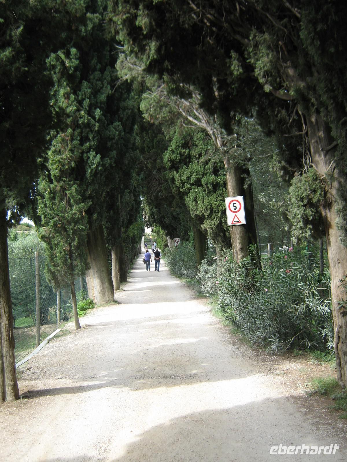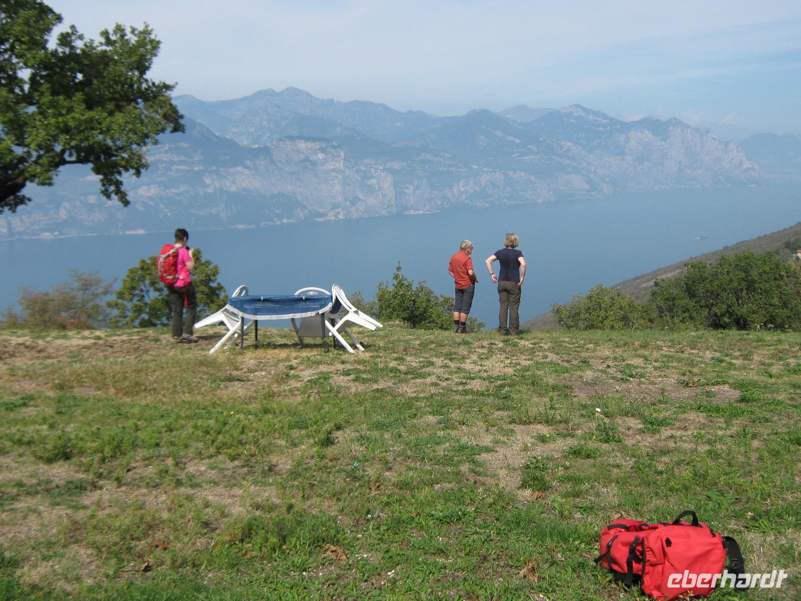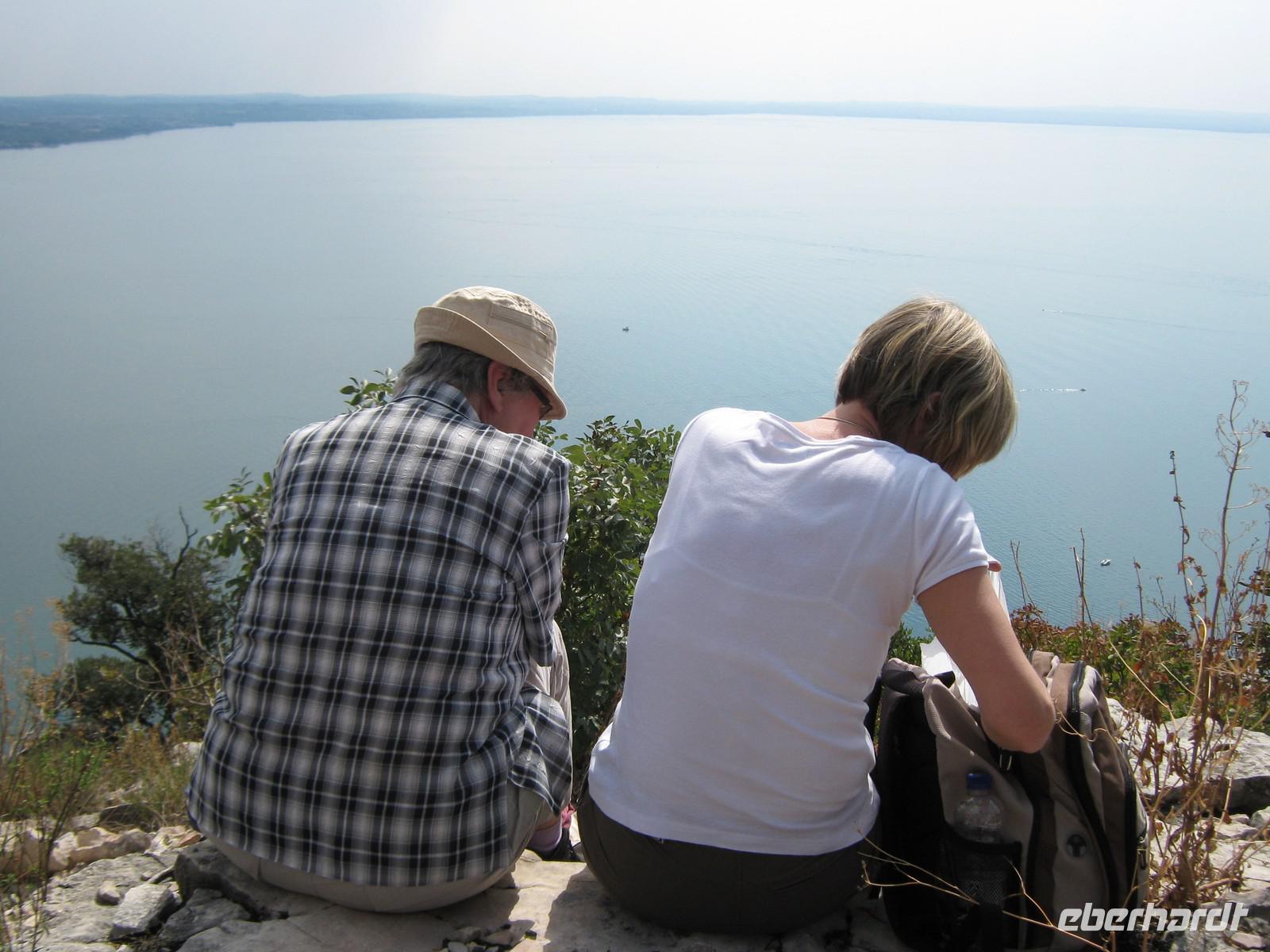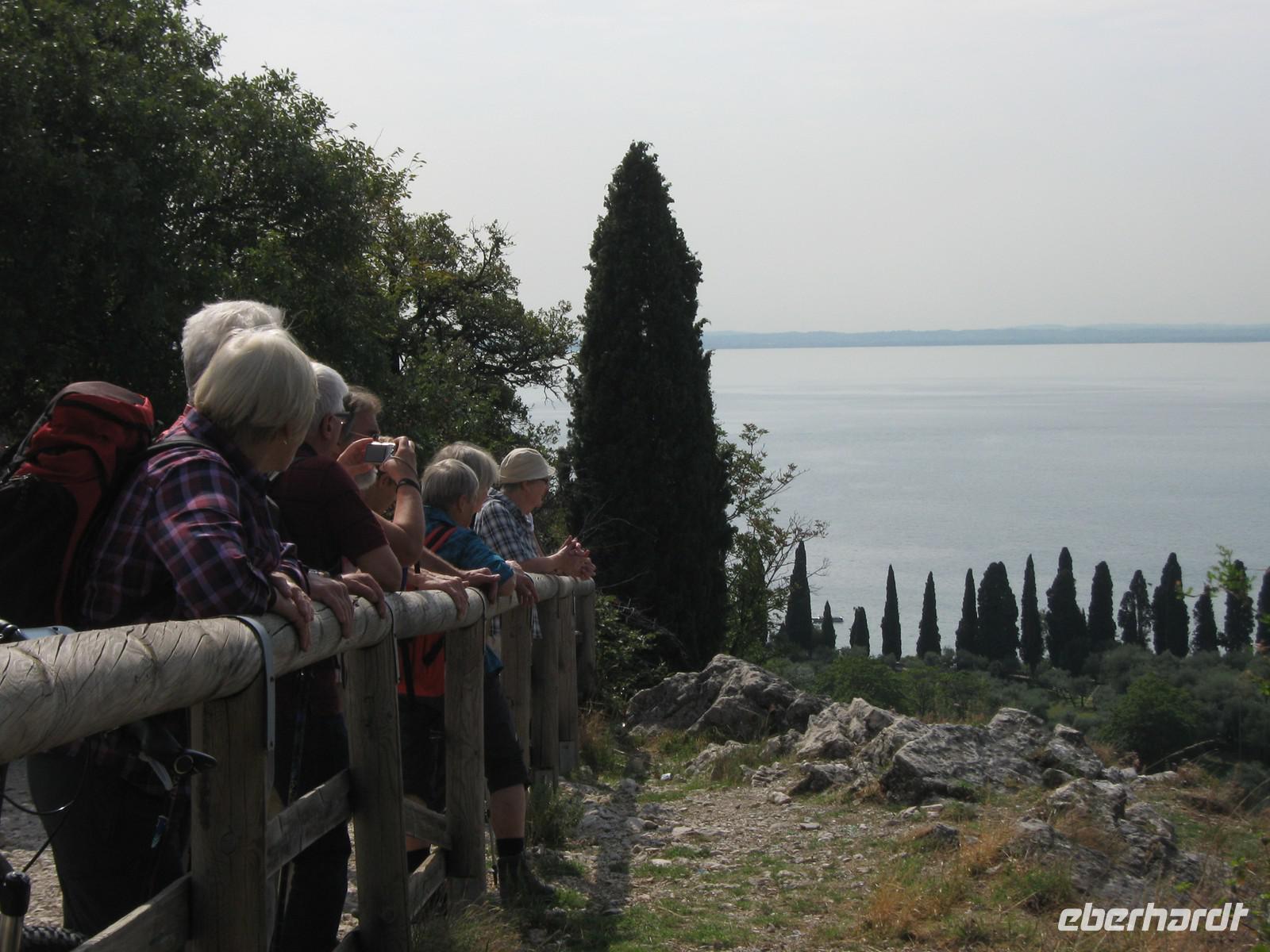 Wir fahren mit dem Bus ein kurzes Stück Richtung Garda und halten unterhalb des Hausberges der Stadt. Der Weg auf den Rocca gleicht eher einem Spaziergang. Wir halten auf halber Höhe und blicken ins Hinterland und hinunter ins Tal. Weit hinten zeigt Wolfgang auf den Monte delle Erbe, ein weiteres Ziel unserer Wanderwoche. Oben angekommen sieht es eher aus wie in einem wilden Garten, wir genießen den Blick hinab auf Garda und den grandiosen Ausblick über den See.Nach einer kleinen Runde kehren wir zum Bus zurück, machen uns auff zur nächsten Tagesetappe. Bevor wir jedoch den Monte Luppia in Angriff nehmen, verweilen wir in San Vigilio. Durch eine Zypressenallee gelangen wir zu einem herrschaftlichen Anwesen, luken neugierig durch die Gitter in den Innenhof. Wir spazieren zu der kleinen anliegenden Bucht, laufen vor zum Steg und und genießen die leichte Brise, bevor Wolfgang uns zum Aufbruch mahnt, schließlich sind wir doch zum Wandern hier! Wir schlendern zurück, überqueren todesmutig die Straße und finden uns prompt auf einem kleinen Olivenhain wieder und stehen, wie wir von Wolfgang erfahren, am Fuße des Monte Luppia. Der Weg hinauf ist angenehm zu laufen, es ist schattig und eine ganze Zeit lang begegnet uns kein Mensch. Erst an einem Aussichtspunkt sind wir nicht mehr allein, ein paar Radler fahren an uns vorbei. Riesige Steineichen wachsen nun links und rechts am Wegesrand. Wolfgang zeigt uns alte Steinzeichnungen, Rocca di Giselle, und führt uns immer weiter nach oben. Pünktlich zum Mittag überrascht uns wieder eine traumhafte Aussicht, wir holen unser Lunchpaket aus dem Rucksack und rasten. Uns wird bewusst, dass wir genau für solche Momente wandern!