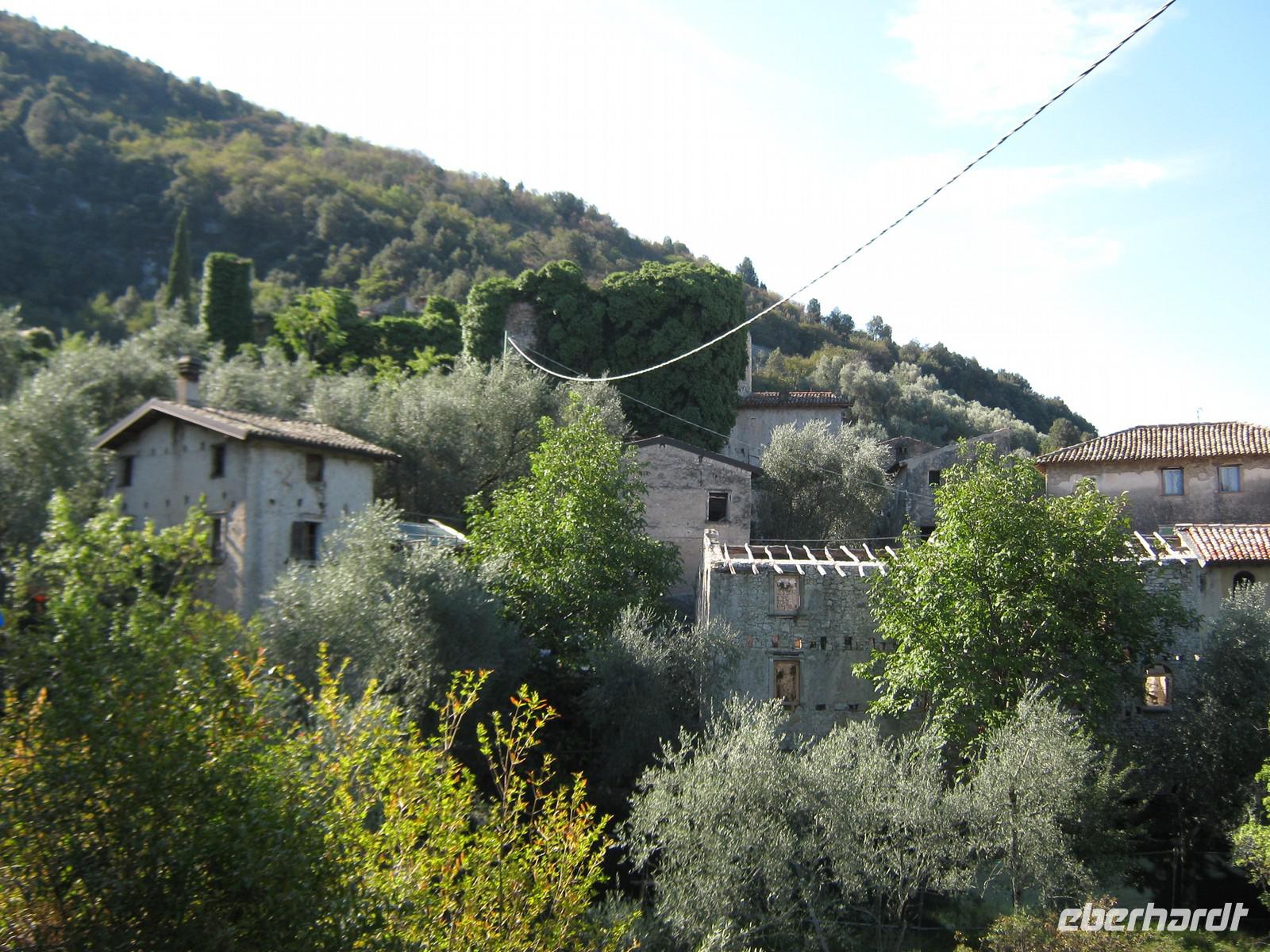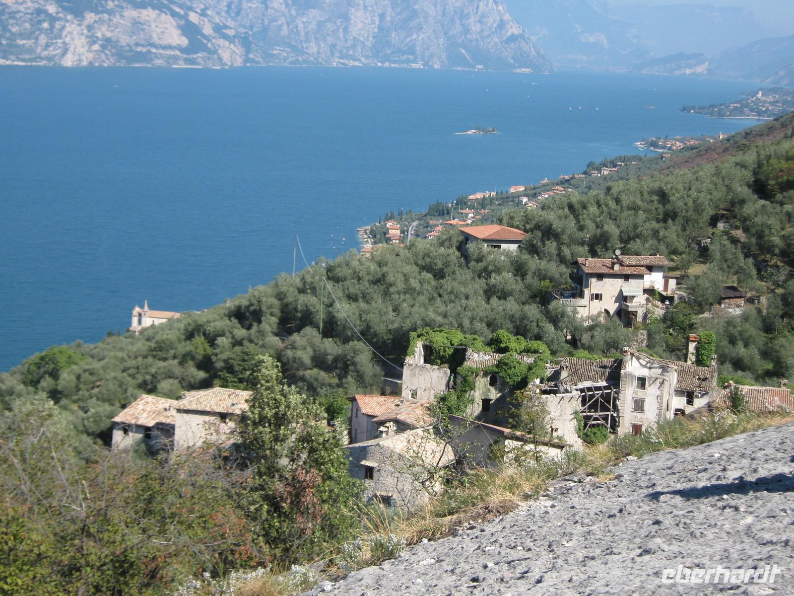 Am Morgen schauen wir auf Napoleons Nase und - sie ist frei. Beste Voraussetzungen also für einen erneut wunderschönen Wandertag. Wir starten heut anfangs ohne Wolfgang und sammeln ihn unterwegs in der Nähe seines Heimatortes ein. Mit 4 Gastwanderern starten wir auf alten Eselspfaden nach Campo, einem Dorf, welches aufgrund fehlender Arbeit und auch der Abgeschiedenheit über die Jahre alle Einwohner verloren hat. Immer, wenn wir uns umdrehen, können wir die grandiose Aussicht auf den Gardasee genießen. Campo erscheint dann eher verwunschen als verlassen. An den alten Häuserwänden rankt der Efeu herunter, überall hängen alte Spinnenweben. Im Inneren der Häuser ist vieles verstaubt. In einem Haus betreiben 2 Frauen noch einen kleinen Kiosk, extra für vorbei laufende Wanderer. Die Kapelle im Dorf zeigt dann aber auch die Spuren der Jahre. Wolfgang, der sich schon mehrere Jahre um den Erhalt und die Rekonstruktion des Dorfes bemüht, erzählt von Tagen, wo die Wandmalereien noch mehr als deutlich waren. Unsere Wanderung führt uns weiter und mit fortlaufender Zeit immer weiter bergan. Wir erreichen Le Ca, machen auf dem Privatgrundstück eines Freundes von Wolfgang Picknick, genießen Sonne, Aussicht und - nach dem doch etwas anstrengenderen Anstieg - die Pause. Der weitere Weg führt uns entlang an Esskastanien-Plantagen, viele davon befallen durch die Miniermotte und dadurch arg zurückgeschnitten. Wir laufen jetzt immer leicht bergab, Wolfgang weist immer auf die Besonderheiten des Weges hin - alte Mauern oder auch Kalköfen, auf jeden Fall immer interessant. Im Restaurant "Alla Fassa" machen wir erneut eine Pause, belohnen uns mit einem kühlen Bier oder einem Kaffee und lassen uns von der Nachmittags-Sonne verwöhnen. Wir nähern uns Casteletto, halten kurz am Dorfplatz und bestaunen wunderschöne Bougainvillea. Angekommen am Ufer des Gardasees müssen wir dann leider noch etwas warten, ehe unser Busfahrer uns abholt und wieder sicher zum Hotel bringt.