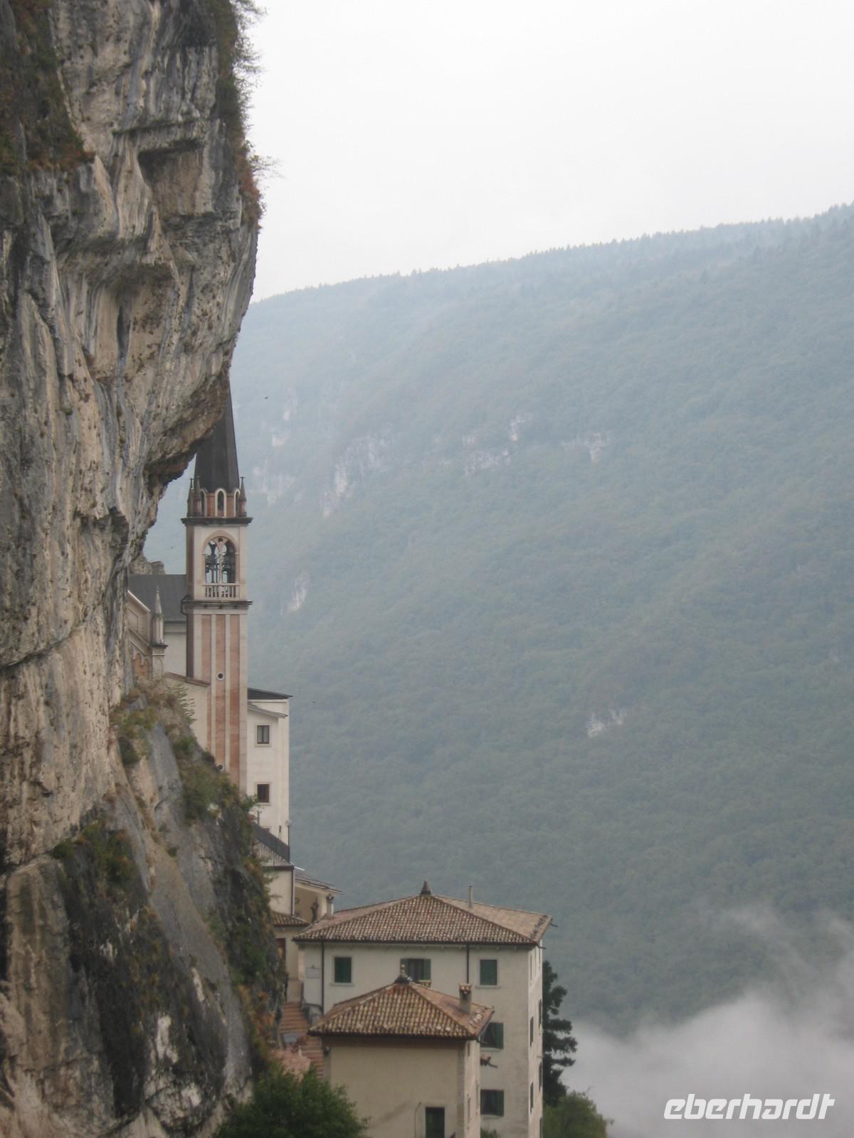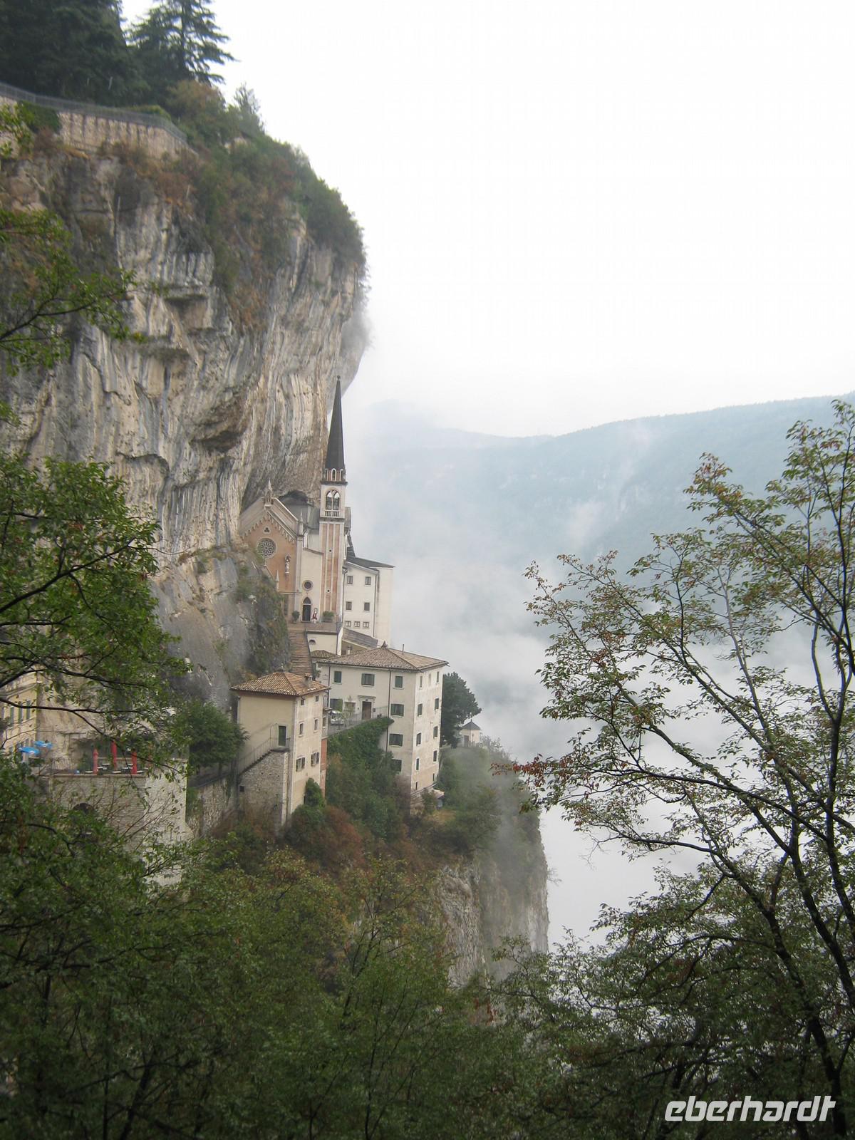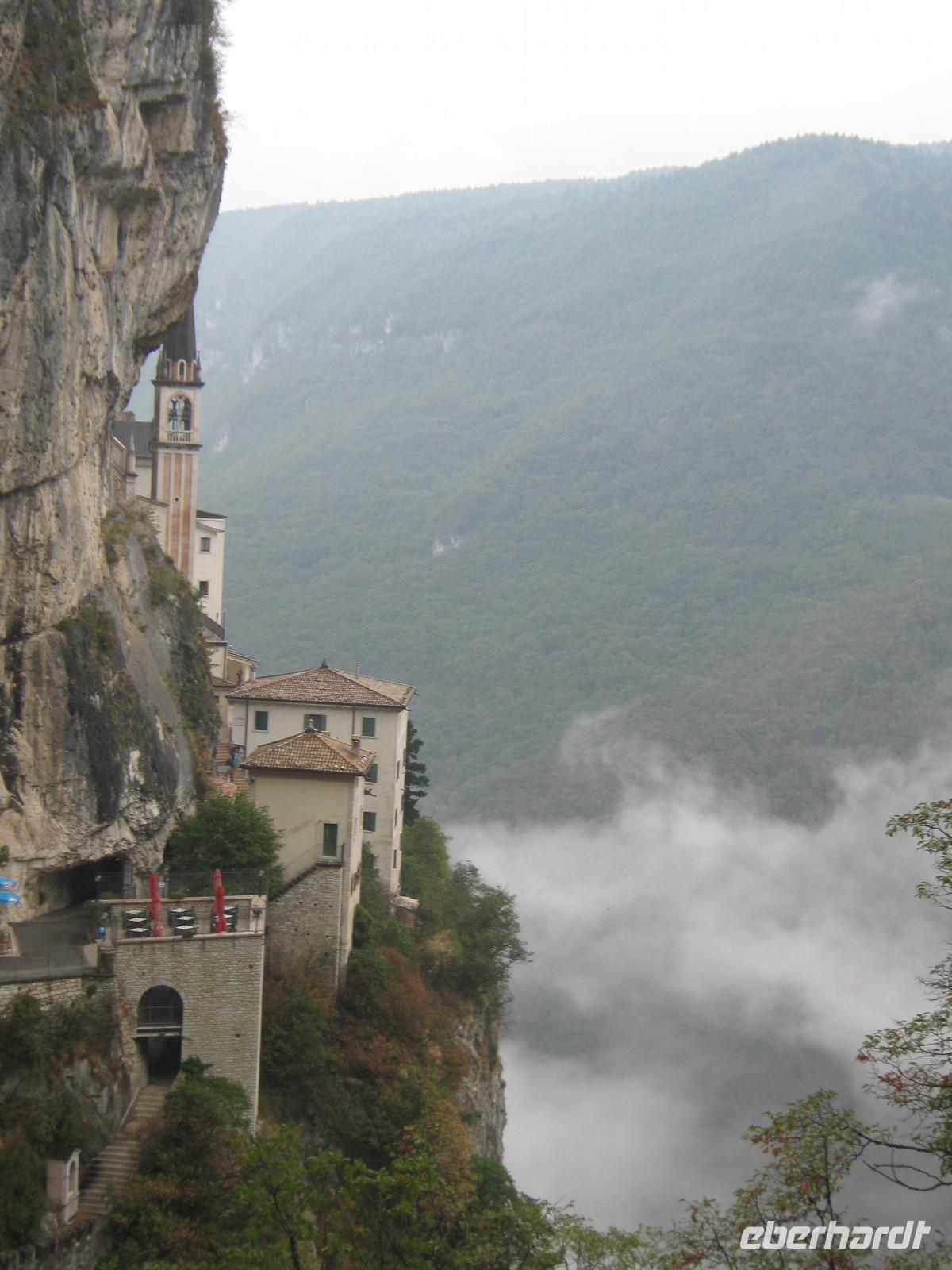 Nachdem wir uns alle wieder etwas aufgewärmt haben und auch etwas trockner sind, nehmen wir trotz allem noch den zweiten Tagesausflug m Angriff - die Wallfahrtskirche Madonna della Corona. Wir fahren die gleiche Straße, die wir hinauf gefahren sind, wieder zurück. Diesmal halten wir in Spiazza an einem kleinen Parkplatz an, um die kurzen Weg hinab zur Kapelle zu laufen. Aufgrund der allgemeinen Wetterlage entscheidet sich ein Teil von uns, doch im Bus zu bleiben und sich lieber etwas aufzuwärmen. Der andere Teil begibt sich auf den Weg, welcher gesäumt ist von Statuen aus Bronze, die die Passion Christi darstellen. Die kurzen Augenblicke, in denen wir durch die Wolken und den Nebel ins Etschtal blicken können sind atemberaubend. Genauso könnte man auch den Bau der Wallfahrtskirche nennen. Sie sieht aus wie aus dem Fels gehauen, als schwiege sie sich an der Berg. Im Inneren besticht die Kirche mit ihrer Schlichtheit, kaum etwas ist zu sehen von dem Prunk, den viele andere Kirche in sich haben. Wir genießen die Ruhe.