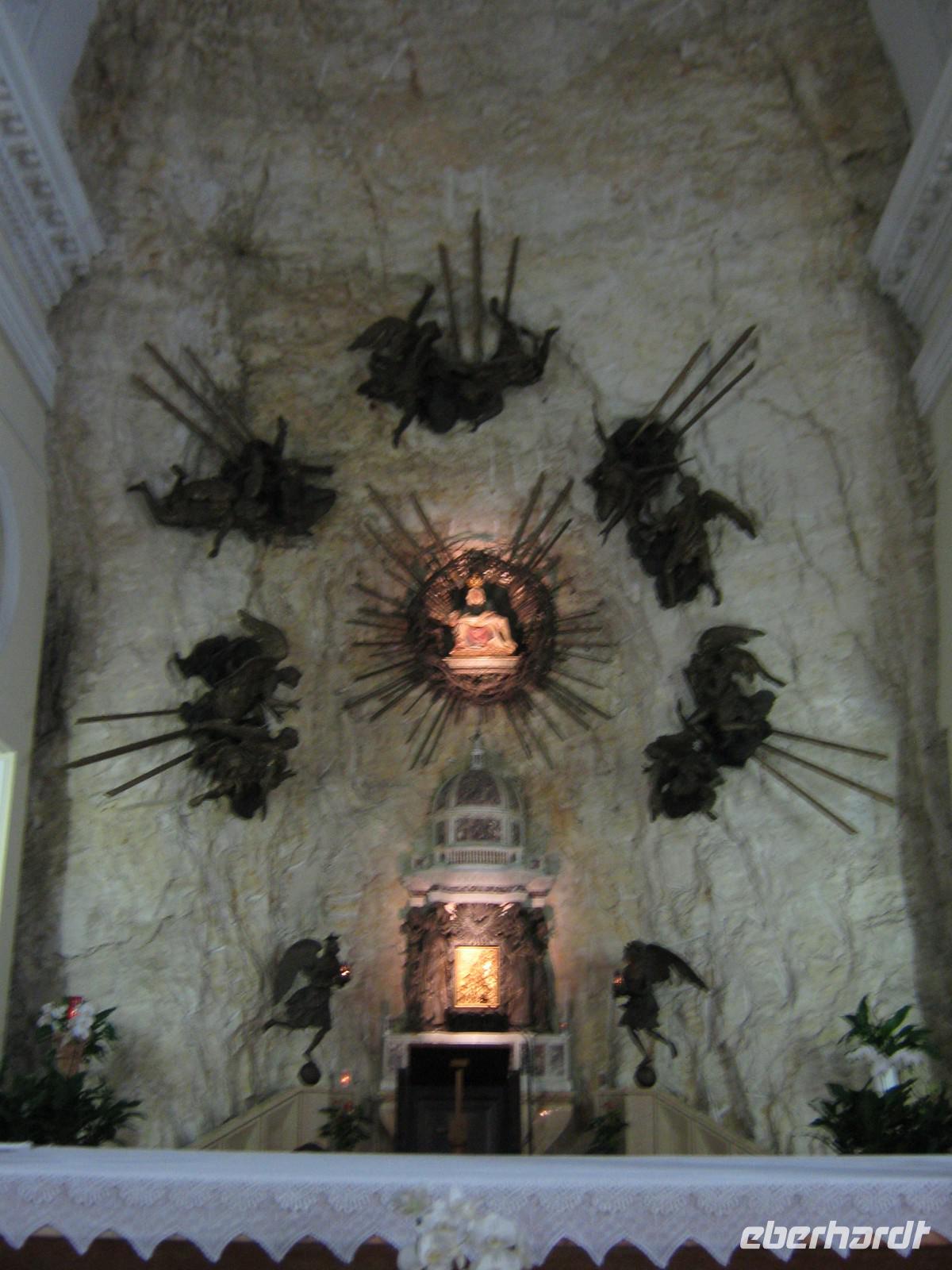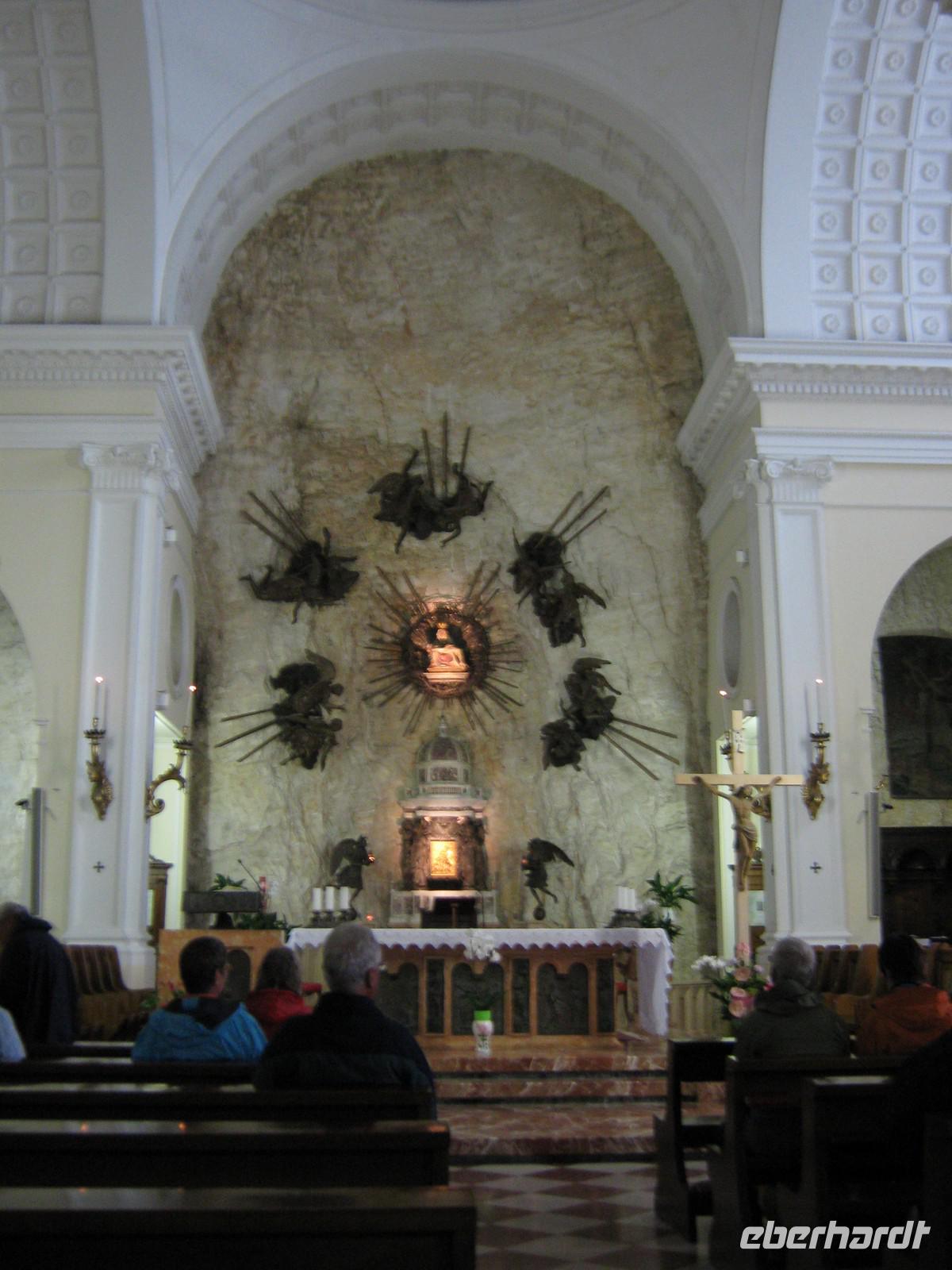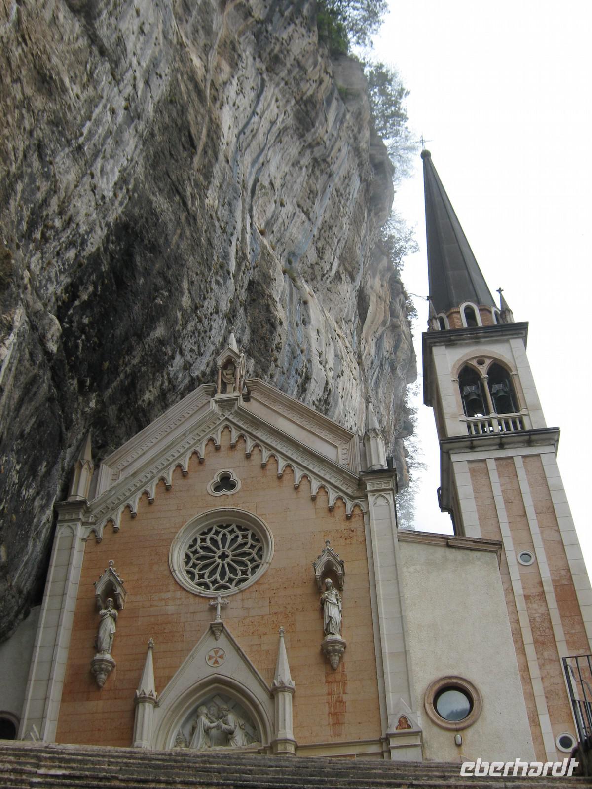 Nachdem wir uns alle wieder etwas aufgewärmt haben und auch etwas trockner sind, nehmen wir trotz allem noch den zweiten Tagesausflug m Angriff - die Wallfahrtskirche Madonna della Corona. Wir fahren die gleiche Straße, die wir hinauf gefahren sind, wieder zurück. Diesmal halten wir in Spiazza an einem kleinen Parkplatz an, um die kurzen Weg hinab zur Kapelle zu laufen. Aufgrund der allgemeinen Wetterlage entscheidet sich ein Teil von uns, doch im Bus zu bleiben und sich lieber etwas aufzuwärmen. Der andere Teil begibt sich auf den Weg, welcher gesäumt ist von Statuen aus Bronze, die die Passion Christi darstellen. Die kurzen Augenblicke, in denen wir durch die Wolken und den Nebel ins Etschtal blicken können sind atemberaubend. Genauso könnte man auch den Bau der Wallfahrtskirche nennen. Sie sieht aus wie aus dem Fels gehauen, als schwiege sie sich an der Berg. Im Inneren besticht die Kirche mit ihrer Schlichtheit, kaum etwas ist zu sehen von dem Prunk, den viele andere Kirche in sich haben. Wir genießen die Ruhe.