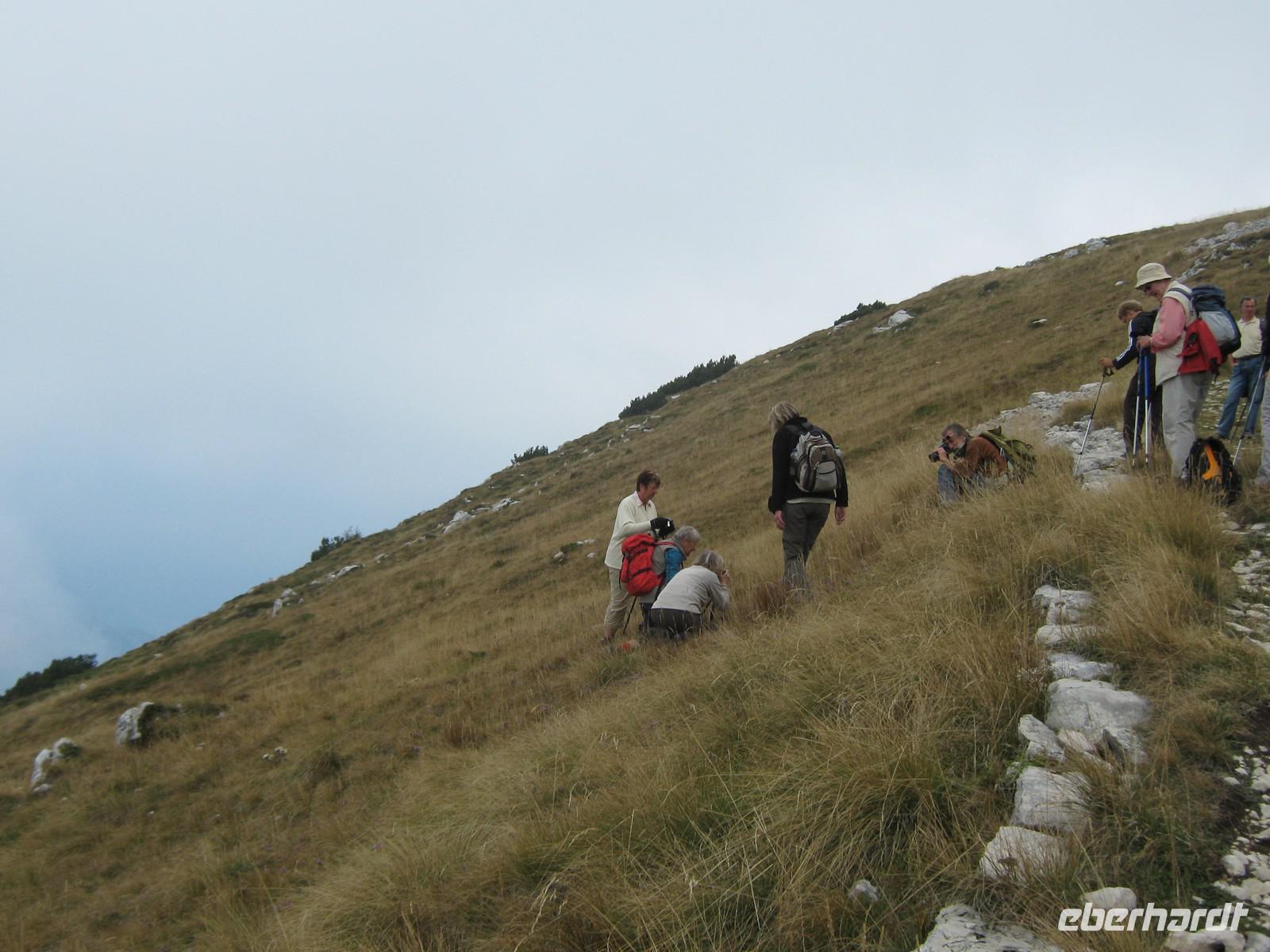 Das Beste zum Schluss - den höchsten Gipfel haben wir uns dann doch für den letzten Tag aufgehoben, wohlwissend, dass wir am nächsten Tag die Beine im Bus hochlegen können. Das Wetter scheint heut auch mitzuspielen und so machen wir uns erneut auf den nunmehr bekannten Weg nach Malcesine. Mit der Seilbahn gelangen wir auf knapp 1700m und packen uns erstmal ein,pfeift doch ein ordentlicher Wind in der Höhe. Ganz neue Entdeckungen machen wir auf dem Weg zum ersten Aussichtspunkt. Zuerst werden wir von Lamas beäugt, danach beobachten wir auch noch Murmeltiere, die immer wider neugierig aus ihrem Bau gucken. Nach 10 Minuten Laufweg breitet sich der Gardasee erneut zu unseren Füßen aus, wir können bis Torbole am Nordufer des Sees schauen. Dann machen wir einen kleinen Umweg: Um nicht einen steilen steinigen Weg laufen zu müssen, führt uns Wolfgang auf einem Trampelpfad über eine Weide hinab zur Refugio Bocca di Navena. Mittlerweile ist auch die Wolkendecke etwas aufgerissen und wir genießen die warmen Sonnenstrahlen sowie den weiten Blick über das Monte Baldo Massiv. Kurz bevor es auf den Altissimo hoch geht, trennt sich unsere Gruppe erneut. Ein Teil geht den nicht so steilen Weg hin zur Refugio unterhalb des Bocca del Creer, der andere Teil nimmt den Monte Altissimo in Angriff. Es wird nun zunehmend steiler, wir laufen teilweise quer zum Massiv. Immer wieder gibt es wundervolle Aussichten, erst kurz vor dem Gipfel zieht es sich wieder zu. Und so ist es wie am ersten Tag - oben angekommen und es gibt nichts zu sehen außer Nebel. Wir lassen uns aber nicht beirren, schließlich ist der Weg das Ziel. Nach der Mittagspause beginnnen wir den Abstieg, treffen an der Refugio auf den anderen Teil der Gruppe und wandern gemeinsam nach San Giacomo. Zuerst geht es gemütlich über eine Kuhweide, die Tiere scheinen an die Wanderer gewöhnt zu sein. Dann folgt ein wesentlich steilerer Abstieg, die Nässe macht den Weg rutschig, schließlich liegen im Spätsommer doch schon ein paar Laubblätter unten. Nichtsdestotrotz haben wir ja Zeit und können in aller Ruhe absteigen. Der letzte Teil ist dann doch eher gemütlich zu laufen und so geht langsam eine wundervolle Wanderwoche zu Ende.