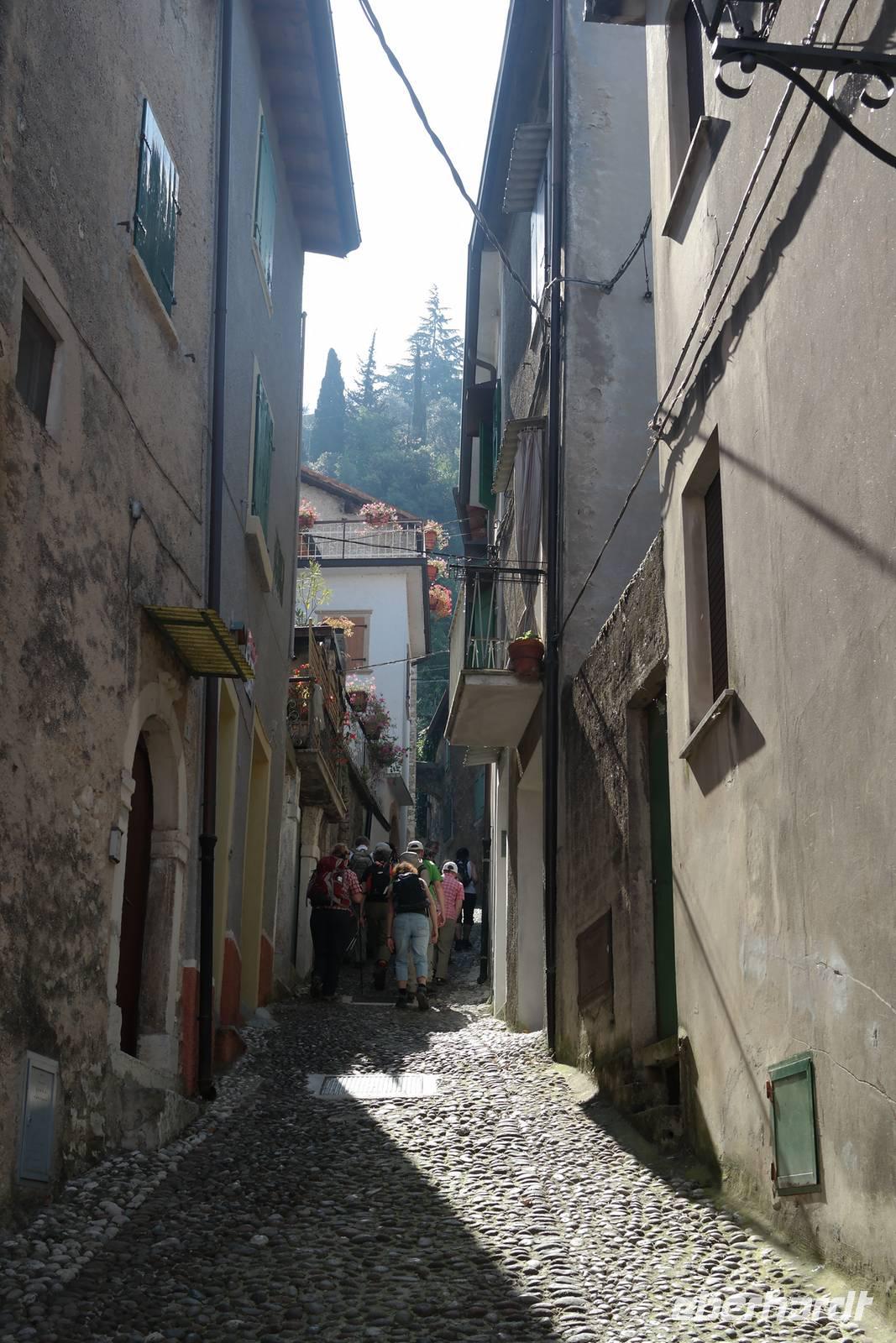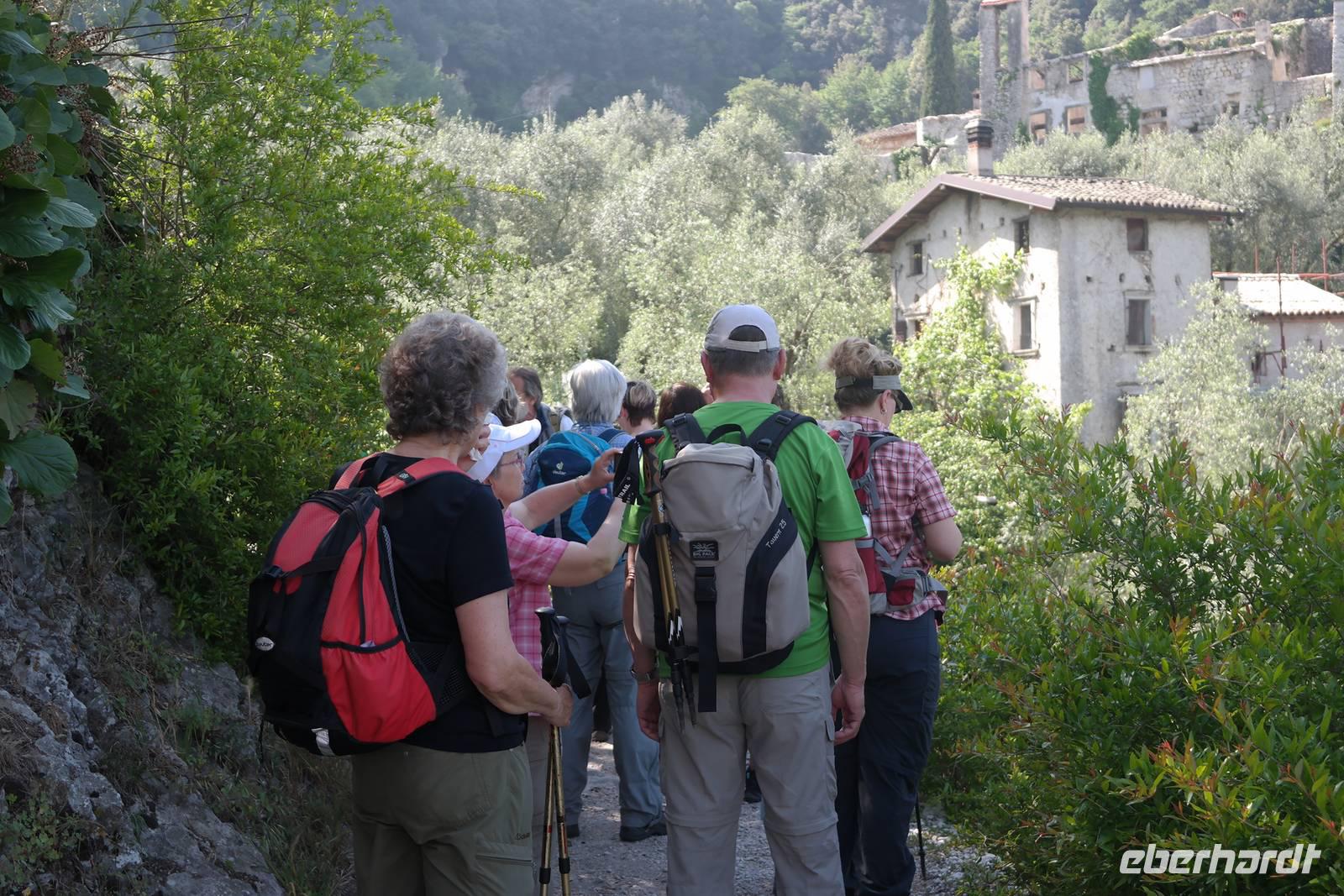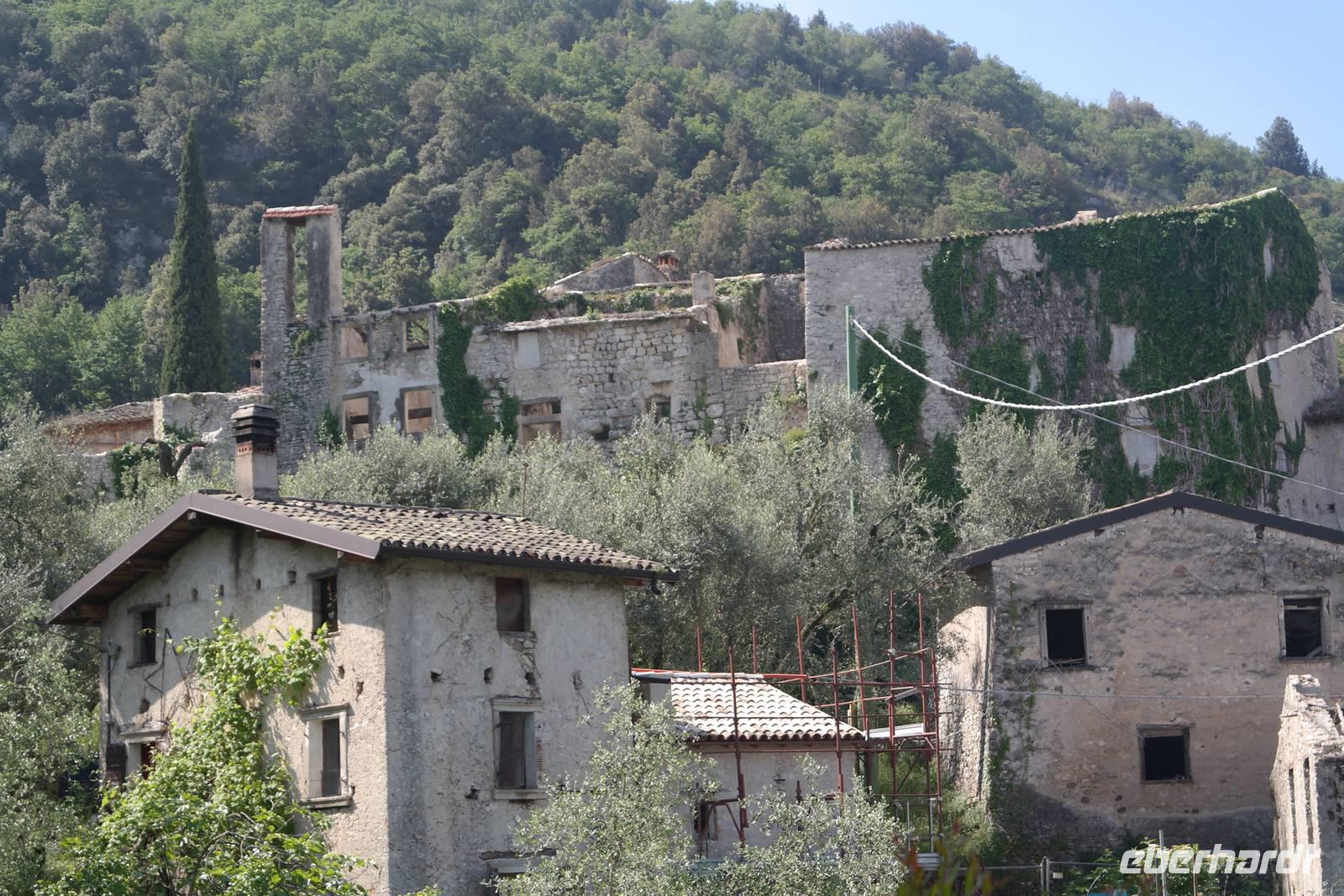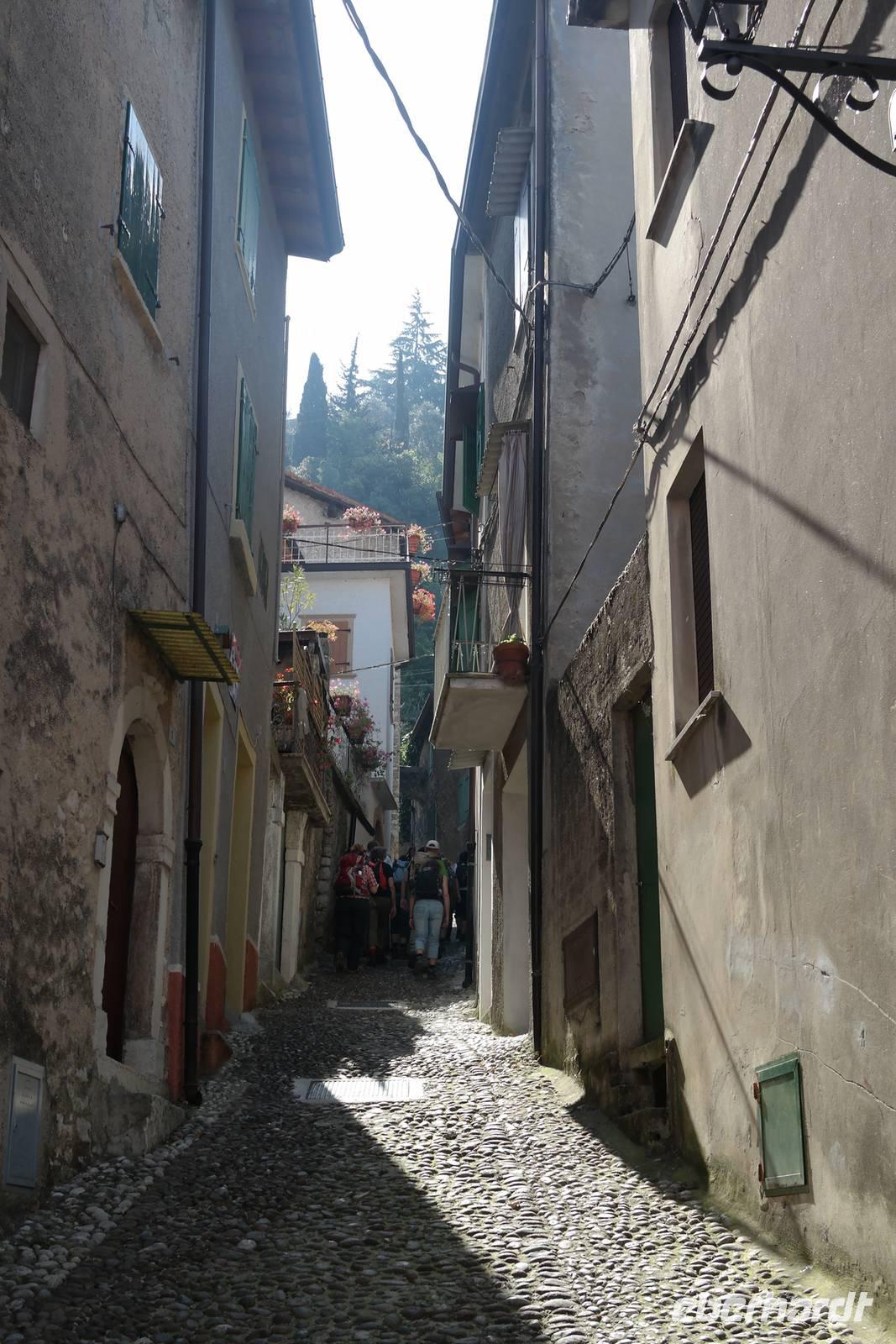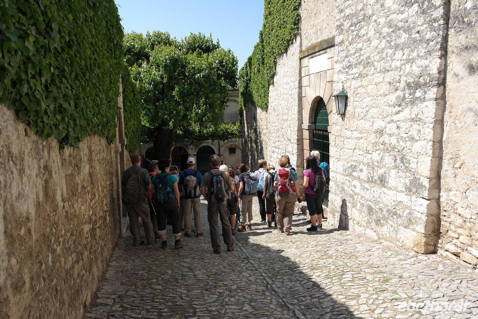 Aus Wänden und Nischen wächst der Efeu, es sieht ein bisschen aus wie in einem Grusel-Märchen. In der kleinen Kapelle, die nur noch bewahrt und nicht mehr restauriert wird, erzählt Wolfgang von den unterschiedlichsten Ideen, die es für diesen Ort schon gab. Von exklusiver Hotelanlage bis hin zu einer Künstlerakademie war alles dabei. Wir schließen uns Wolfgangs Meinung an: man sollte das alte Dorf lassen wie es ist und es bewahren. Wir wandern weiter zum privaten Gut Le Ca. Da es einem Freund von Wolfgang gehört, dürfen wir dort Picknick machen und uns vom Aufstieg erholen. Weiter geht es durch Plantagen von Esskastanien. Durch starken Schädlingsbefall sind diese stark zurück geschnitten - dass hier wieder was wachsen soll, glauben vor allem die Plantagenbesitzer. Es geht immer bergab und wir kommen zum Restaurant "Alla Fassa", dem "Balkon" hoch über dem Gardasee und genießen eine Erfrischung und diesen fantastischen Ausblick auf den Gardasee. Fast wären wir die letzten Besucher gewesen, denn ein kleiner italienischer Bub zündet vor dem Hotel eine Palme an, die sofort in Flammen steht. Es gelingt, das Feuer zu löschen und ein Übergreifen auf das Restaurant zu verhindern. Wir steigen weiter hinab und kommen bei Castelletto wieder an den Gardasee. Einige besichtigen noch die alte römische Burg, andere geben sich mit einem Eis und einem kleinen Spaziergang am Hafen zufrieden.