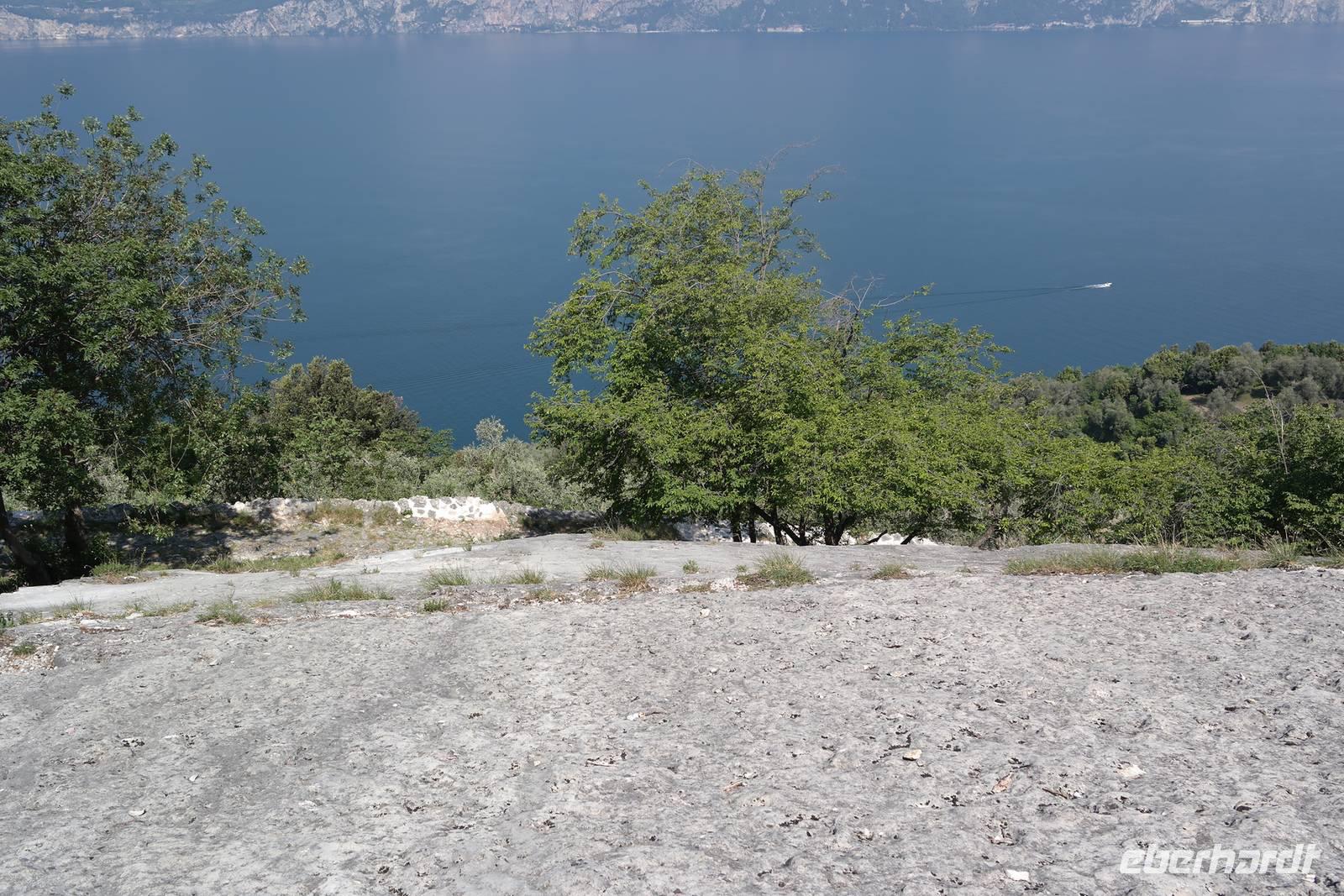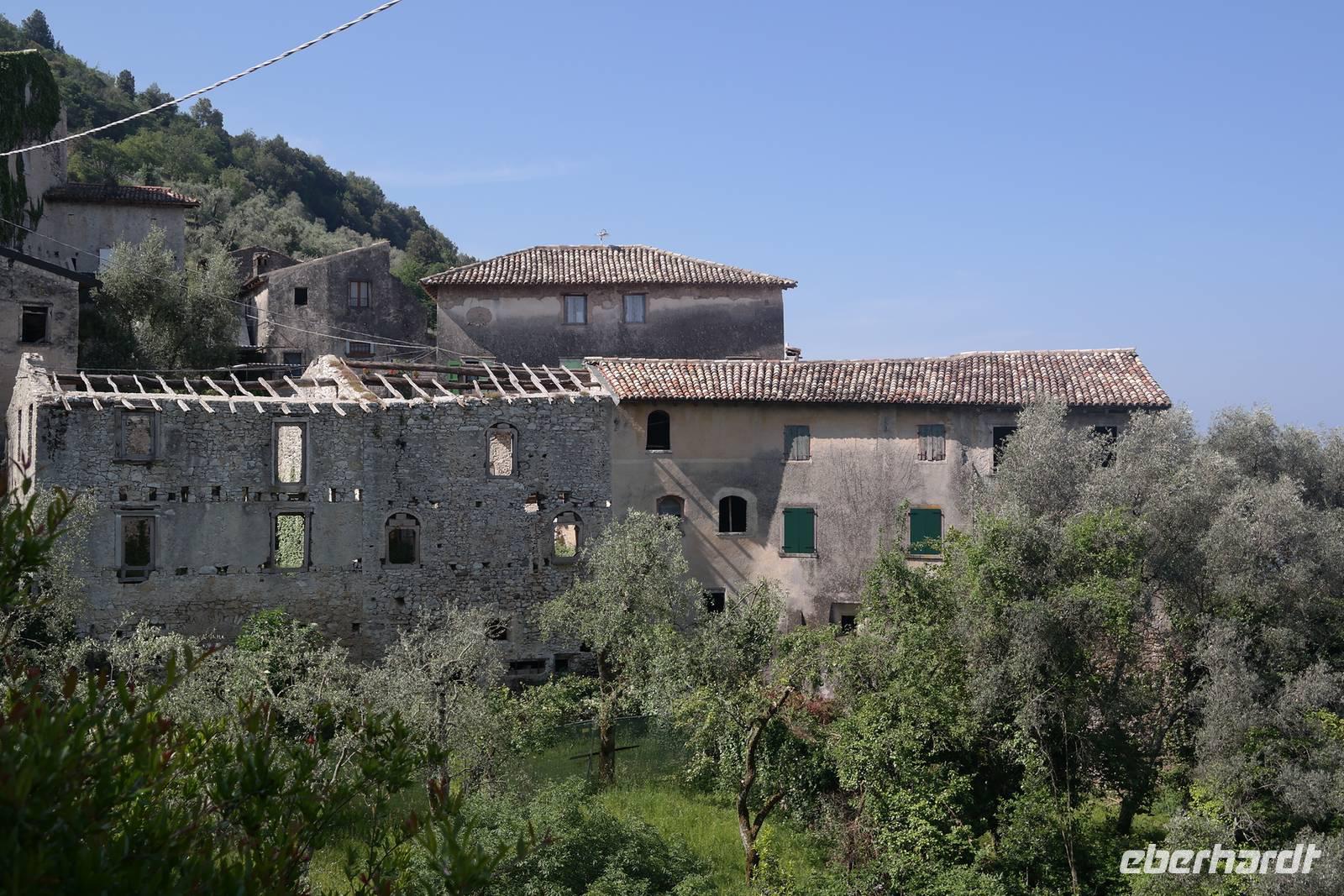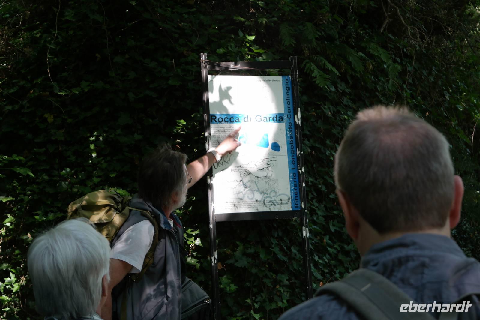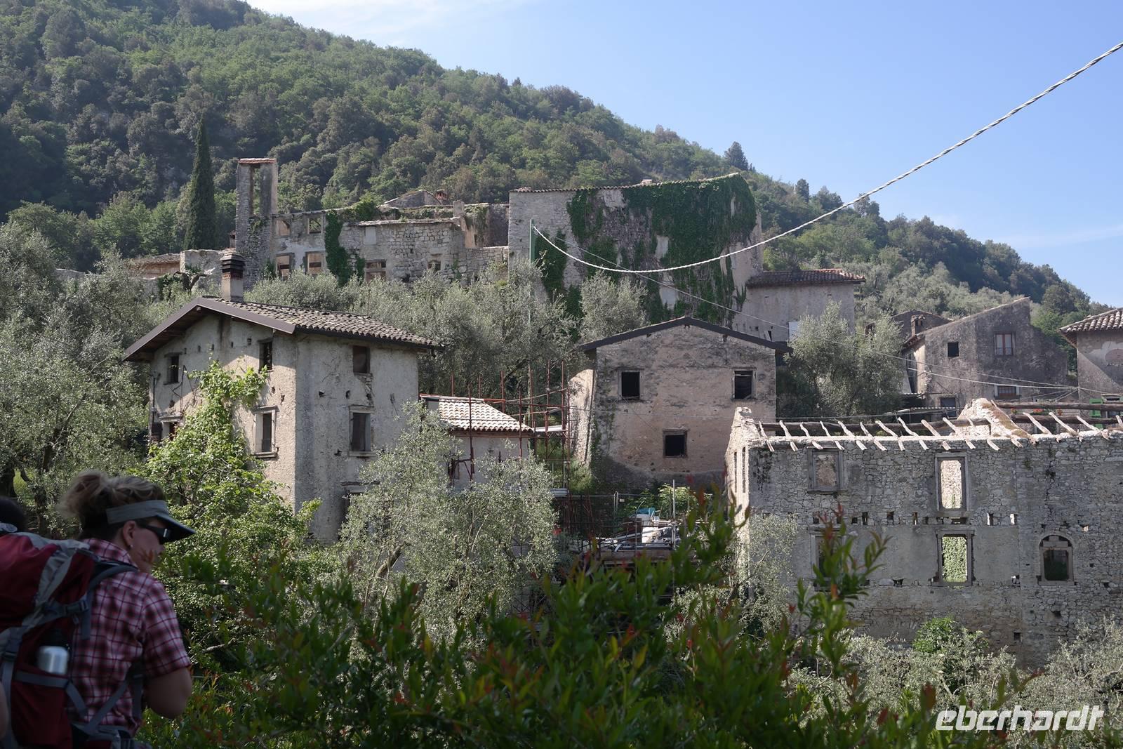 Aus Wänden und Nischen wächst der Efeu, es sieht ein bisschen aus wie in einem Grusel-Märchen. In der kleinen Kapelle, die nur noch bewahrt und nicht mehr restauriert wird, erzählt Wolfgang von den unterschiedlichsten Ideen, die es für diesen Ort schon gab. Von exklusiver Hotelanlage bis hin zu einer Künstlerakademie war alles dabei. Wir schließen uns Wolfgangs Meinung an: man sollte das alte Dorf lassen wie es ist und es bewahren. Wir wandern weiter zum privaten Gut Le Ca. Da es einem Freund von Wolfgang gehört, dürfen wir dort Picknick machen und uns vom Aufstieg erholen. Weiter geht es durch Plantagen von Esskastanien. Durch starken Schädlingsbefall sind diese stark zurück geschnitten - dass hier wieder was wachsen soll, glauben vor allem die Plantagenbesitzer. Es geht immer bergab und wir kommen zum Restaurant "Alla Fassa", dem "Balkon" hoch über dem Gardasee und genießen eine Erfrischung und diesen fantastischen Ausblick auf den Gardasee. Fast wären wir die letzten Besucher gewesen, denn ein kleiner italienischer Bub zündet vor dem Hotel eine Palme an, die sofort in Flammen steht. Es gelingt, das Feuer zu löschen und ein Übergreifen auf das Restaurant zu verhindern. Wir steigen weiter hinab und kommen bei Castelletto wieder an den Gardasee. Einige besichtigen noch die alte römische Burg, andere geben sich mit einem Eis und einem kleinen Spaziergang am Hafen zufrieden.