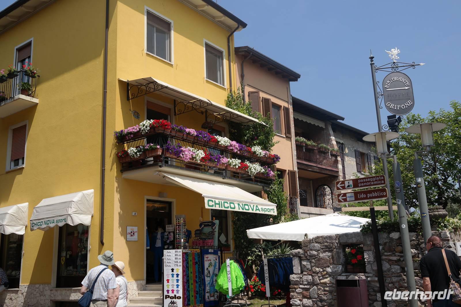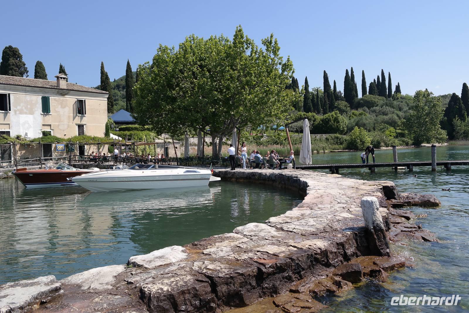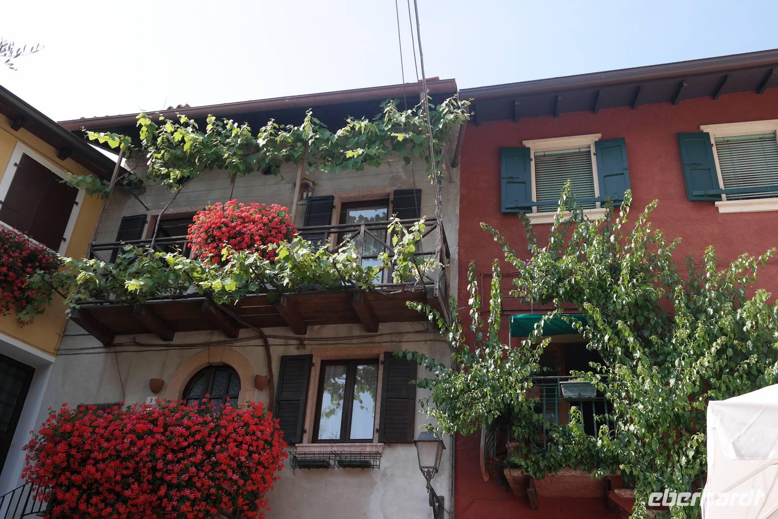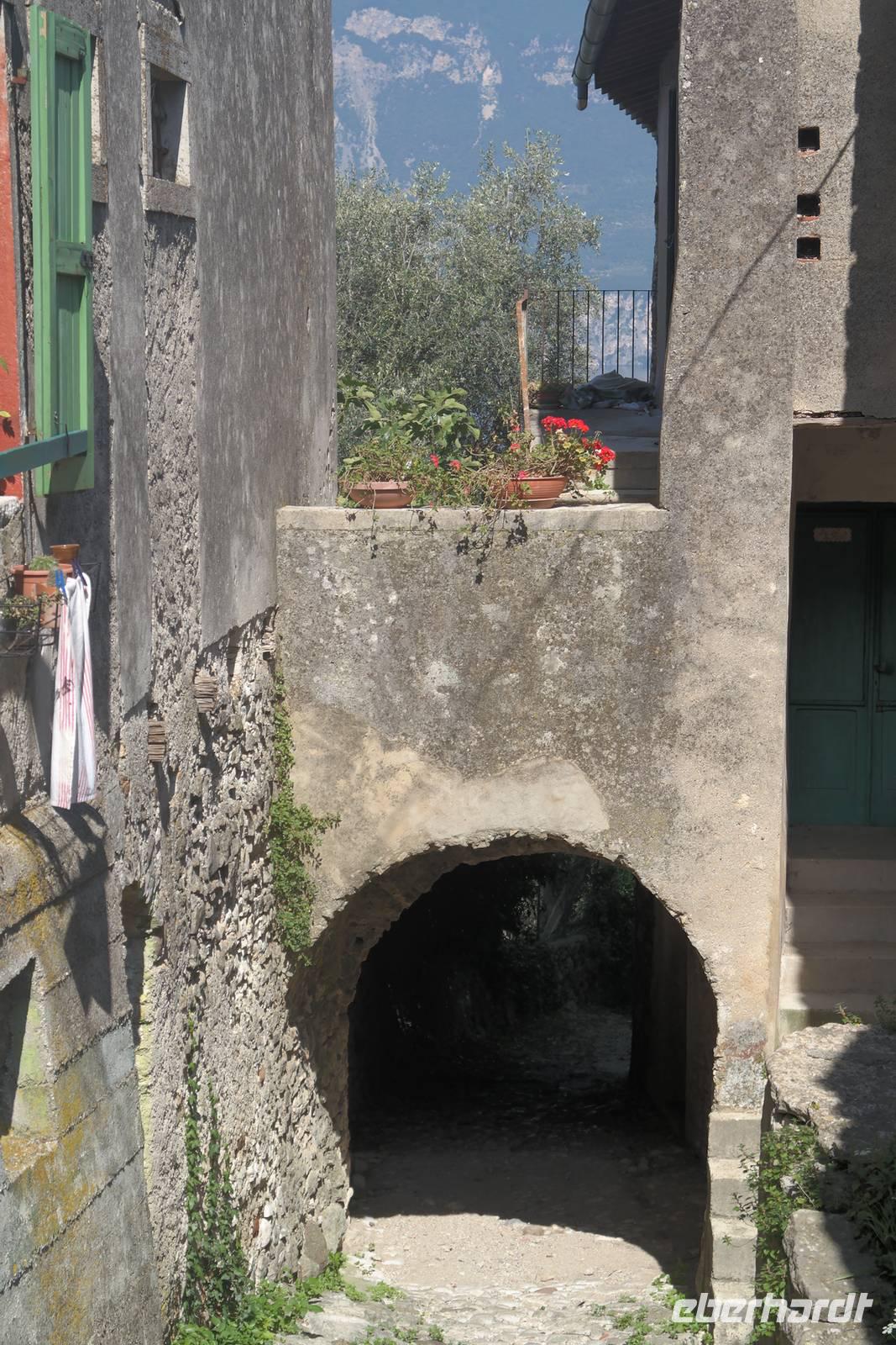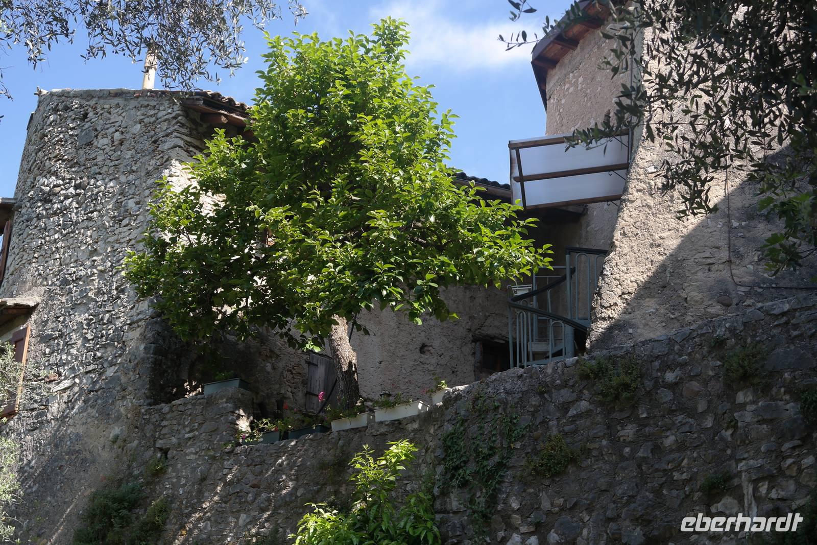Aus Wänden und Nischen wächst der Efeu, es sieht ein bisschen aus wie in einem Grusel-Märchen. In der kleinen Kapelle, die nur noch bewahrt und nicht mehr restauriert wird, erzählt Wolfgang von den unterschiedlichsten Ideen, die es für diesen Ort schon gab. Von exklusiver Hotelanlage bis hin zu einer Künstlerakademie war alles dabei. Wir schließen uns Wolfgangs Meinung an: man sollte das alte Dorf lassen wie es ist und es bewahren. Wir wandern weiter zum privaten Gut Le Ca. Da es einem Freund von Wolfgang gehört, dürfen wir dort Picknick machen und uns vom Aufstieg erholen. Weiter geht es durch Plantagen von Esskastanien. Durch starken Schädlingsbefall sind diese stark zurück geschnitten - dass hier wieder was wachsen soll, glauben vor allem die Plantagenbesitzer. Es geht immer bergab und wir kommen zum Restaurant "Alla Fassa", dem "Balkon" hoch über dem Gardasee und genießen eine Erfrischung und diesen fantastischen Ausblick auf den Gardasee. Fast wären wir die letzten Besucher gewesen, denn ein kleiner italienischer Bub zündet vor dem Hotel eine Palme an, die sofort in Flammen steht. Es gelingt, das Feuer zu löschen und ein Übergreifen auf das Restaurant zu verhindern. Wir steigen weiter hinab und kommen bei Castelletto wieder an den Gardasee. Einige besichtigen noch die alte römische Burg, andere geben sich mit einem Eis und einem kleinen Spaziergang am Hafen zufrieden.