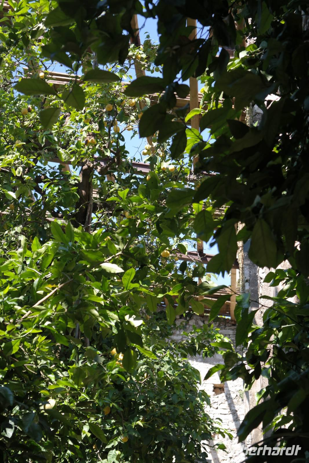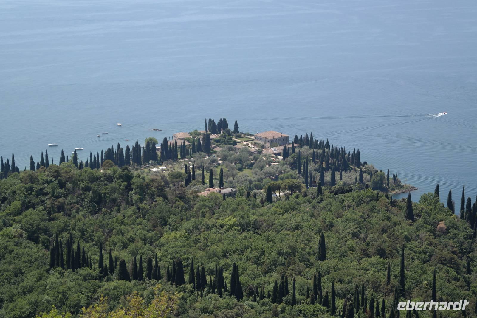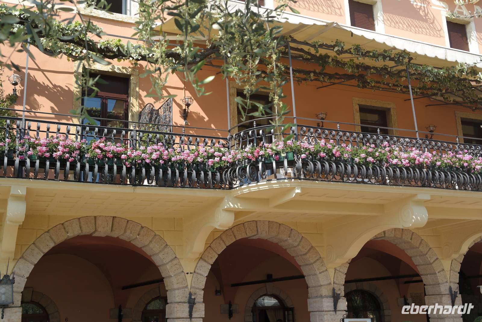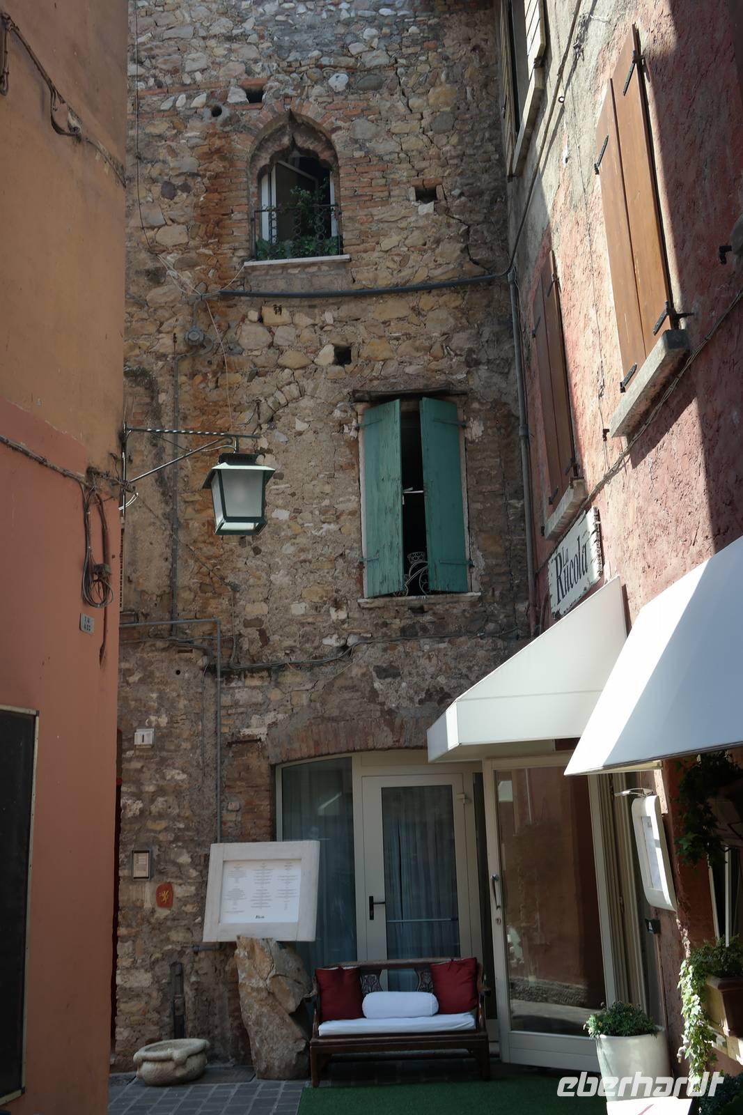 Aus Wänden und Nischen wächst der Efeu, es sieht ein bisschen aus wie in einem Grusel-Märchen. In der kleinen Kapelle, die nur noch bewahrt und nicht mehr restauriert wird, erzählt Wolfgang von den unterschiedlichsten Ideen, die es für diesen Ort schon gab. Von exklusiver Hotelanlage bis hin zu einer Künstlerakademie war alles dabei. Wir schließen uns Wolfgangs Meinung an: man sollte das alte Dorf lassen wie es ist und es bewahren. Wir wandern weiter zum privaten Gut Le Ca. Da es einem Freund von Wolfgang gehört, dürfen wir dort Picknick machen und uns vom Aufstieg erholen. Weiter geht es durch Plantagen von Esskastanien. Durch starken Schädlingsbefall sind diese stark zurück geschnitten - dass hier wieder was wachsen soll, glauben vor allem die Plantagenbesitzer. Es geht immer bergab und wir kommen zum Restaurant "Alla Fassa", dem "Balkon" hoch über dem Gardasee und genießen eine Erfrischung und diesen fantastischen Ausblick auf den Gardasee. Fast wären wir die letzten Besucher gewesen, denn ein kleiner italienischer Bub zündet vor dem Hotel eine Palme an, die sofort in Flammen steht. Es gelingt, das Feuer zu löschen und ein Übergreifen auf das Restaurant zu verhindern. Wir steigen weiter hinab und kommen bei Castelletto wieder an den Gardasee. Einige besichtigen noch die alte römische Burg, andere geben sich mit einem Eis und einem kleinen Spaziergang am Hafen zufrieden.