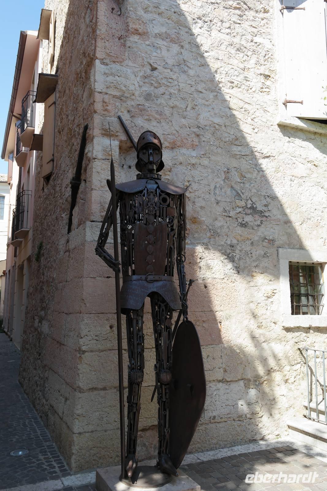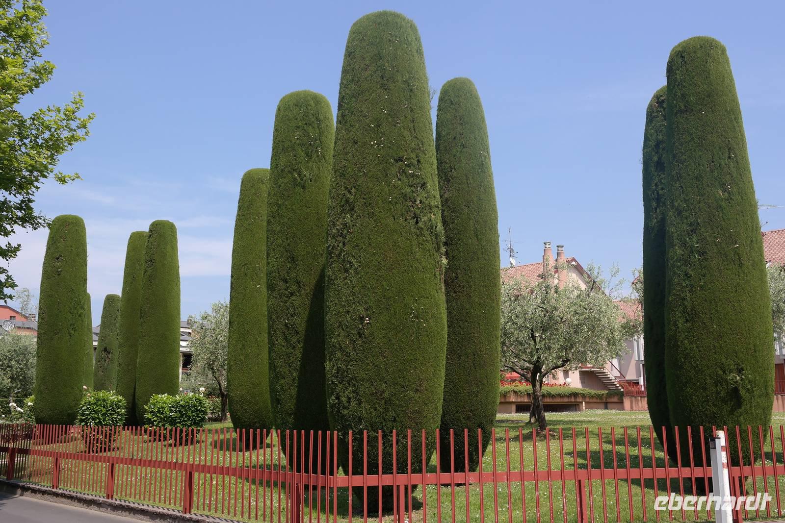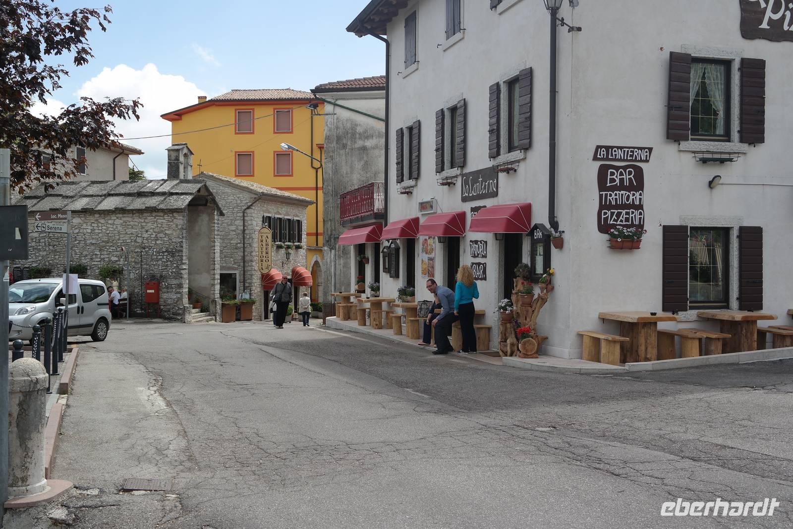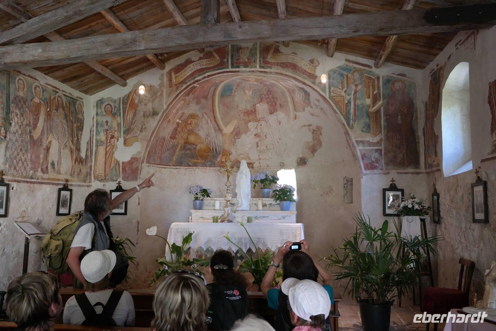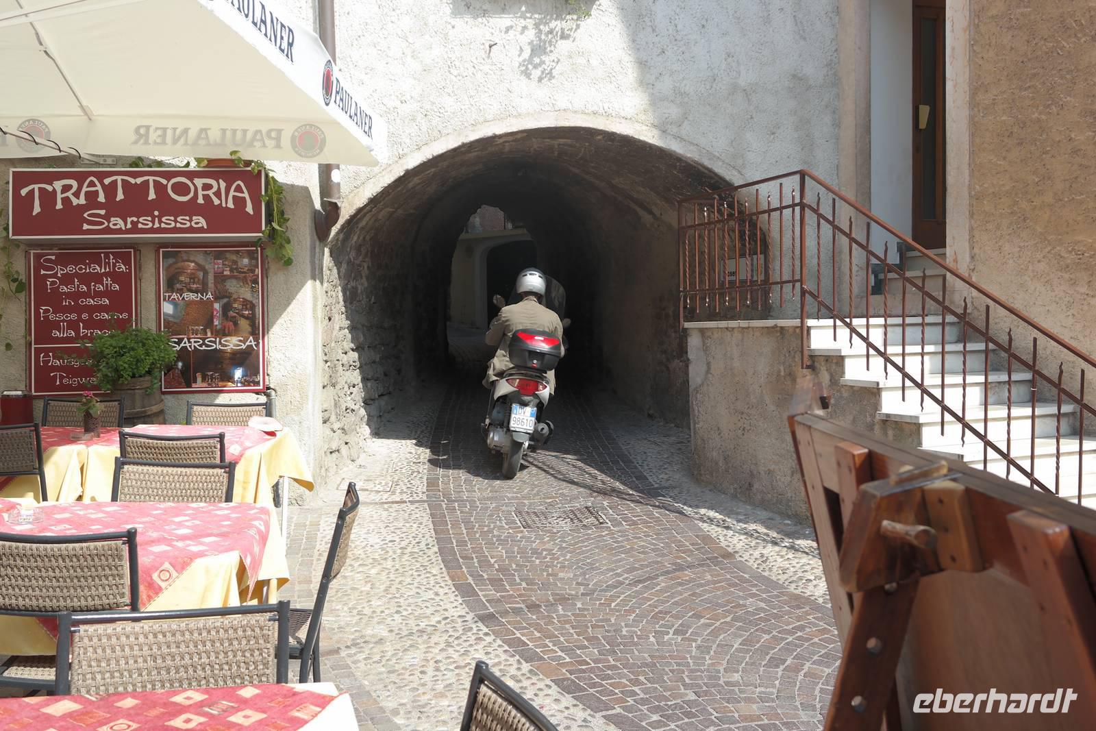 Aus Wänden und Nischen wächst der Efeu, es sieht ein bisschen aus wie in einem Grusel-Märchen. In der kleinen Kapelle, die nur noch bewahrt und nicht mehr restauriert wird, erzählt Wolfgang von den unterschiedlichsten Ideen, die es für diesen Ort schon gab. Von exklusiver Hotelanlage bis hin zu einer Künstlerakademie war alles dabei. Wir schließen uns Wolfgangs Meinung an: man sollte das alte Dorf lassen wie es ist und es bewahren. Wir wandern weiter zum privaten Gut Le Ca. Da es einem Freund von Wolfgang gehört, dürfen wir dort Picknick machen und uns vom Aufstieg erholen. Weiter geht es durch Plantagen von Esskastanien. Durch starken Schädlingsbefall sind diese stark zurück geschnitten - dass hier wieder was wachsen soll, glauben vor allem die Plantagenbesitzer. Es geht immer bergab und wir kommen zum Restaurant "Alla Fassa", dem "Balkon" hoch über dem Gardasee und genießen eine Erfrischung und diesen fantastischen Ausblick auf den Gardasee. Fast wären wir die letzten Besucher gewesen, denn ein kleiner italienischer Bub zündet vor dem Hotel eine Palme an, die sofort in Flammen steht. Es gelingt, das Feuer zu löschen und ein Übergreifen auf das Restaurant zu verhindern. Wir steigen weiter hinab und kommen bei Castelletto wieder an den Gardasee. Einige besichtigen noch die alte römische Burg, andere geben sich mit einem Eis und einem kleinen Spaziergang am Hafen zufrieden.