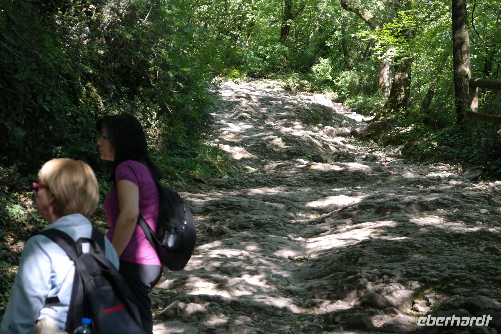 Heute fahren wir auf die "Rückseite" des Monte Baldo Massivs - ins Etschtal. Bis auf ein paar kleine Regenschauer haben wir wieder Glück mit dem Wetter und beginnen an der Rifugio Novezzina auf 1235 m unsere Wanderung. Ziel ist der Monte delle Erbe, doch nach einiger Zeit wird es steil und rutschig und Wolfgang empfiehlt einem Teil der Gruppe den sicheren Abstieg.