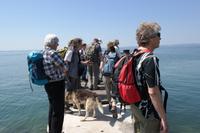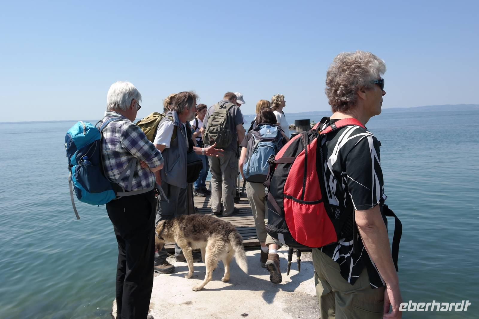 Am Morgen empfängt uns strahlender Sonnenschein und unser Wolf(gang) hat noch einen Wolf (Schäfer- und Wanderhund) Lupo - dabei. Schnell legt Lupo fest, dass er die Wanderspitze behauptet und wir reihen uns ein. Beim Aufstieg auf den Hausberg Rocca del Garda erweist sich Wolfgang als Wander- und Bergführer, Botaniker, Archeologe und Geologe - es gibt nichts, was er nicht weiß oder erklären kann. Man spürt bei Ihm das Herzblut, mit dem er uns seine Region näher bringt. Wir genießen einen tollen Blick auf Garda, den Yachthafen und den Gardasee, und weiter geht es zum idyllischen San Vigilio - dem "schönsten Ort der Welt". Auf der kleinen Landzunge gibt es einen kleinen Park, eine Zypressenallee, eine private Villa, enge Gässchen und Zitronen "hinter Mauern". Auf der kleinen Landzunge genießen wir den Sommer am Gardasee - bevor unsere Leitwölfe noch schnell den Monte Lupio mit uns erwandern. Es geht hinauf auf's "Krokodil", wie Wolfgang den Berg nennt, weil er im Profil wirklich an ein großes Reptil erinnert. Unterwegs macht Wolfgang für uns Steinzeichnungen (Rocca di Giselle) sichtbar, in dem er Wasser auf die von Gletschern plan geschliffenen Felsen sprüht, und versucht sich in der Deutung der Steinzeichnungen. Nach der Mittagspause beginnen wir mit dem Abstieg und laufen bis in den kleinen Ort Torri del Benaco. Die heißgelaufenen Füße bekommen eine Ruhepause und wir genehmigen uns ein Eis zur Erfrischung. Mit den Worten "und morgen gibt's gleich die Königsetappe" verabschieden sich unsere "Wölfe" und für uns geht es zurück zum Hotel. Am Abend erkunden einige von uns noch die sehenswerte Altstadt von Garda -, die Sonne versinkt langsam im Gardasee und wir in erholsamen Schlaf.
