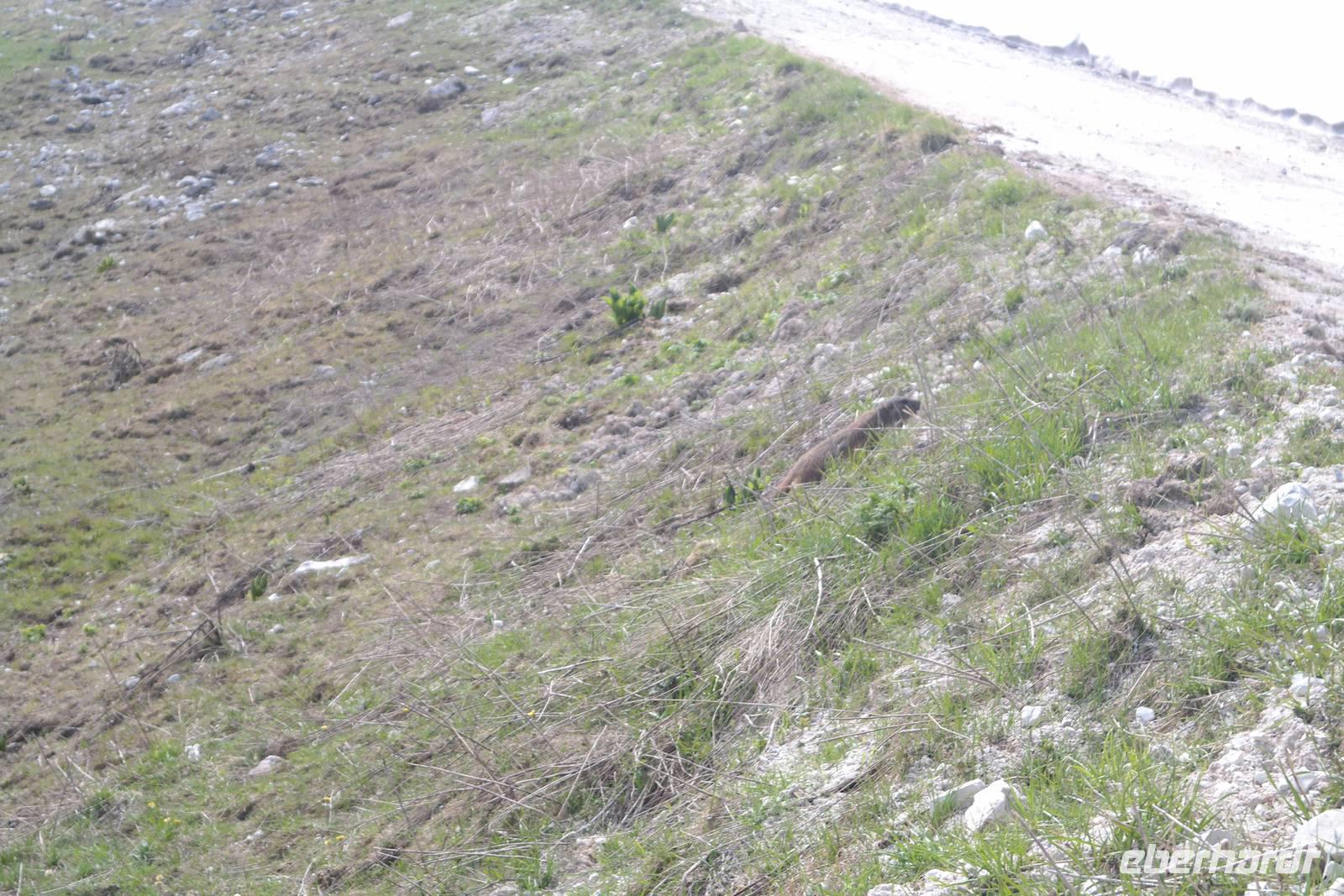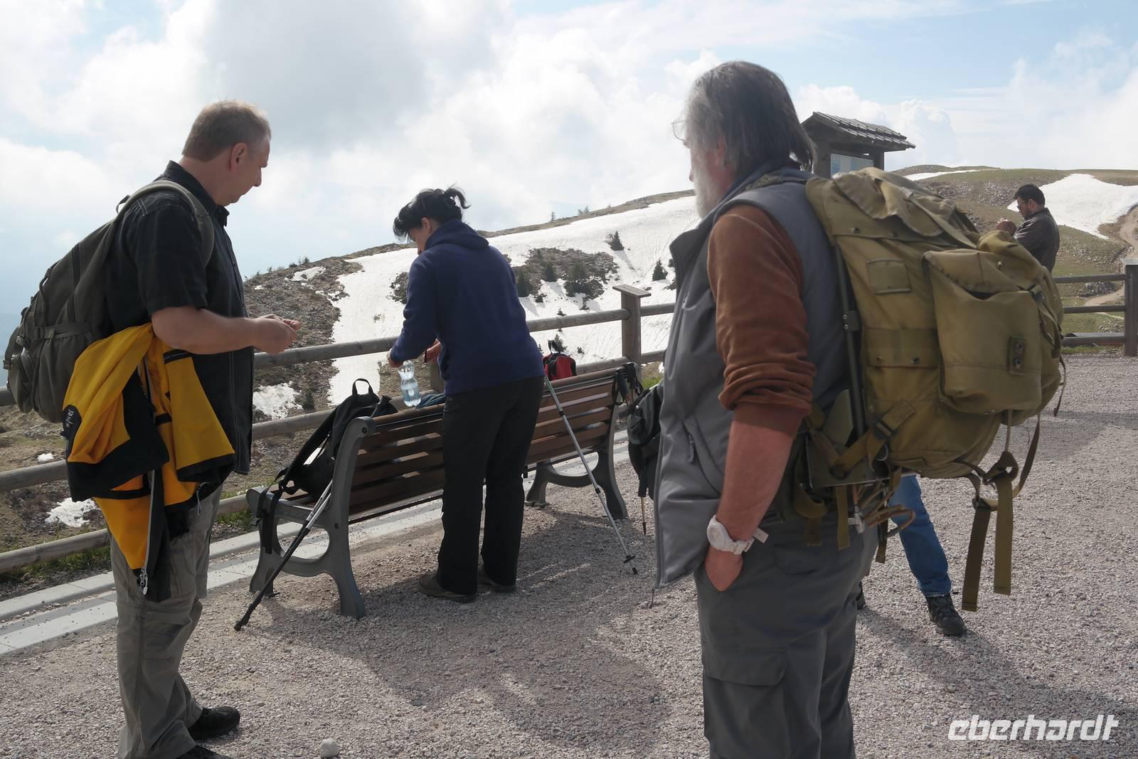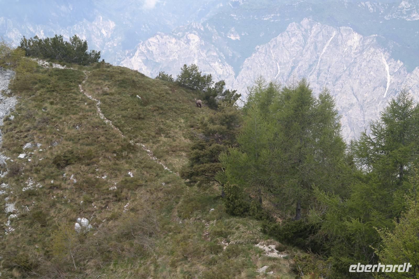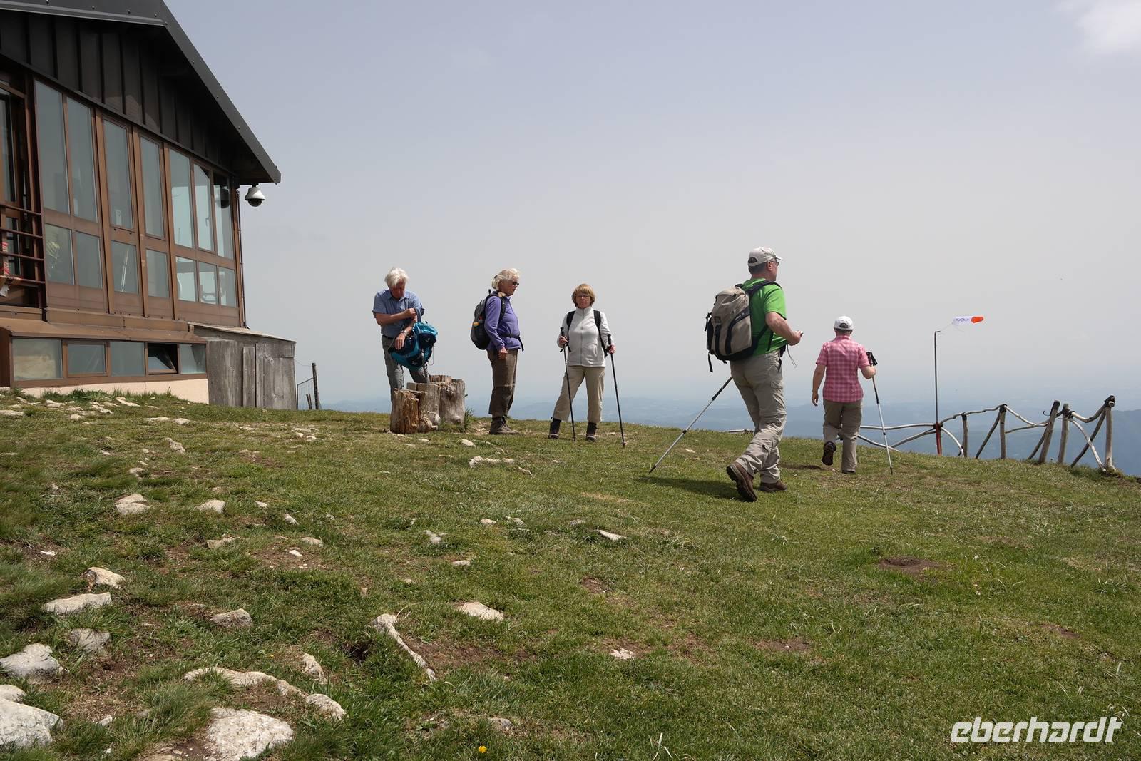 also Jacken an. Überall liegen noch Schneefelder und wir beginnen mit einem längeren Abstieg. Jacken wieder aus, denn die Sonne kommt raus. Und Murmeltiere, denen es im Bau zu warm wird und die uns neugierig beäugen. Nach rund einer Stunde Abstieg geht es kurz eine Straße bergauf. Plötzlich wechselt Wolfgang auf einen steilen Pfad und wir beginnen den Aufstieg zum Altissimo. Unterwegs entscheidet sich ein Teil der Gruppe, einen weniger anstrengenden Weg zur Refugio Graziani zu gehen. Bei einer schönen Rast unterwegs können wir zwei Steinböcke (oder Gemsen?) beobachten und genießen die traumhafte Aussicht auf den Gardasee. Die andere Gruppe "schraubt" sich unterdessen auf den Altissimo und belohnt sich auf dem Gipfel mit "Grappa aus dem Löffel". Wir kleinen Gipfelstürmer ziehen "Grappa aus dem Glas" vor und alle treffen sich in San Giacomo wieder. Diese Wanderung hatte es bestimmt in sich, aber die tollen An- und Ausblicke wollte niemand missen. Und mit einem Klopfer auf die Schulter gab uns Wolfgang zu verstehen: Wir haben's geschafft. Zurück nimmt unser Bus die etwas längere, aber schönere Route entlang des Garadsees. Dabei erzählt uns Wolfgang, warum Goethe bei seiner Italien-Reise wegen Spionage verhaftet wurde, warum Frösche Schuld waren, dass ein Hotel abgerissen werden musste und noch einige andere Geschichten. Wir freuen uns auf den nächsten Tag - denn wir haben "wander"-frei!