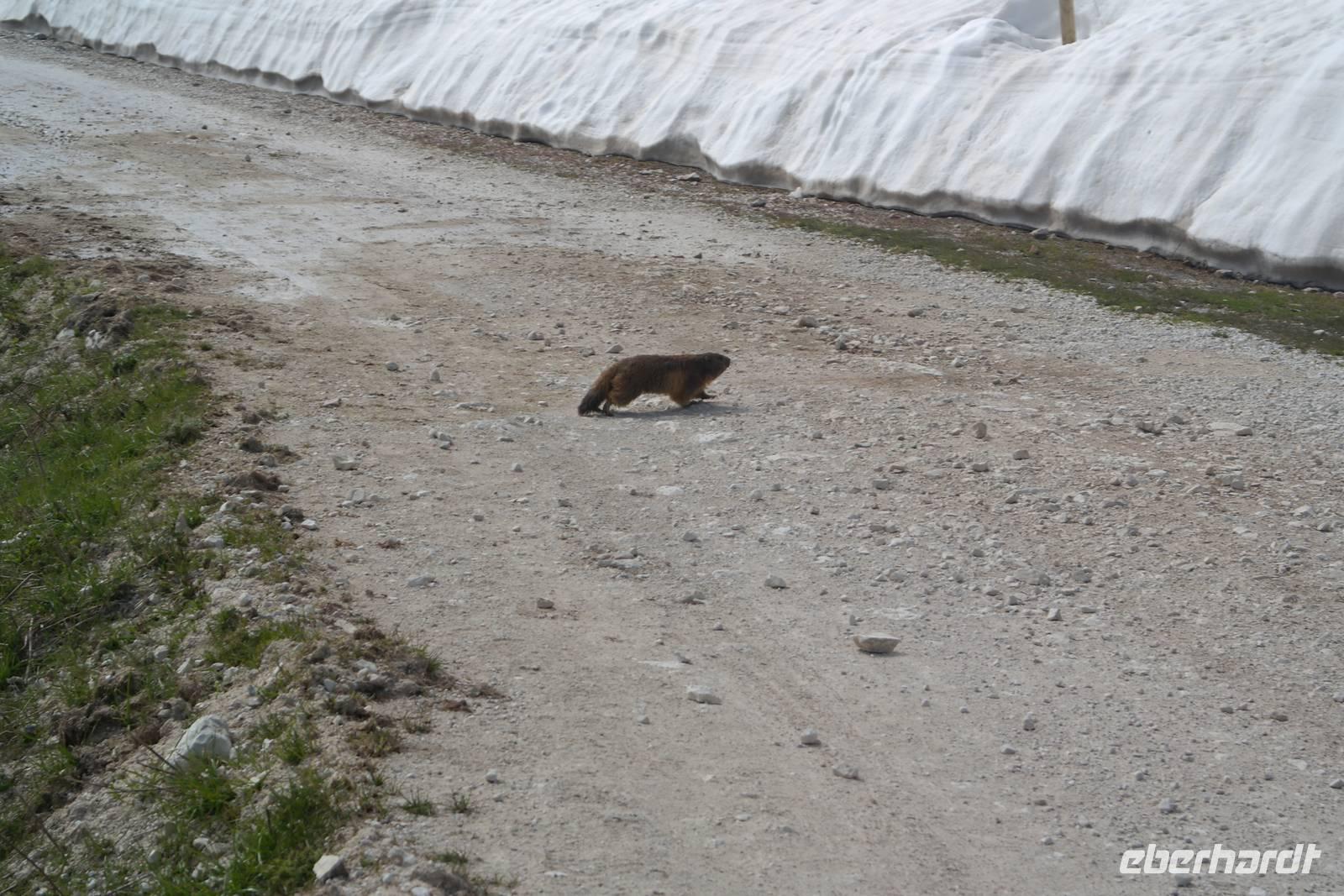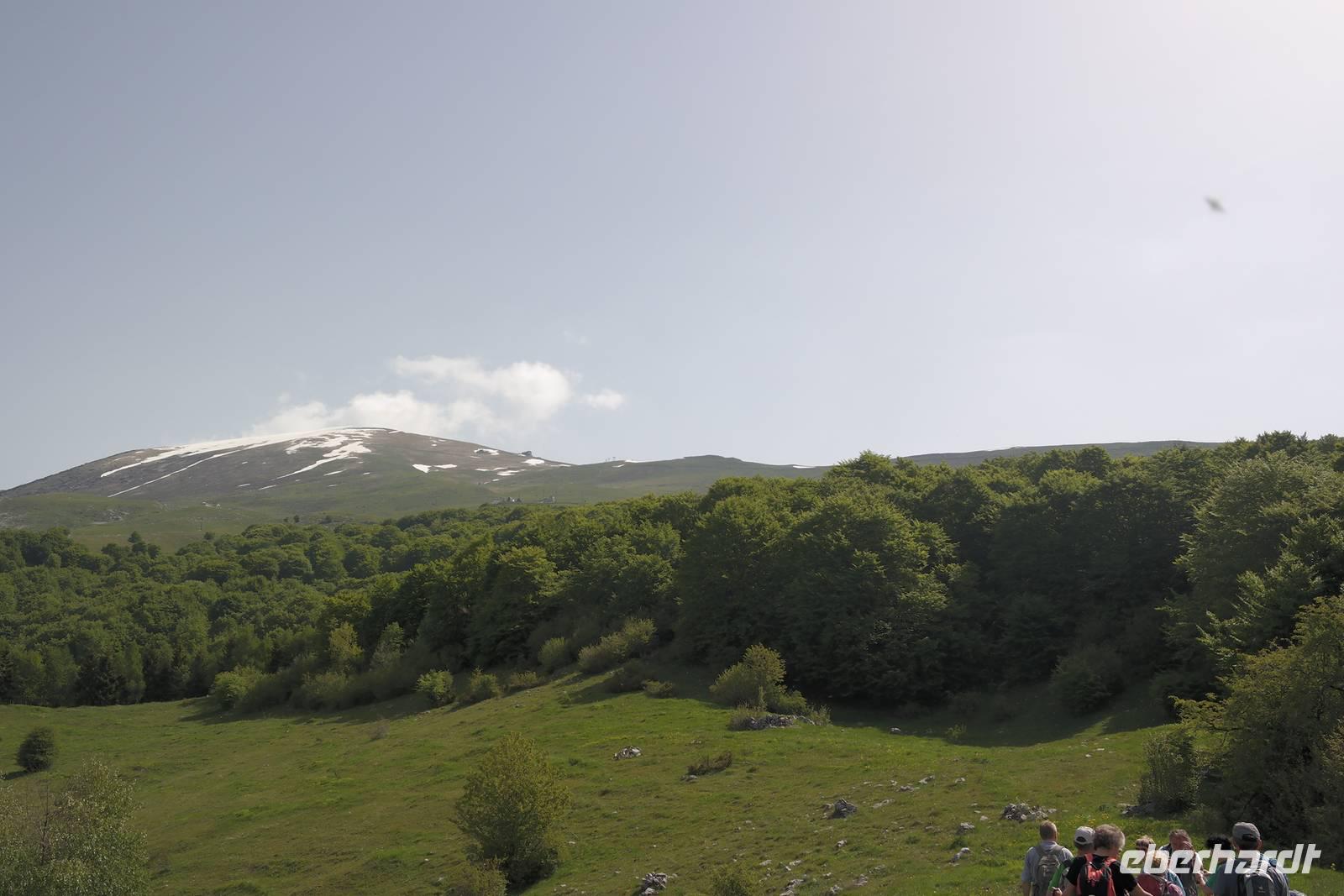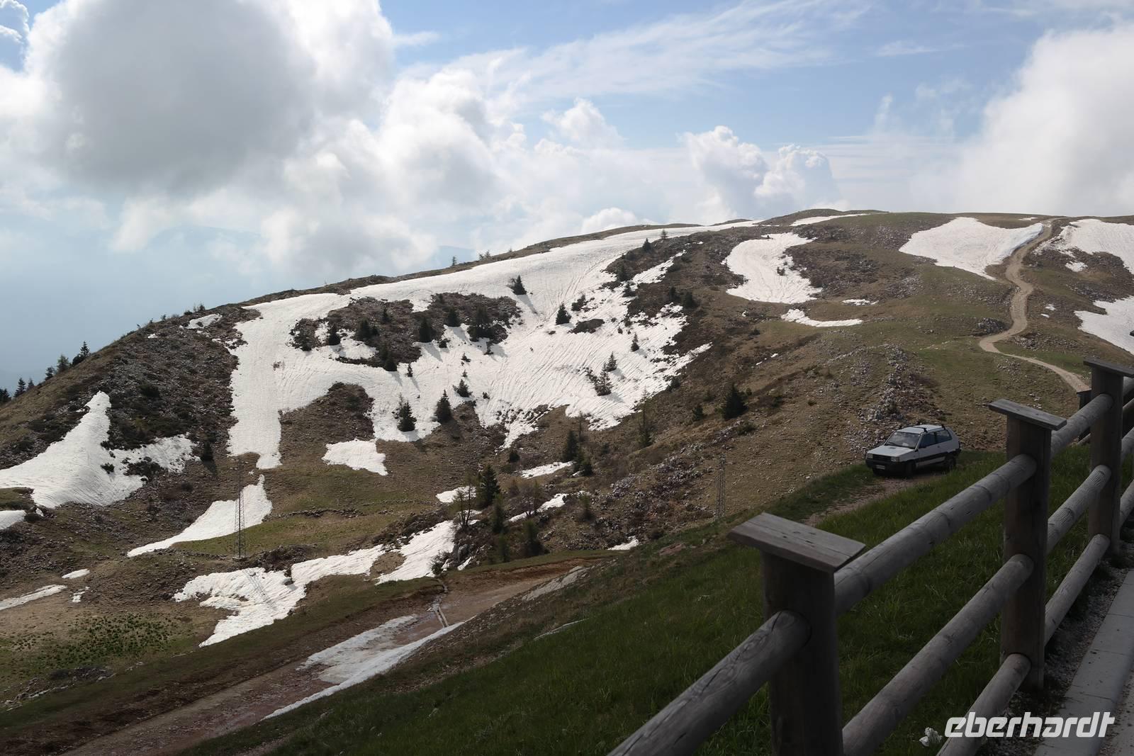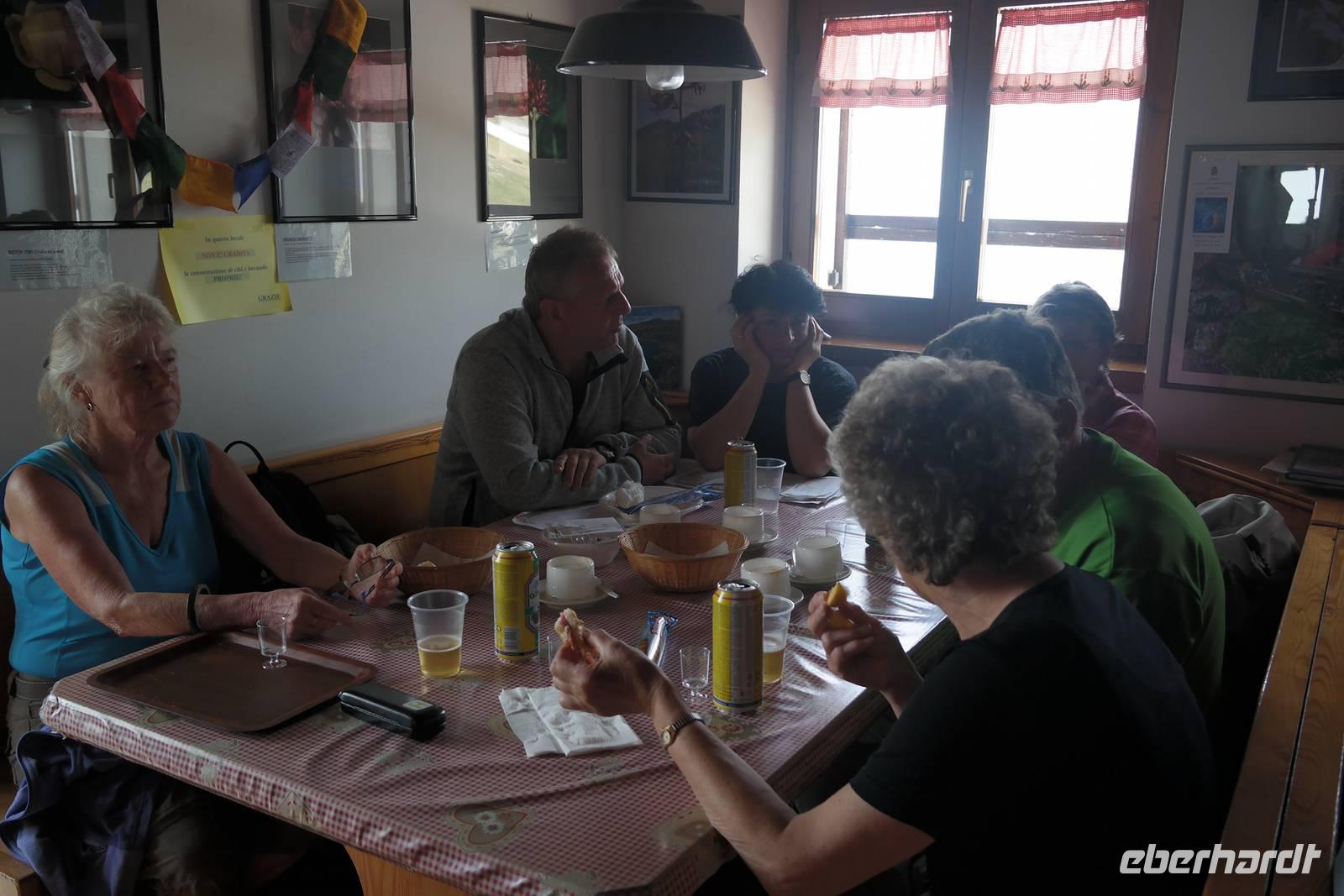 also Jacken an. Überall liegen noch Schneefelder und wir beginnen mit einem längeren Abstieg. Jacken wieder aus, denn die Sonne kommt raus. Und Murmeltiere, denen es im Bau zu warm wird und die uns neugierig beäugen. Nach rund einer Stunde Abstieg geht es kurz eine Straße bergauf. Plötzlich wechselt Wolfgang auf einen steilen Pfad und wir beginnen den Aufstieg zum Altissimo. Unterwegs entscheidet sich ein Teil der Gruppe, einen weniger anstrengenden Weg zur Refugio Graziani zu gehen. Bei einer schönen Rast unterwegs können wir zwei Steinböcke (oder Gemsen?) beobachten und genießen die traumhafte Aussicht auf den Gardasee. Die andere Gruppe "schraubt" sich unterdessen auf den Altissimo und belohnt sich auf dem Gipfel mit "Grappa aus dem Löffel". Wir kleinen Gipfelstürmer ziehen "Grappa aus dem Glas" vor und alle treffen sich in San Giacomo wieder. Diese Wanderung hatte es bestimmt in sich, aber die tollen An- und Ausblicke wollte niemand missen. Und mit einem Klopfer auf die Schulter gab uns Wolfgang zu verstehen: Wir haben's geschafft. Zurück nimmt unser Bus die etwas längere, aber schönere Route entlang des Garadsees. Dabei erzählt uns Wolfgang, warum Goethe bei seiner Italien-Reise wegen Spionage verhaftet wurde, warum Frösche Schuld waren, dass ein Hotel abgerissen werden musste und noch einige andere Geschichten. Wir freuen uns auf den nächsten Tag - denn wir haben "wander"-frei!