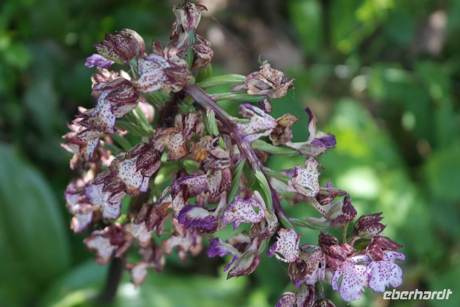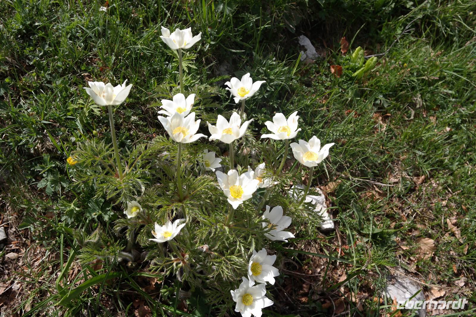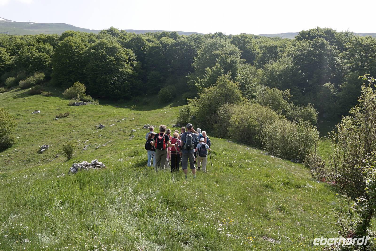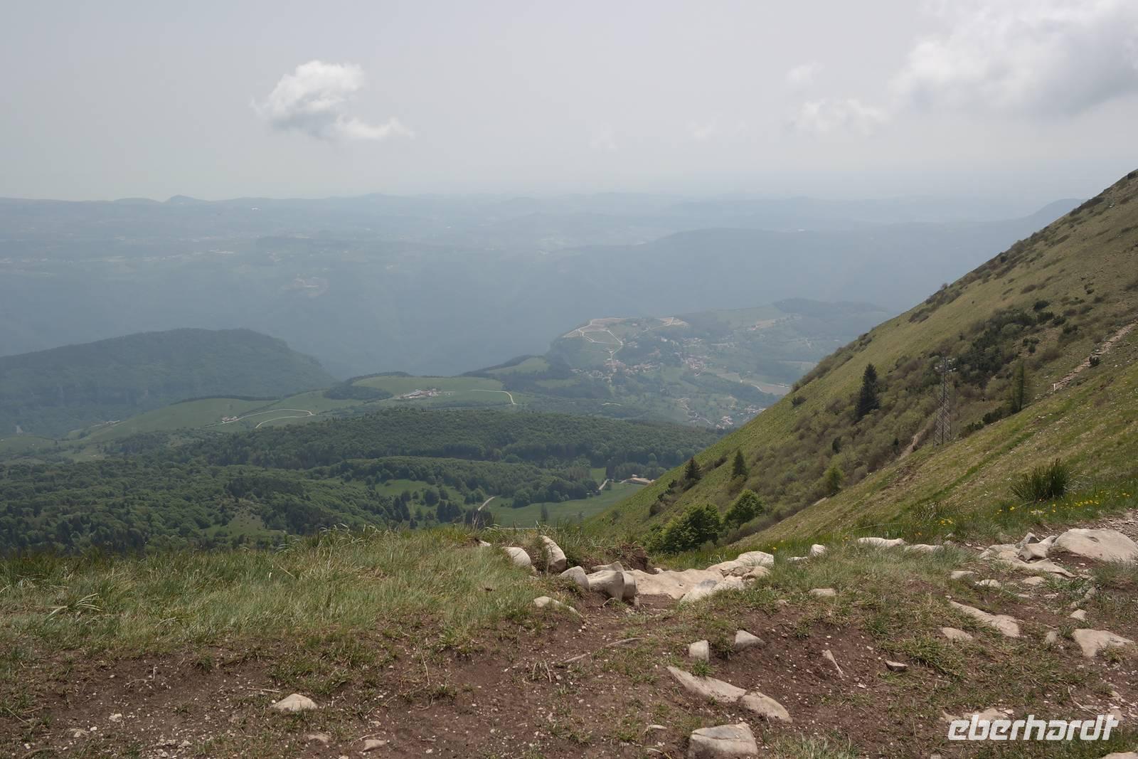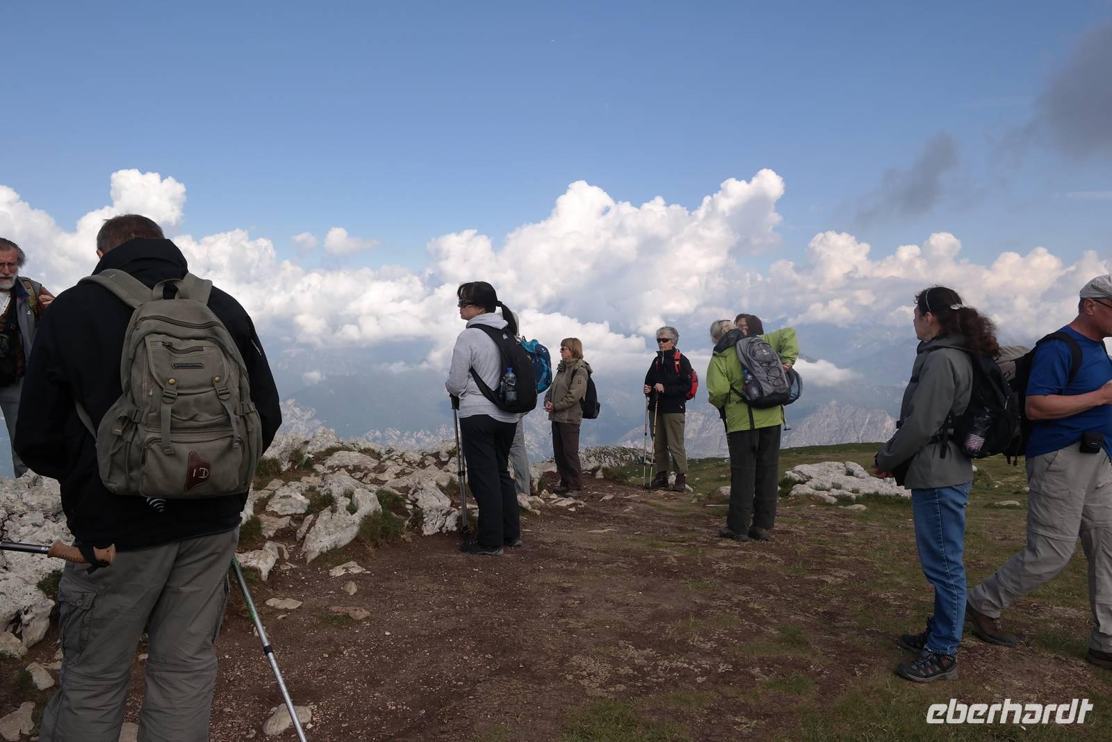 Die Gruppe zieht sich weit auseinander, jeder ist mit sich (und den Fliegen) beschäftigt. Unterwegs erklärt Wolfgang die einzigartige Pflanzenwelt, an der wir ohne seine Hinweise bestimmt vorbeigegangen wären. Unterhalb des Rifugio Fiori del Baldo auf 1815 m teilt sich die Gruppe - Wolfgang geht mit einigen Gästen noch zu den Resten einer römischen Burg und verspricht dafür einen tollen Blick ins Etschtal. Die andere Gruppe gelangt ohne Umweg zu dem gleichen Bergrücken, genießt den grandiosen Anblick des Etschtals und ist eine halbe Stunde früher im Rifugio. Wir genießen die Pause, einige müssen ihre Sachen wieder trocknen und wir kommen auf fast dem gleichen Wege die 800 m wieder hinab zu unserem Busparkplatz. Diese Wanderung war anstrengend und schön - wir können stolz auf uns sein.