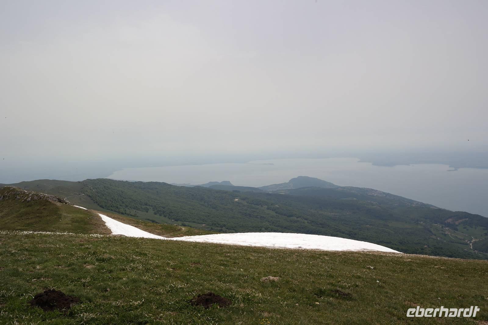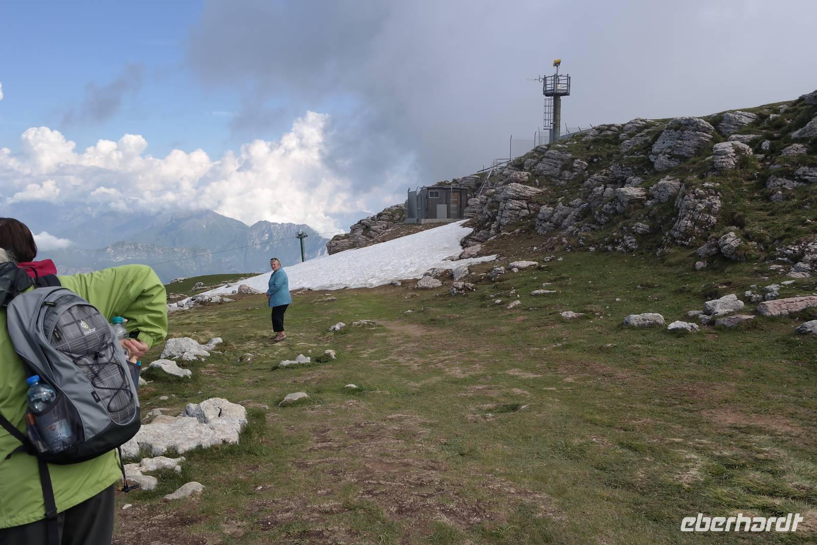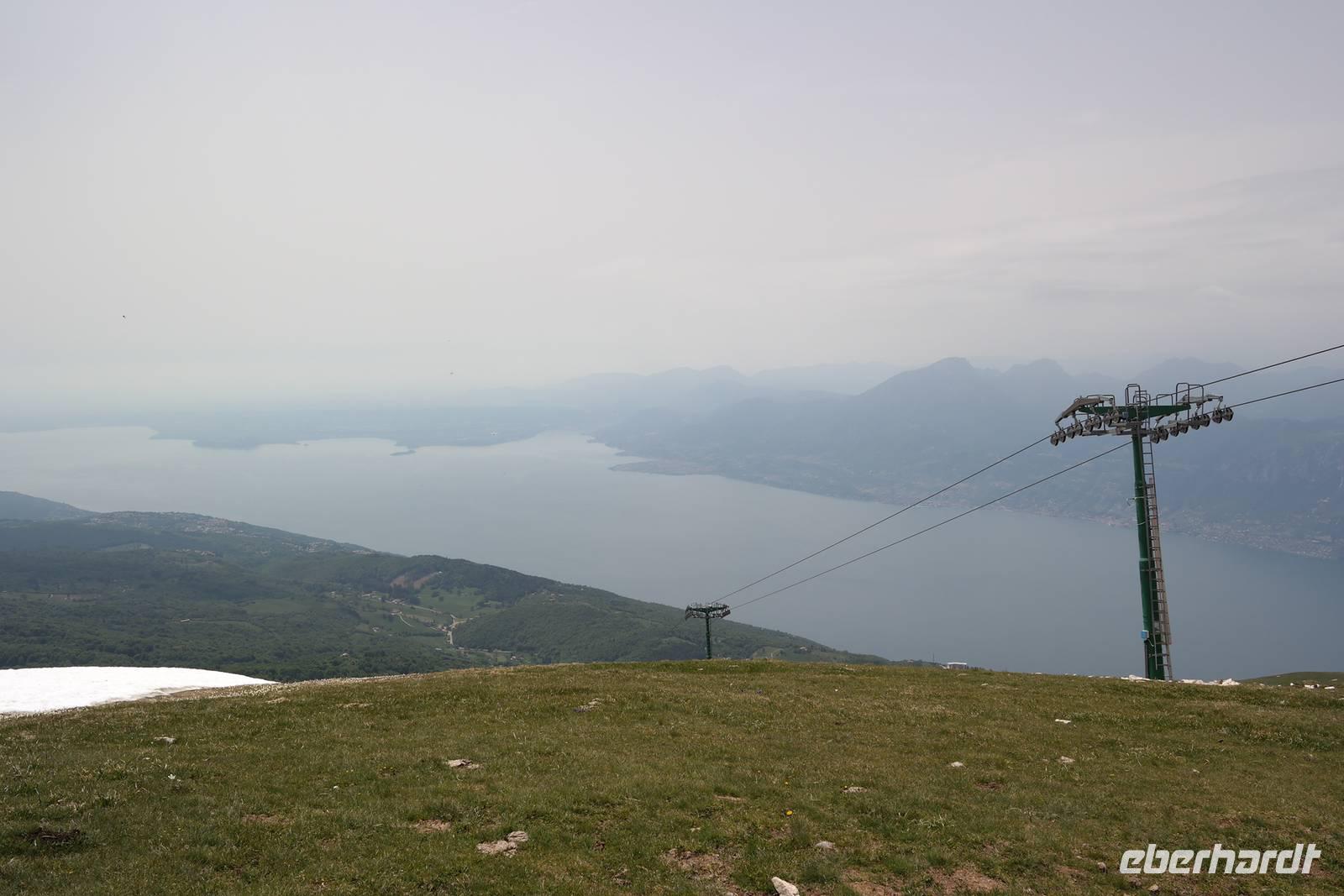 Heute geht es etwas früher los - Wolfgang wird wissen warum. Unterwegs ein Blick auf "Napoleons" Nase - der Berg ist gut zu sehen. also wird das Wetter gut. Wir fahren nach Malcesine und steigen in die Seilbahn ein, auf der Mittelstation geht es in eine Dreh-Gondelbahn. Diese Einzigartigkeit in Europa lässt den Blick in alle Himmelsrichtungen schweifen - es sind aber so viele Paraglider in der Kabine, dass wir uns kaum bewegen können. Auf 1752 Meter angekommen sieht die Welt schon anders aus, es hat noch 6°Celsius -