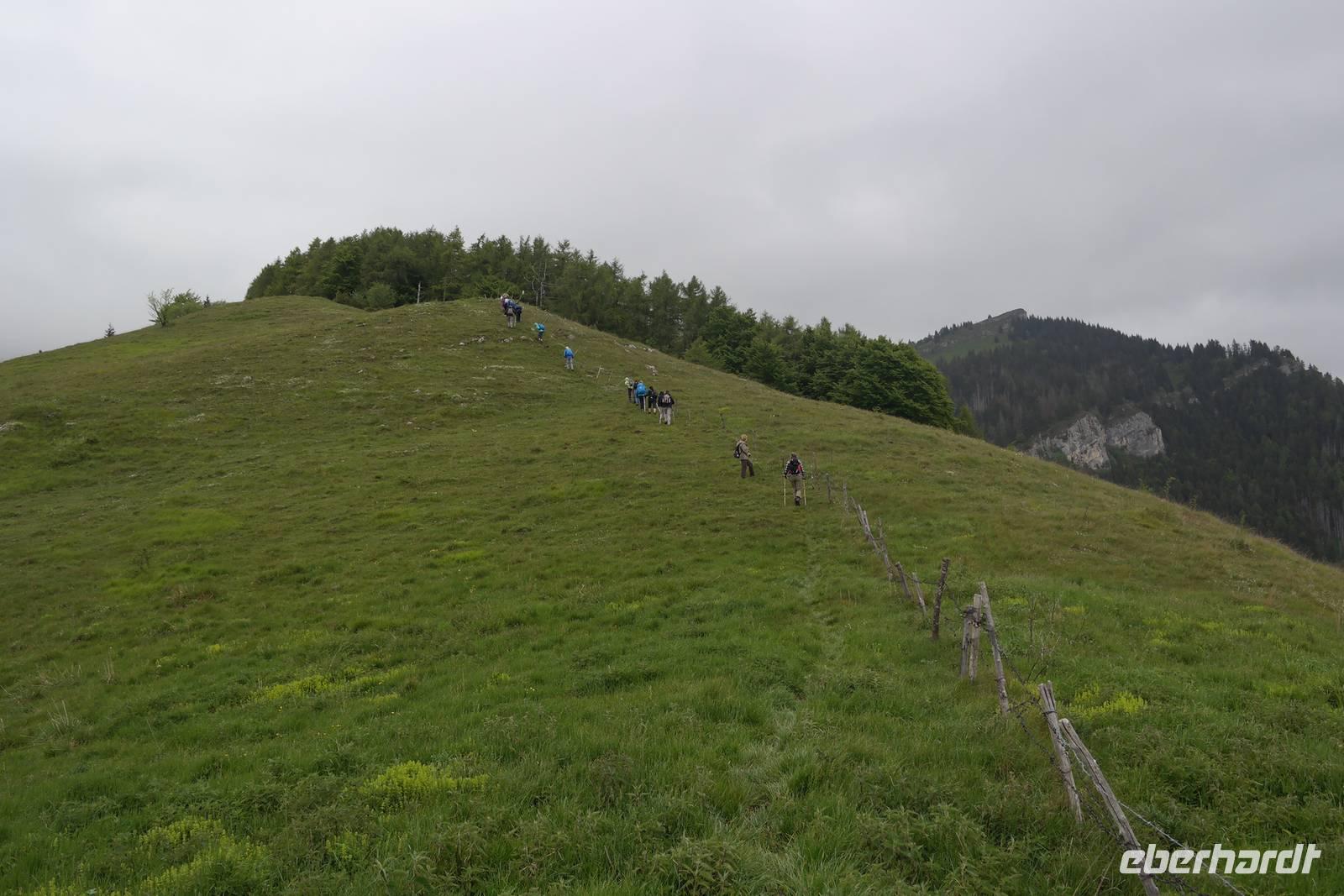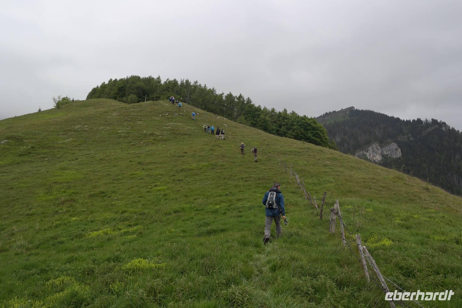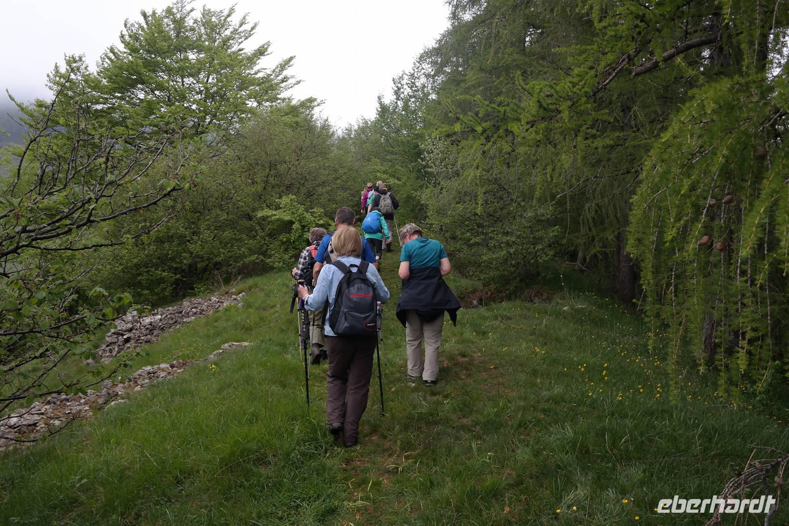 Wenngleich uns Wolfgang verspricht, dass der heutige Tage nicht zu anstrengend wird, nötigen uns 800 Höhenmeter gehörig Respekt ab. Wir fahren vorbei an San Zeno zu unserem heutigen Ausgangspunkt auf 1000 m Höhe. Früher gab es hier eine Art Seilbahn, die die Gäste im Stehen und bei laufender Fahrt auf rund 1800 m Höhe brachte. Wir sind Wanderer ! und beginnen mit dem Aufstieg. Es geht über Schotterwege und Wiesen, und mit jedem Meter Höhe kommt die Sonne etwas mehr heraus, läßt uns schwitzen. Darauf haben die Fliegen nur gewartet - ganze Schwärme umkreisen jeden Wanderer - Kühe sind schließlich keine da.