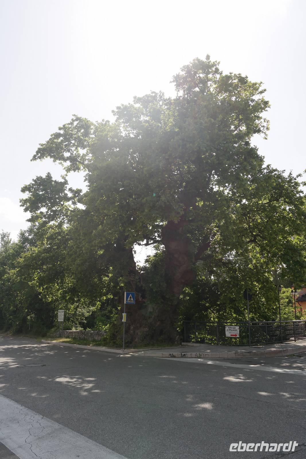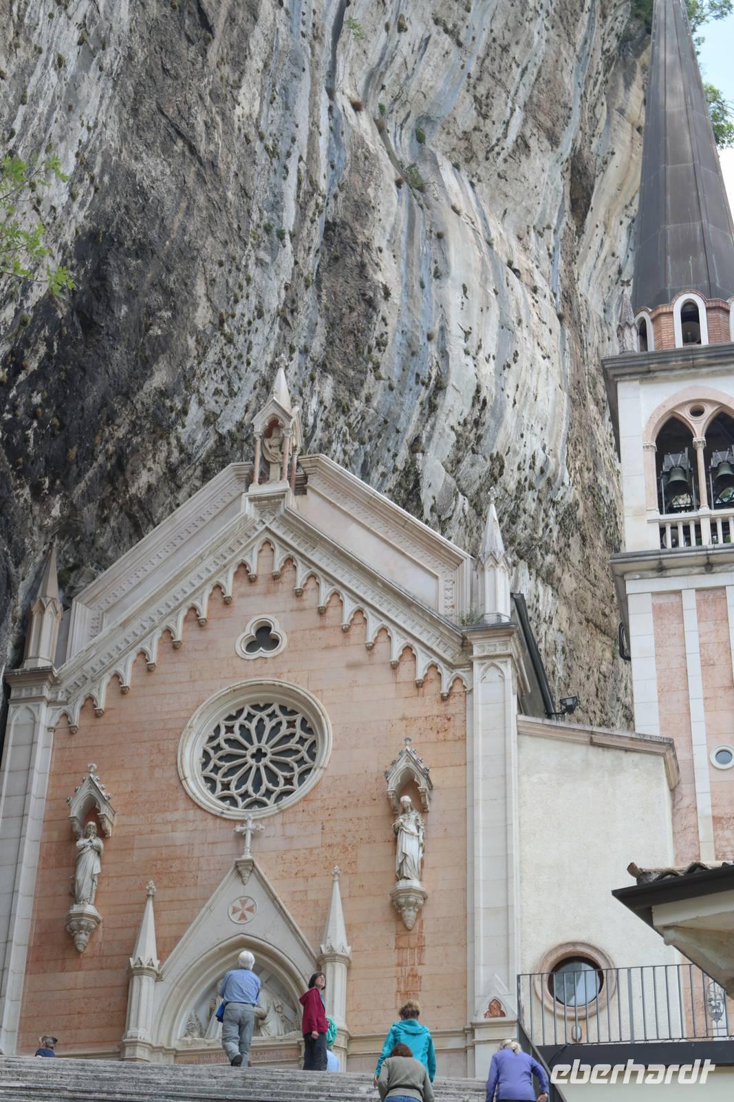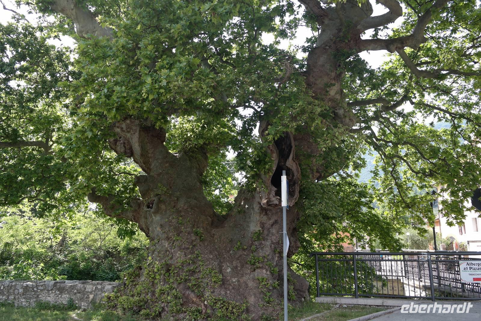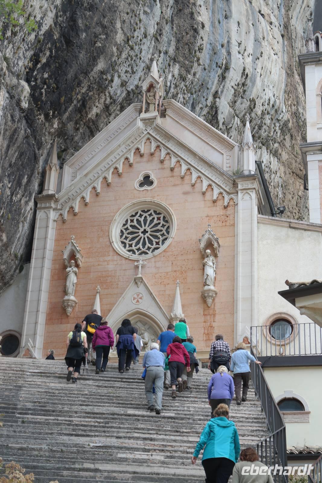 In der Rifugio Novezzina warten wir auf die Gruppe. Mehrere italiensichen Schulklassen erfüllen den botanischen Garten mit Gewusel und Lärm - nachdem wir uns alle erholt haben brechen wir auf und fahren nach Spiazzi. Der Wallfahrtsort der "Madonna delle corona" zieht jährlich zig Tausende von Besuchern an - aber wir haben Glück: in strahlendem Sonnenschein und fast frei von Pilgern und Touristen scheint die Madonna auf unsere Gruppe gewartet zu haben. Spektakulär schmiegt sich die Wallfahrtskirche 700 m über der Etsch so eng an den Felsen, man meint, sie sei mit ihm vereint. Wir sind ergriffen von diesem Bild und hören andächtig unserem Wolfgang zu. Auf dem Weg zur Kirche wird in Bronzeskulpturen die Passion Christi verdeutlicht. Als wir die Treppe zur Kirche hinauf steigen, erinnern wir uns an Wolfsgang Worte: Nur wer an Wunder glaubt, wird ihnen auch begegnen. Irgendwie mag er damit Recht haben, denn wir haben uns die ganze Woche in aller Bescheidenheit nur gutes Wetter und keine Verletzungen gewünscht. Beides ist eingetreten - der Madonna sei Dank. Wir genießen Augenblickeder Ruhe und Besinnung in der Kirche, die schlicht und einfach ausgestattet und doch so imposant ist. Beeindruckt und ergriffen verlassen wir die Wallfahrtskirche und treffen uns in Spiazzi, um unsere tolle Wanderreise gemeinsam mit Wolfgang ausklingen zu lassen. Auf dem Rückweg machen wir einen kleinen Schlenker über Platano und sehen hier eine über 800 Jahre alte Platane, die auch so ihre Geschichten birgt. Zurück in Garda beginnen wir, die letzten Tage Revue passieren zu lassen und nehmen Abschied vom Gardasee.