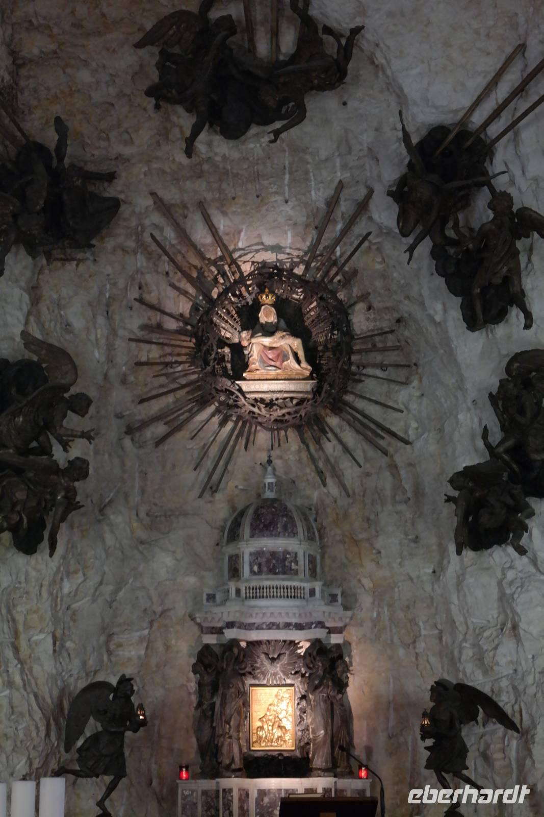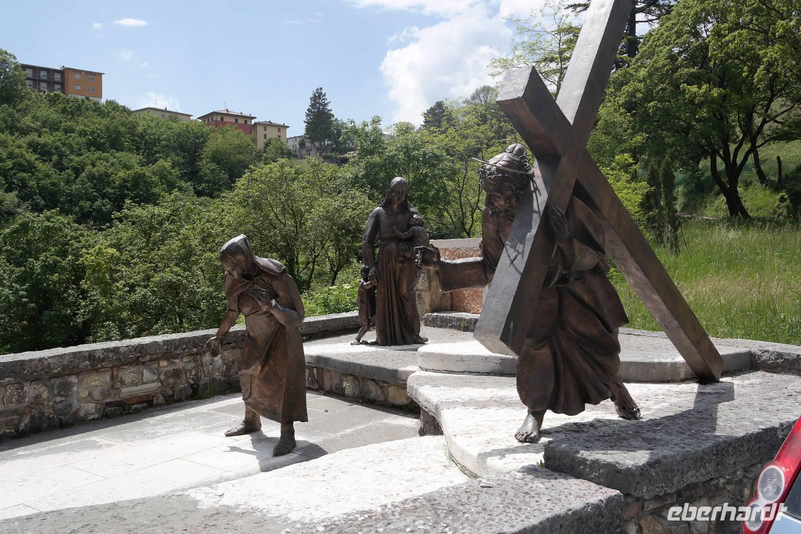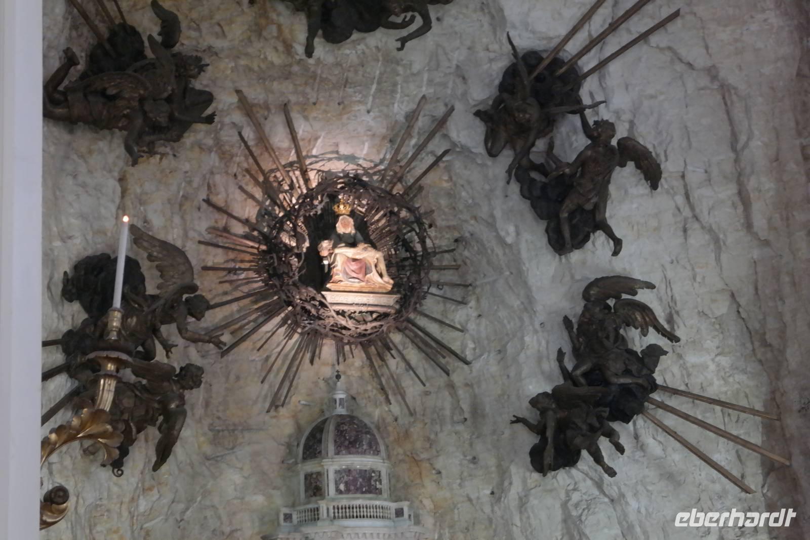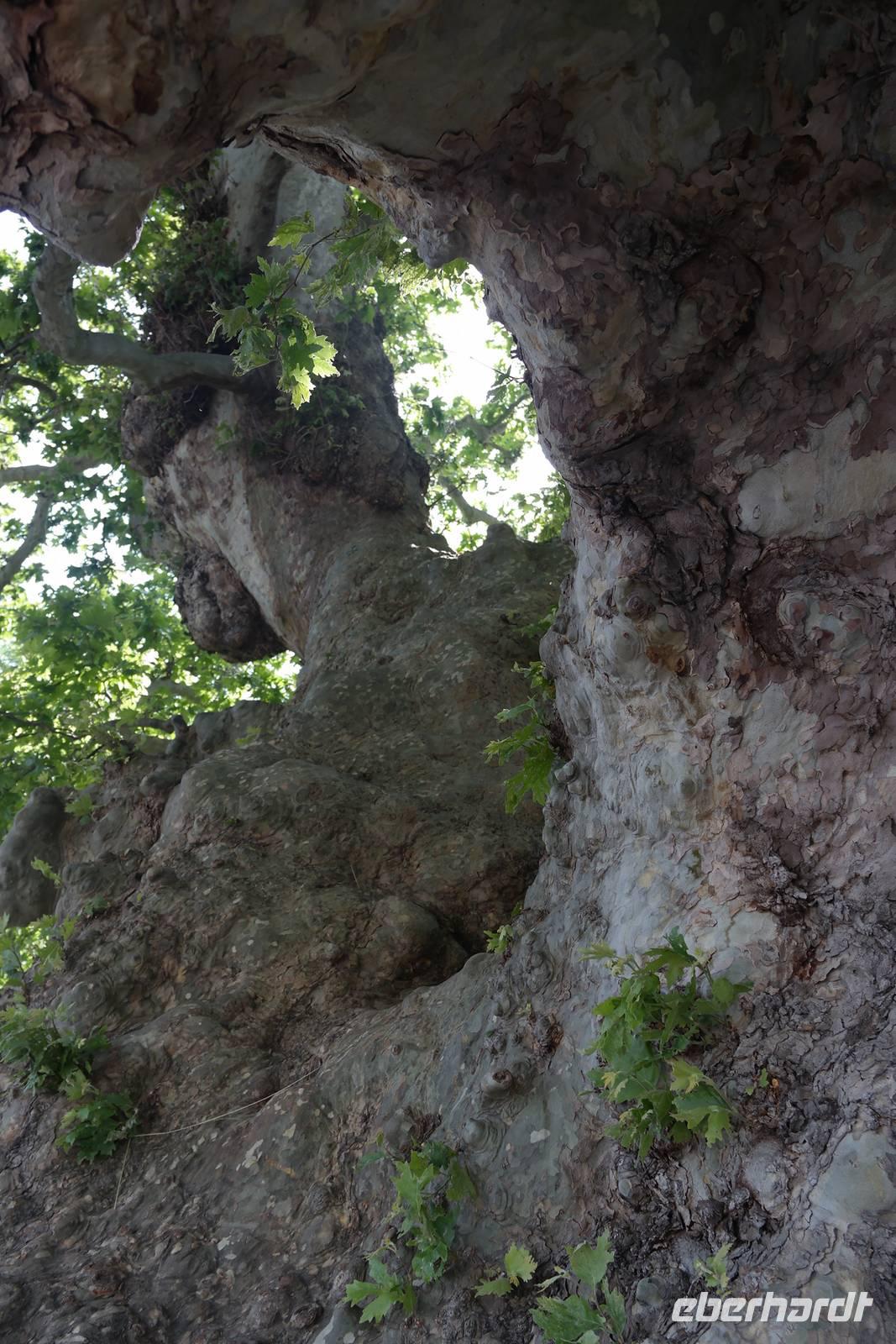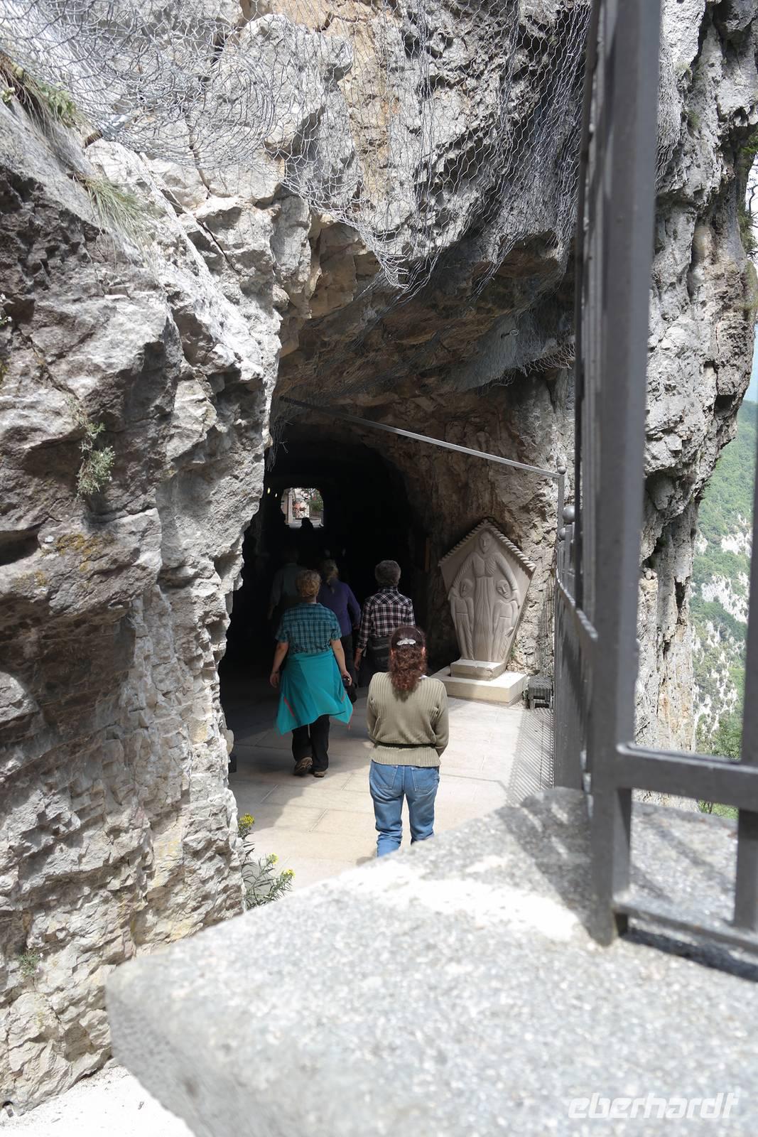 In der Rifugio Novezzina warten wir auf die Gruppe. Mehrere italiensichen Schulklassen erfüllen den botanischen Garten mit Gewusel und Lärm - nachdem wir uns alle erholt haben brechen wir auf und fahren nach Spiazzi. Der Wallfahrtsort der "Madonna delle corona" zieht jährlich zig Tausende von Besuchern an - aber wir haben Glück: in strahlendem Sonnenschein und fast frei von Pilgern und Touristen scheint die Madonna auf unsere Gruppe gewartet zu haben. Spektakulär schmiegt sich die Wallfahrtskirche 700 m über der Etsch so eng an den Felsen, man meint, sie sei mit ihm vereint. Wir sind ergriffen von diesem Bild und hören andächtig unserem Wolfgang zu. Auf dem Weg zur Kirche wird in Bronzeskulpturen die Passion Christi verdeutlicht. Als wir die Treppe zur Kirche hinauf steigen, erinnern wir uns an Wolfsgang Worte: Nur wer an Wunder glaubt, wird ihnen auch begegnen. Irgendwie mag er damit Recht haben, denn wir haben uns die ganze Woche in aller Bescheidenheit nur gutes Wetter und keine Verletzungen gewünscht. Beides ist eingetreten - der Madonna sei Dank. Wir genießen Augenblickeder Ruhe und Besinnung in der Kirche, die schlicht und einfach ausgestattet und doch so imposant ist. Beeindruckt und ergriffen verlassen wir die Wallfahrtskirche und treffen uns in Spiazzi, um unsere tolle Wanderreise gemeinsam mit Wolfgang ausklingen zu lassen. Auf dem Rückweg machen wir einen kleinen Schlenker über Platano und sehen hier eine über 800 Jahre alte Platane, die auch so ihre Geschichten birgt. Zurück in Garda beginnen wir, die letzten Tage Revue passieren zu lassen und nehmen Abschied vom Gardasee.