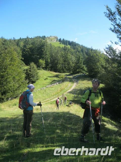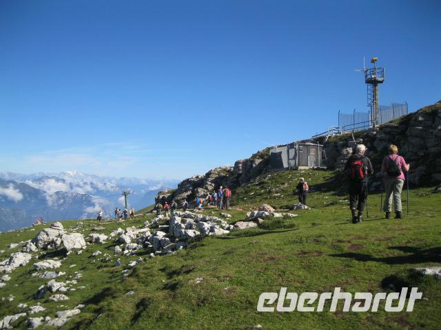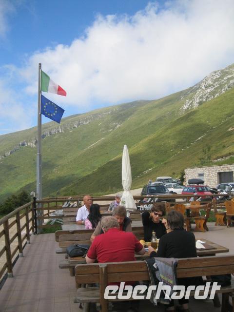 Wir fuhren nach Malcesine um, mit der Panorama Gondel Bahn, die Gipfelstation "Tratto Spin"zu erreichen.(Dort mußte zuerst die AUE -Vereinsfahne gehißt werden.)Es ist der Ausgangspunkt unserer heutigen Tour.Zuerst gehts leicht los, über Bergwiesen ,an einer Sennerei vorbei.Doch schon bald wird es mühevoller und die Gruppe teilt sich.Die "Bergsteiger" gehen zum Altissimo hinauf u.der "Rest"läuft zum Refugio ,wo wir uns alle wieder treffen wollen, um den gemeinsamen Weg zum Bus zu gehen.Nach dieser Königsetappe haben wir uns einen eisgekühlten Limocello (am Bus in San Giaccomo) verdient.