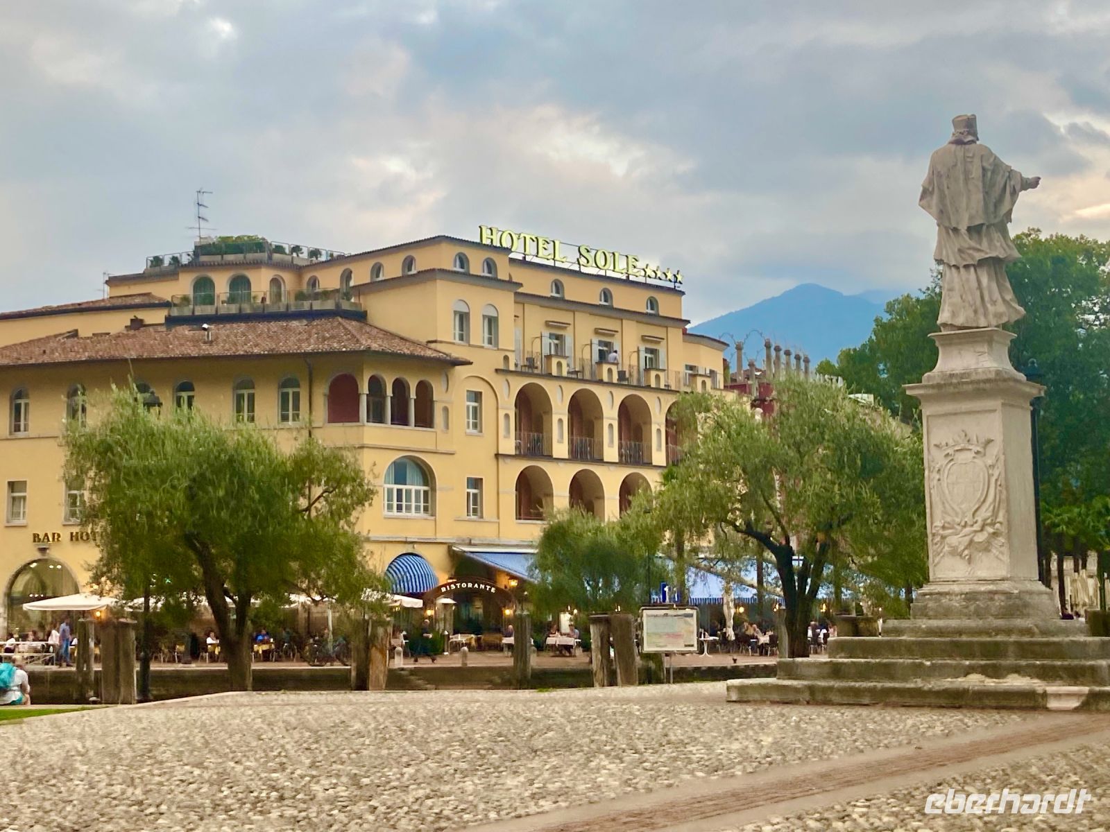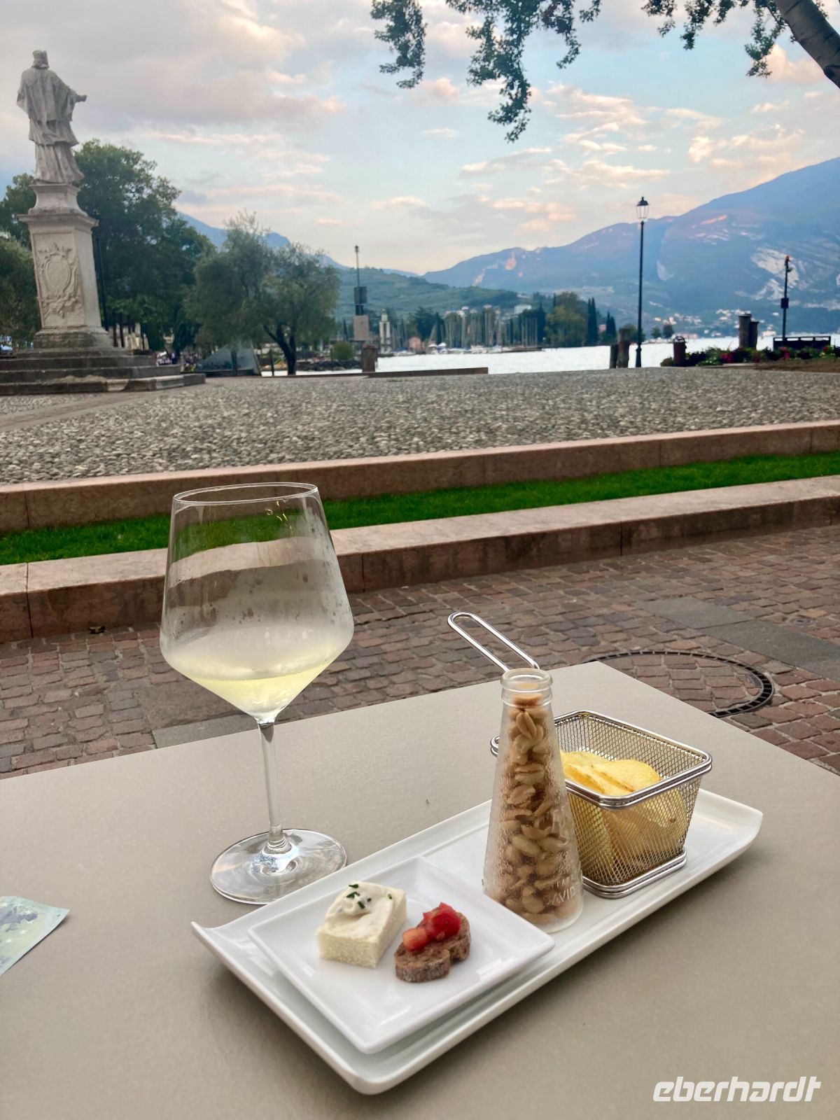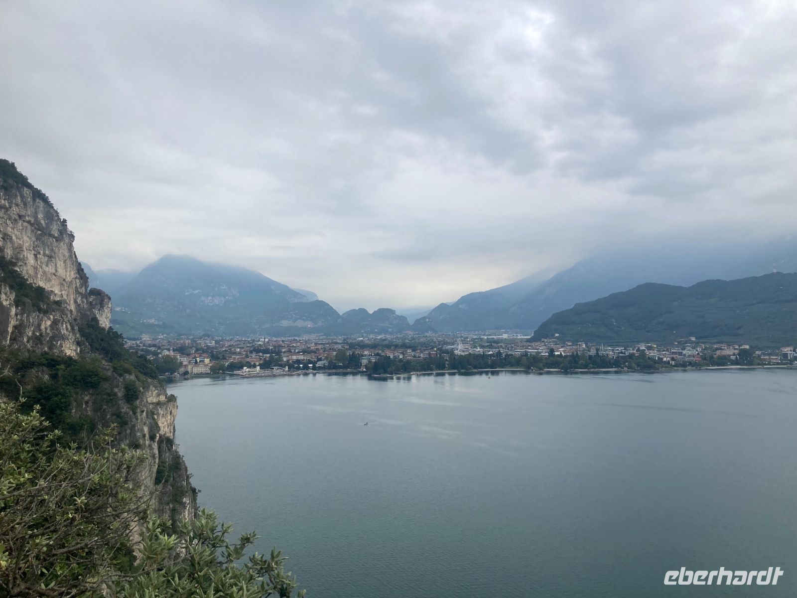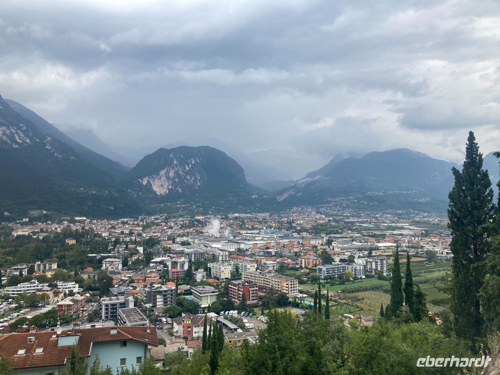 Die altbekannte italienische Sonne lies sich nicht blicken, es regnete am Morgen. Und so starteten wir erst 10:30 Uhr und hofften für die kurze Einwanderrunde eine Regenlücke zu finden. Wir waren alle froh an diesem Morgen etwas mehr Zeit zu haben, die Reise von Dresden bis an den Gardasee dauert halt etwas. Am Anfang ging es durch den Ort ( 18.000 Einwohner) am See entlang. Etliche Treppen führten uns auf den knapp 400 m hohen Monte Brione. Immerhin etwas über 300 Höhenmeter waren es und auf Grund der sehr unterschiedlichen Treppenstufen war es doch etwas beschwerlich. Abwärts nahmen wir den Fahrweg und so wurde es etwas knieschonender. Belohnt wurden wir dann mit leckerem Eis in der Eisdiele Flora. Das Eis wurde in internationalen Wettbewerben mit mehreren Medaillen ?? ausgezeichnet, dementsprechend war es ein Genuss. Auch auf Grund des Stadtrundganges mit Barbara, unserer Wanderführerin, hatten wir dann über 10 km auf der Uhr. Nach dem ersten Abendessen waren wir uns sicher, mit dem Abnehmen wird das nichts. Zumal wir uns mit der Bar neben dem Hotel schnell anfreundeten.