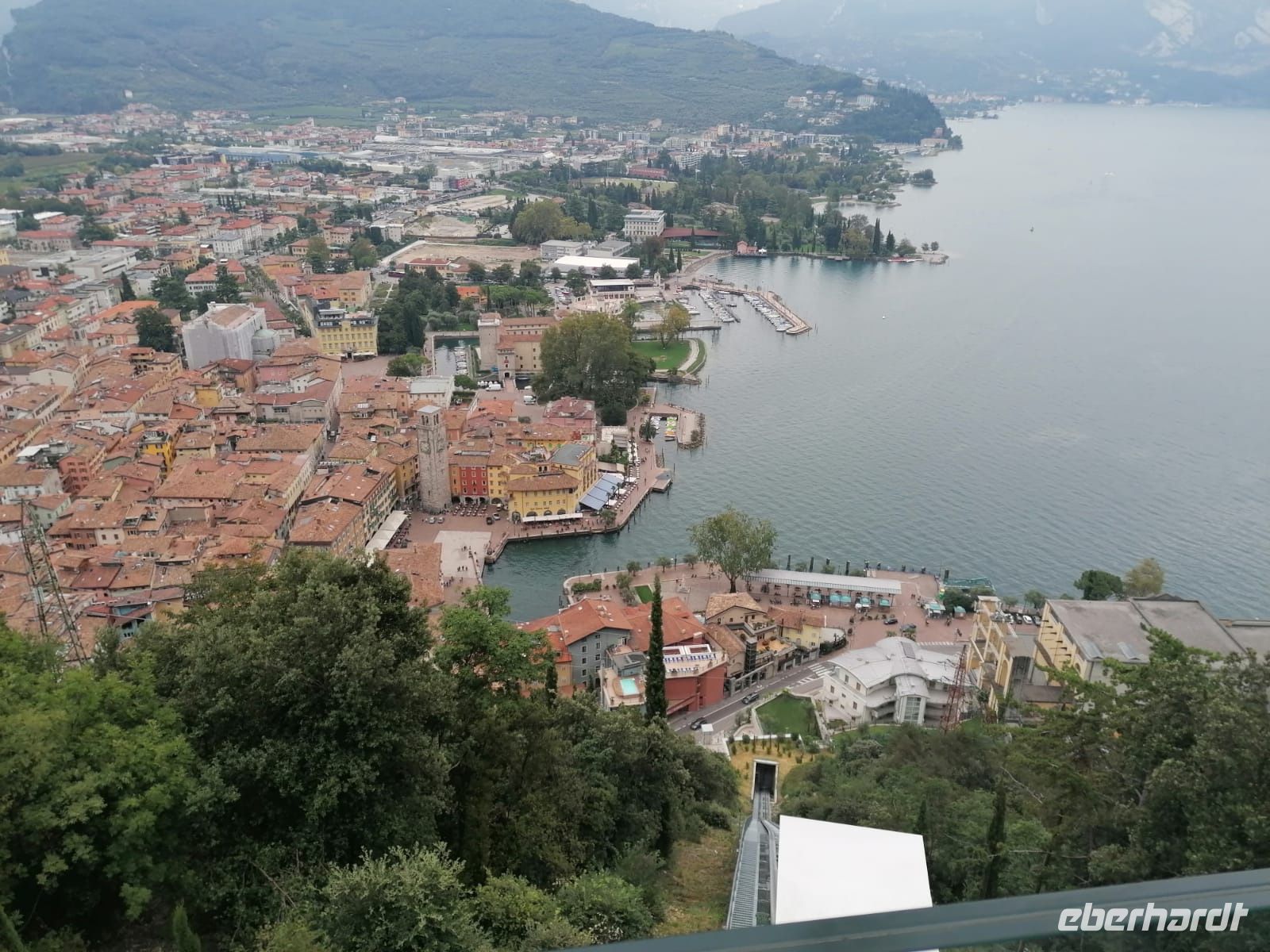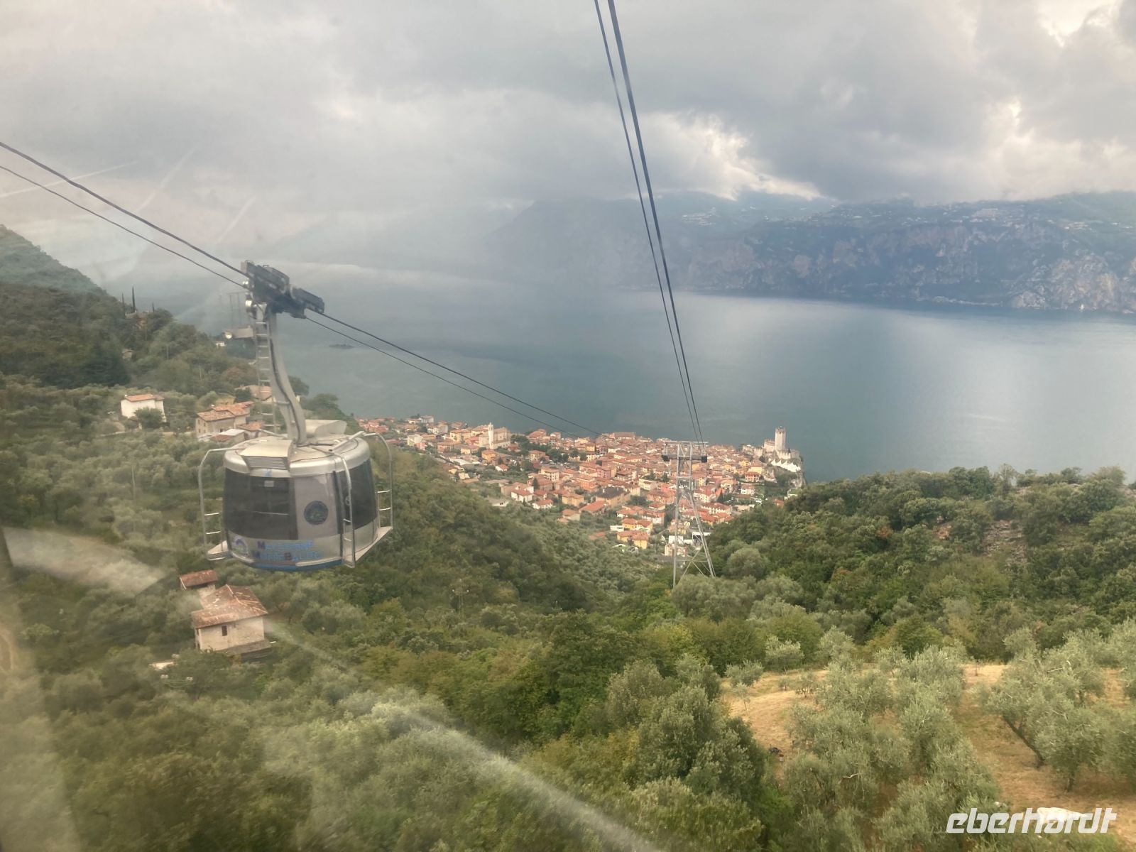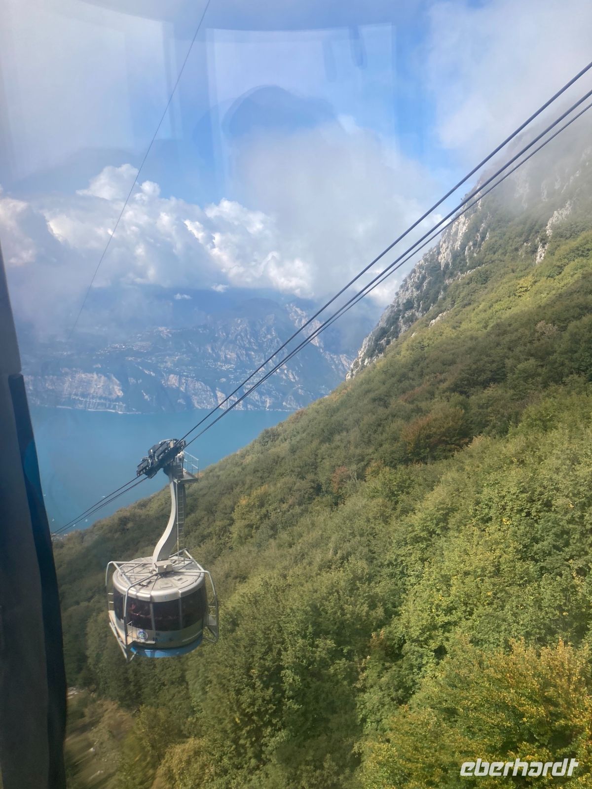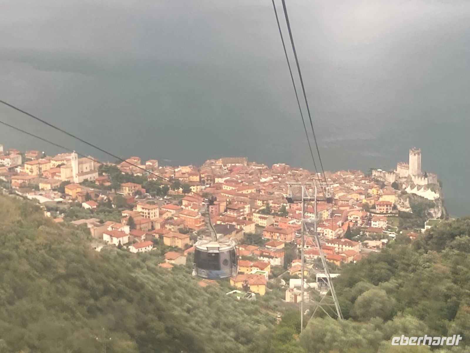 Ein Erlebnis der besonderen Art erwartet uns. Eine Seilbahnfahrt, wo sich die Gondel um die eigene Achse dreht. Erinnerungen an den Berliner Fernsehturm werden wach. Und wir genießen es, bis wir im Nebel versinken. Oben angekommen ist es reichlich kühl, nur 7 Grad… Wir lassen uns nicht irritieren und ziehen unsere Wanderung durch. Und wir werden belohnt. Die Wolken reisen auf und uns bietet sich ein traumhafter Blick auf den See. Barbara unser Wanderleiterin ist stolz auf uns, da wir uns nicht entmutigen lassen und gut drauf sind. Daraufhin beschließen wir auf dem Gipfel ein zu kehren und uns zu belohnen. Später dann fahren wir bis zur Mittelstation um zu Fuß noch paar Kilometer zu machen. Der Weg meint es nicht ganz so gut mit uns und wir erahnen wie beschwerlich früher so mancher Weg war. Wir erreichen Malcesine, Barbara führt uns durch den Ort und wir kreuzen doch tatsächlich den Weg einer anderen Eberhardtgruppe. Sie machen eine Rundreise am Gardasee. Die Freizeit in Malcesine verbringen wir mit schoppen, Eis essen oder bei Pasta. Zurück nach Riva gehts per Bus und wir genießen die Aussichten auf den See, wo der zunehmende Wind immer mehr Surfer anlockt.