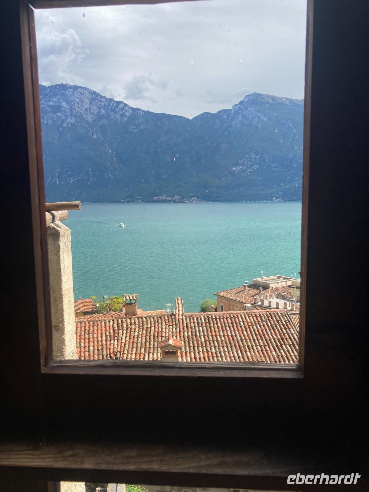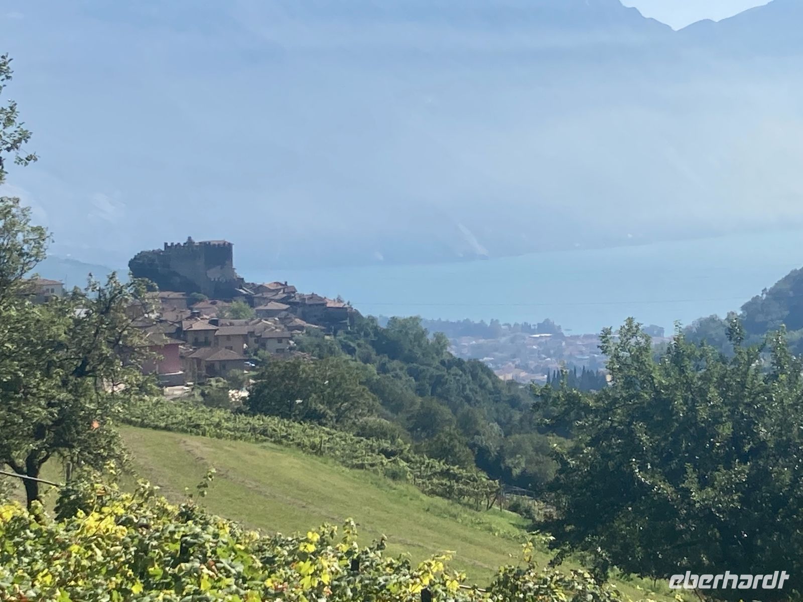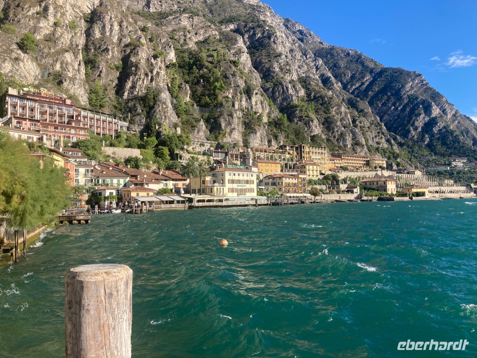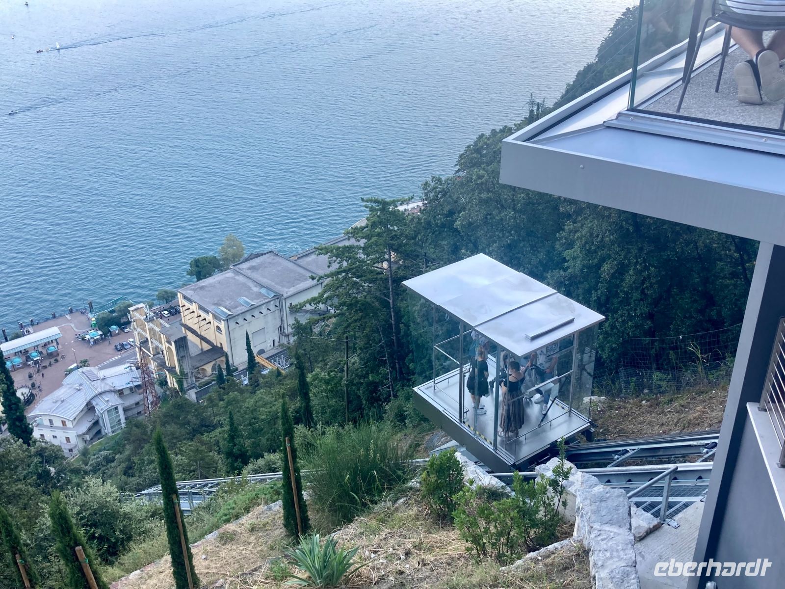 Ein Erlebnis der besonderen Art erwartet uns. Eine Seilbahnfahrt, wo sich die Gondel um die eigene Achse dreht. Erinnerungen an den Berliner Fernsehturm werden wach. Und wir genießen es, bis wir im Nebel versinken. Oben angekommen ist es reichlich kühl, nur 7 Grad… Wir lassen uns nicht irritieren und ziehen unsere Wanderung durch. Und wir werden belohnt. Die Wolken reisen auf und uns bietet sich ein traumhafter Blick auf den See. Barbara unser Wanderleiterin ist stolz auf uns, da wir uns nicht entmutigen lassen und gut drauf sind. Daraufhin beschließen wir auf dem Gipfel ein zu kehren und uns zu belohnen. Später dann fahren wir bis zur Mittelstation um zu Fuß noch paar Kilometer zu machen. Der Weg meint es nicht ganz so gut mit uns und wir erahnen wie beschwerlich früher so mancher Weg war. Wir erreichen Malcesine, Barbara führt uns durch den Ort und wir kreuzen doch tatsächlich den Weg einer anderen Eberhardtgruppe. Sie machen eine Rundreise am Gardasee. Die Freizeit in Malcesine verbringen wir mit schoppen, Eis essen oder bei Pasta. Zurück nach Riva gehts per Bus und wir genießen die Aussichten auf den See, wo der zunehmende Wind immer mehr Surfer anlockt.