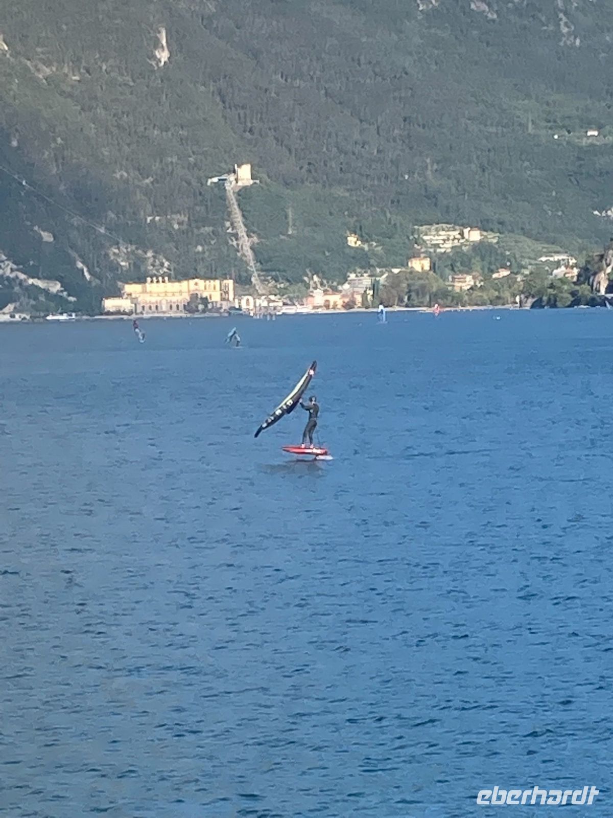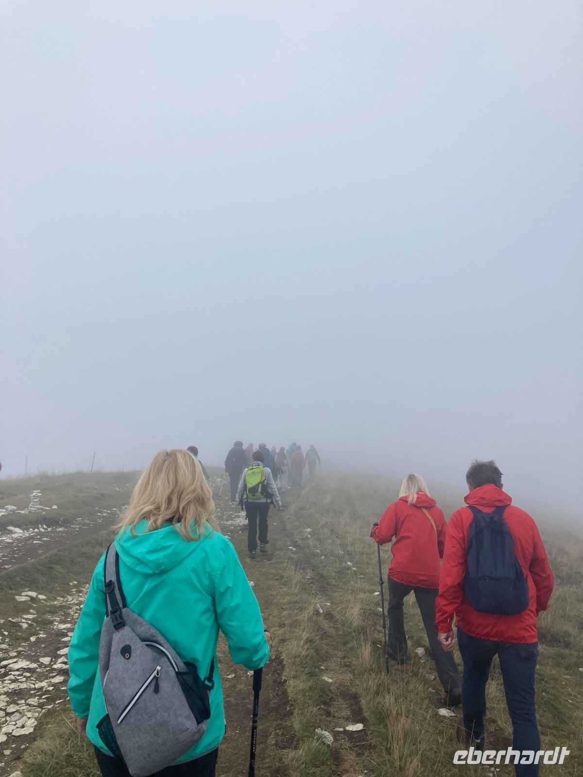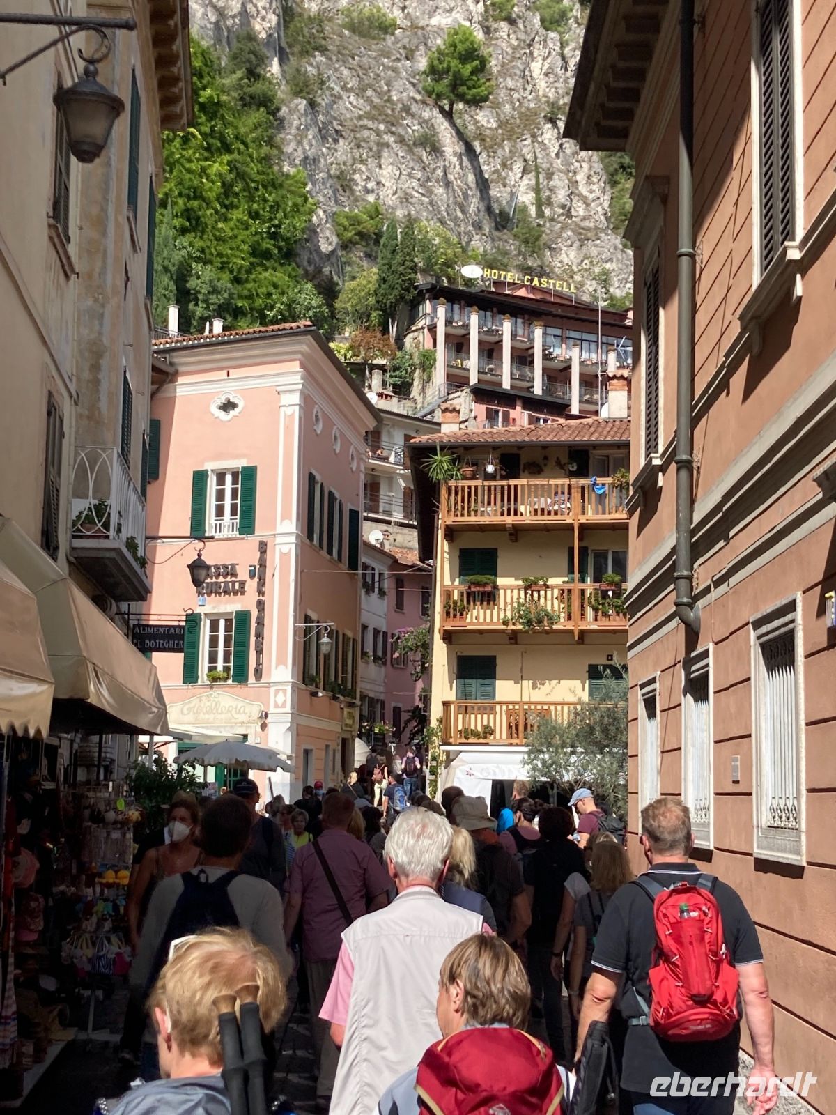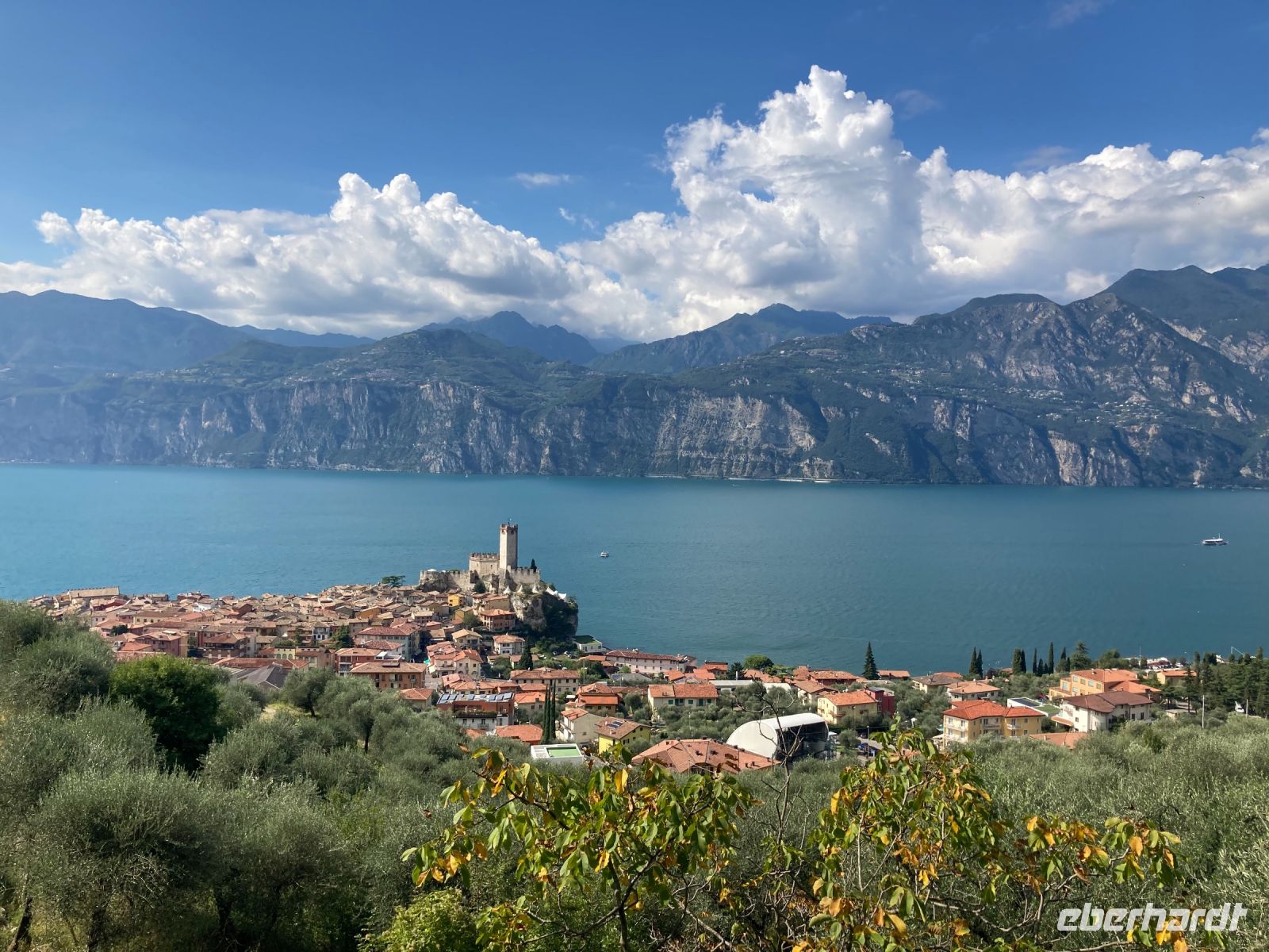 Ein Erlebnis der besonderen Art erwartet uns. Eine Seilbahnfahrt, wo sich die Gondel um die eigene Achse dreht. Erinnerungen an den Berliner Fernsehturm werden wach. Und wir genießen es, bis wir im Nebel versinken. Oben angekommen ist es reichlich kühl, nur 7 Grad… Wir lassen uns nicht irritieren und ziehen unsere Wanderung durch. Und wir werden belohnt. Die Wolken reisen auf und uns bietet sich ein traumhafter Blick auf den See. Barbara unser Wanderleiterin ist stolz auf uns, da wir uns nicht entmutigen lassen und gut drauf sind. Daraufhin beschließen wir auf dem Gipfel ein zu kehren und uns zu belohnen. Später dann fahren wir bis zur Mittelstation um zu Fuß noch paar Kilometer zu machen. Der Weg meint es nicht ganz so gut mit uns und wir erahnen wie beschwerlich früher so mancher Weg war. Wir erreichen Malcesine, Barbara führt uns durch den Ort und wir kreuzen doch tatsächlich den Weg einer anderen Eberhardtgruppe. Sie machen eine Rundreise am Gardasee. Die Freizeit in Malcesine verbringen wir mit schoppen, Eis essen oder bei Pasta. Zurück nach Riva gehts per Bus und wir genießen die Aussichten auf den See, wo der zunehmende Wind immer mehr Surfer anlockt.