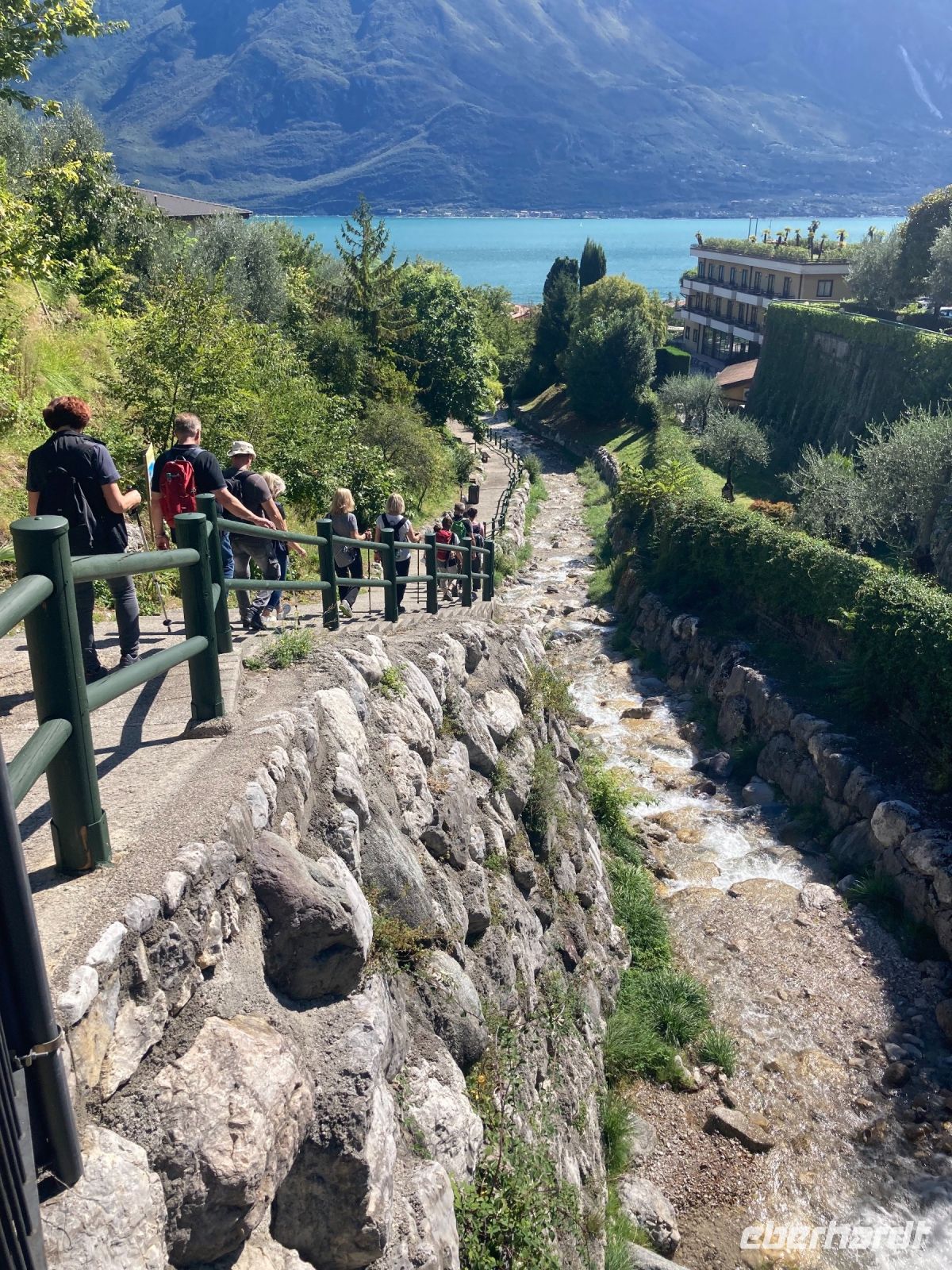 Wir starteten mit dem Schiff 8:45 Uhr, ja der frühe Wurm….. Zum Glück ging es nicht direkt nach Limone sondern über Torbole. So konnten wir die Fahrt etwas länger genießen und die Surfer bewundern. Manche hatten so ein Drive, dass sie vom See abhoben und förmlich auf dem Schwert fuhren. Unser Weg führte uns durch das schöne Örtchen Limone ( 1.150 Einwohner) und anschließend am Ufer entlang. 10.000 Tagestouristen hat Limone in der Hochsaison. 7.000 Gästebetten stehen zur Verfügung. Über etliche Stufen, immer am Bach entlang erreichten wir unser erstes Ziel, eine Ölmühle. In der Genossenschaft Possidenti Olivieti wird extra natives Olivenöl, das DOC „Garda bresciano“ produziert. Es zählt zu den besten Olivenölen der Welt. 600 Genossenschaftsmitglieder liefern die Oliven, voriges Jahr wurden 3.000 kg handverlesene Oliven geerntet. Für diese Jahr erwartet man eine deutlich schlechtere Ernte. Der Sommer war auch hier nicht so, wie üblicherweise. Weiter gehts und wir steigen auf und entdecken eine gemütliche Einkehr, an der wir nicht vorbei kommen. Nach der Rast geht es über einen Höhenweg wieder hinab Richtung Limone. Unterwegs machen wir halt am ehemaligen Wohnsitz des Missionars Comboni. Bald ist Limone erreicht und wir besichtigen einen der wenigen erhaltenen Zitronenanbaustätten, welche auch ein wenig musealen Charakter trägt. Dankbar sind wir für etwas Freizeit im wunderschönen Ort Limone. Und per Schiff genießen wir die schöne Rückfahrt.