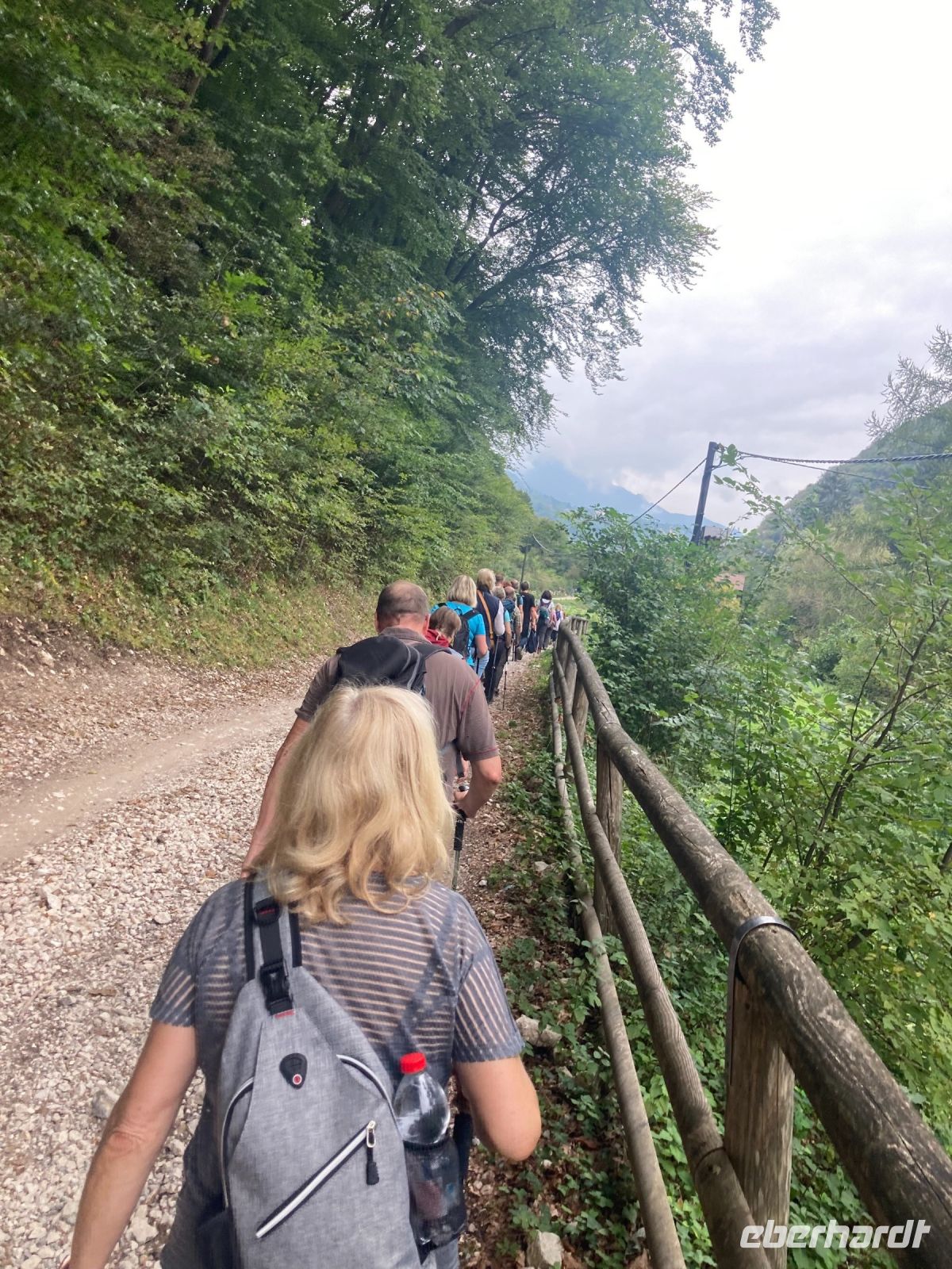 Heute wird es besonders spannend. Die heutige Wanderung beginnt direkt am Hotel. Wir durchschreiten Riva Richtung Süden und erreichen sehr bald die alte Passstraßen Ponale Richtung Ledrotal. Die ursprünglich asphaltierte Straßen wurde zurückgebaut, um ihr wieder ihren ursprünglichen Charakter zu geben. Immer weiter geht es hoch und es bieten sich uns traumhafte Ausblicke auf den Gardasee aber auch ins Ledrotal. Massenhaft Radfahrer begleiten uns, die wenigsten ohne Schummelantrieb. Angekommen an einer fünf Meter hohen Madonna, gibt es ein Gruppen(Gipfel)foto und weiter geht es das Ledrotal sacht bergauf. Wir erreichen das Zwischenziel Pre und den Bus der uns die letzten Kilometer an den Ledrosee fährt. Pizzaessen ist gebucht und die Wahl fällt uns nicht leicht. Einige Gäste besuchen noch das Pfahlbaumuseum, einige genießen die Ruhe am See. Seitens Barbara werden wir die Red Bull Gruppe genannt, des Tempo wegen natürlich.