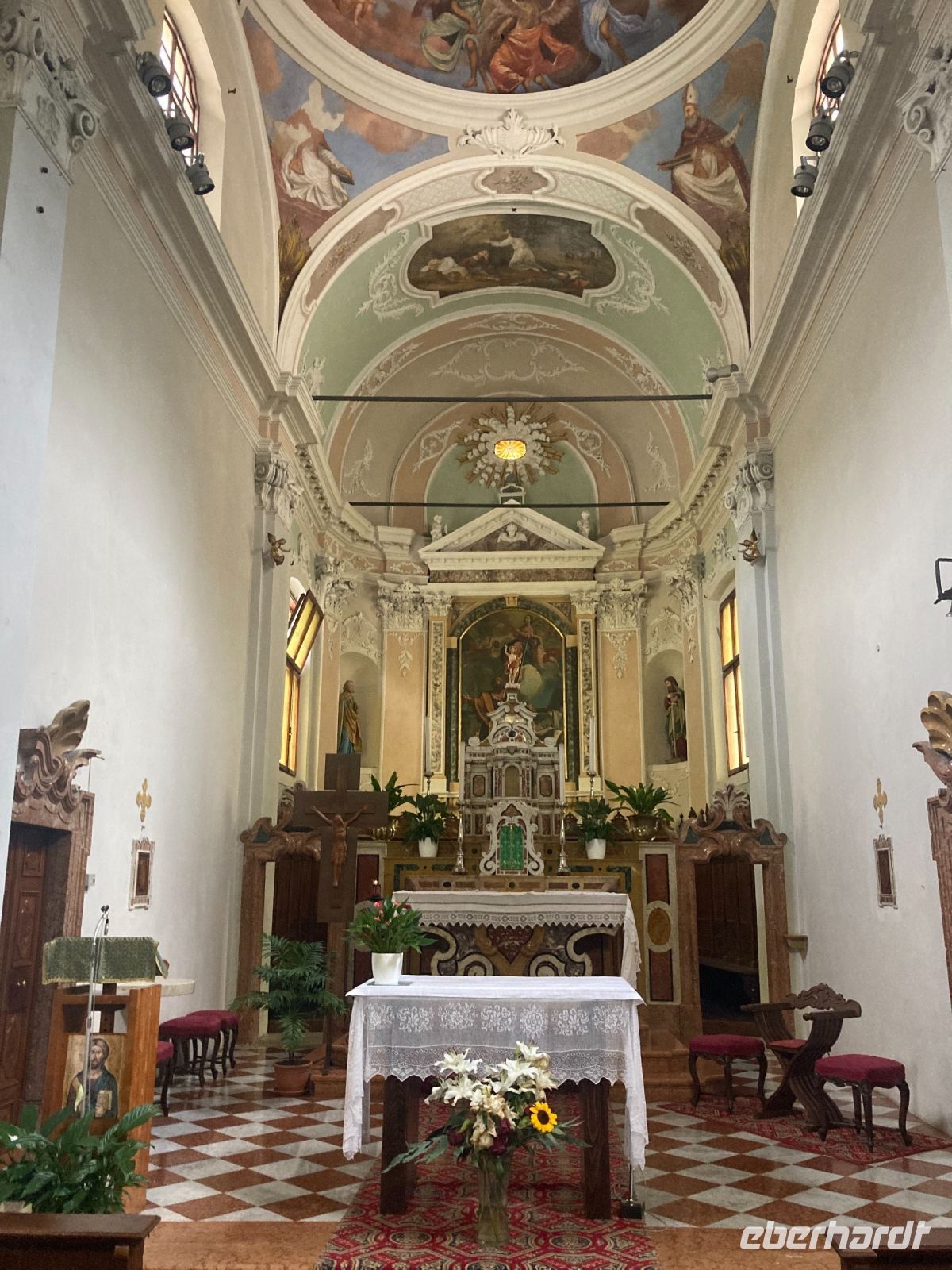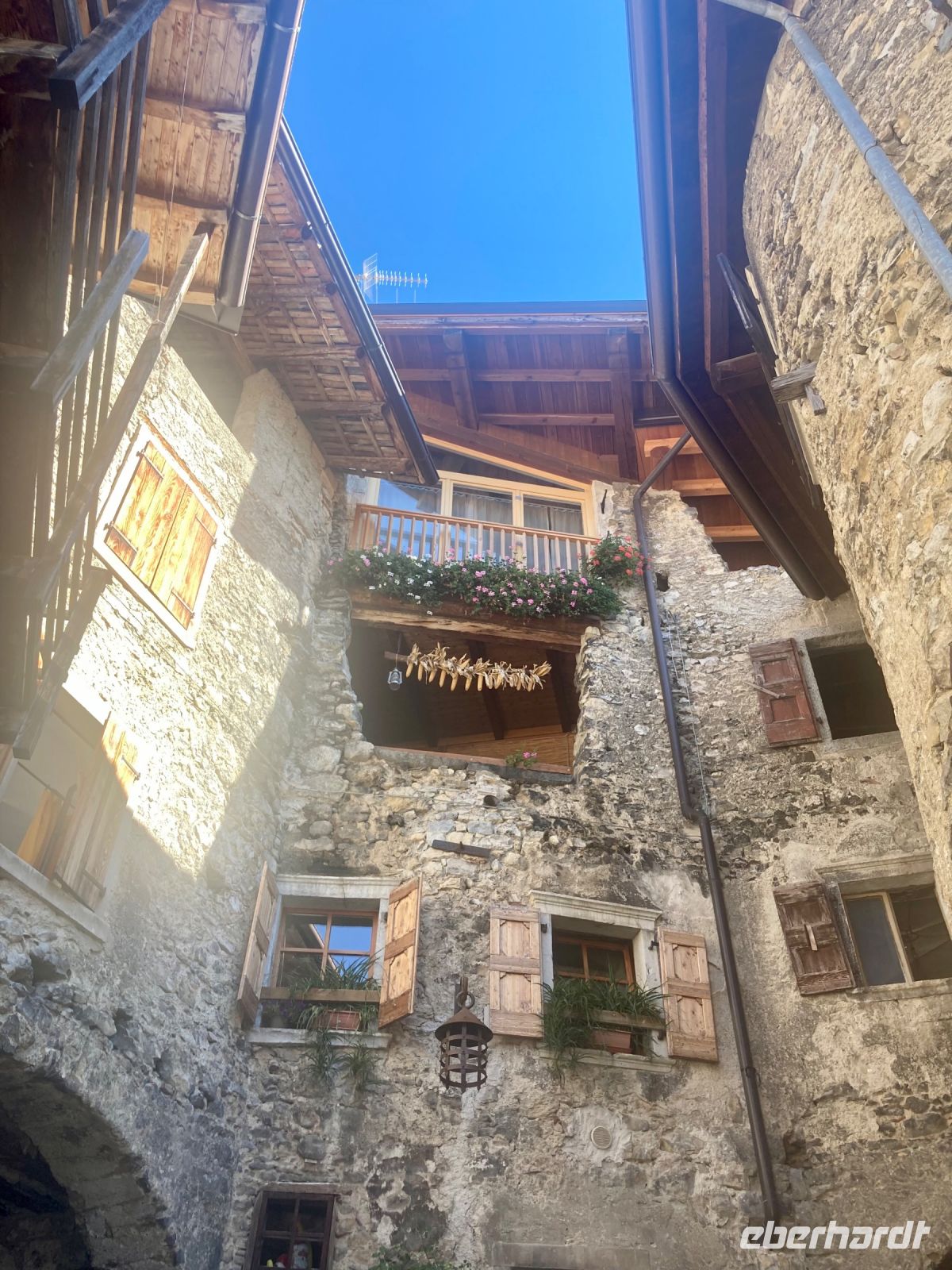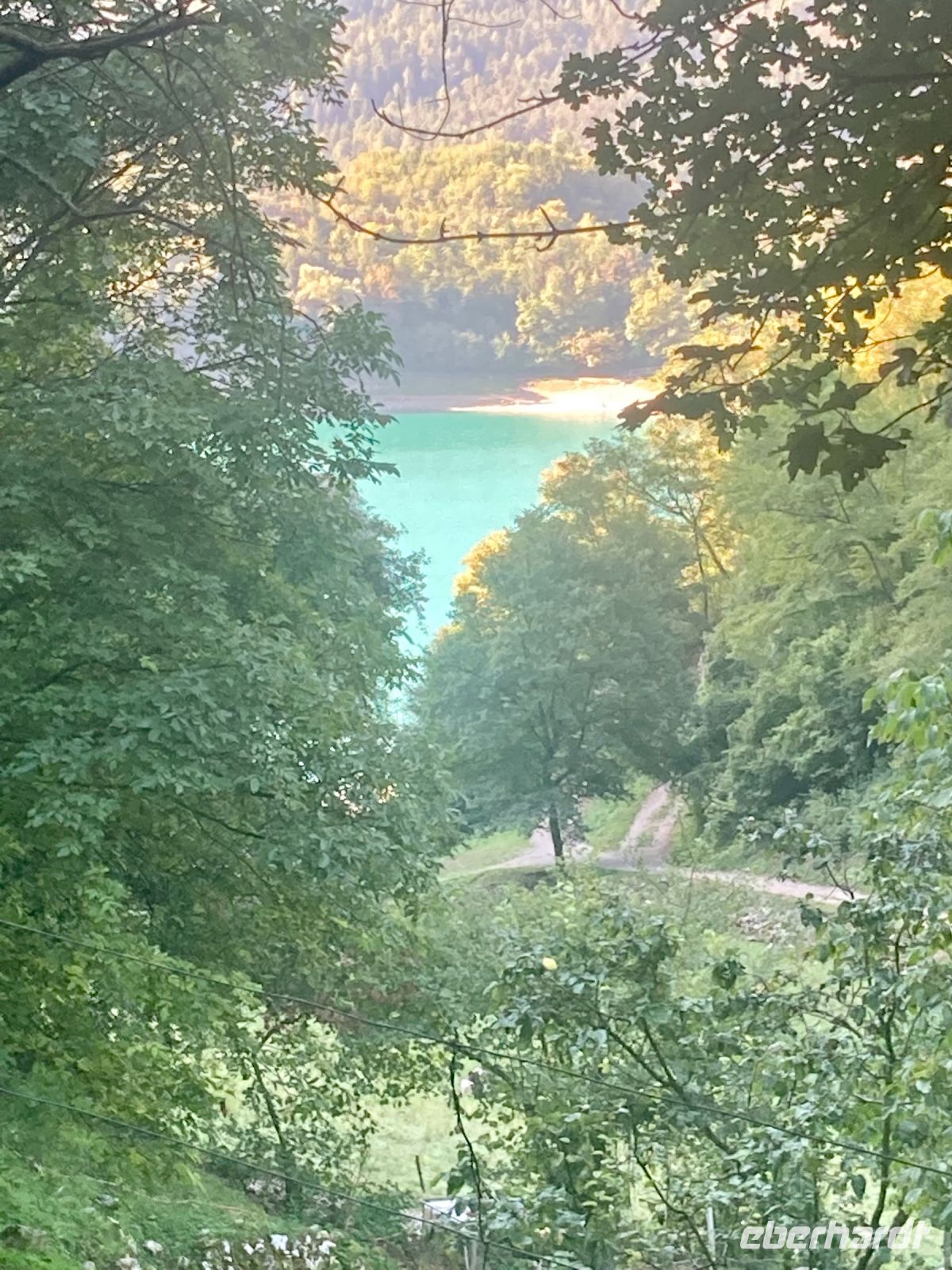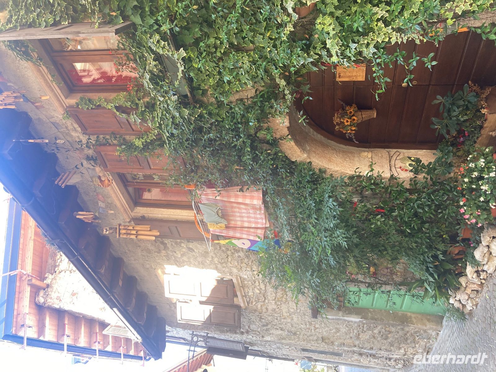 Heute nutzen wir den Bus als Aufstiegshilfe. Der Tennosee auf 570 Metern ist unser erstes Ziel.Wir wandern gemächlich durch den Wald bergan. Die herrliche türkisfarbige Farbe des Sees lugt gelegentlich durch die Bäume und bald begrüßt uns der See. Der Farbe wegen, die auch mal himmelblau sein kann, wird er auch Lago Azzurro genannt. Wir sind überwältigt und umrunden den See zur Hälfte. Der See wird vom Flüsschen Rio Secco :-) gespeist und hat keinen Abfluss. Dennoch erreicht Sickerwasser von hier aus den Gardasee. Der See ist nur 0,25 Quadratkilometer groß, kann aber bei größeren Niederschlägen um 15 Meter ansteigen. Dieser See gilt als einer der saubersten Süßwasserseen Italiens. Nach einer ausgiebigen Rast geht es weiter nach Canale, dem Künstlerdorf. Nach dem Museumsbesuch erwartet uns ein regionales Mittagessen. Der Schattenplatz im Hof des Agrotouristikrestaurants gefällt uns so gut, dass liebend gern noch geblieben wären. Doch der Bus für die Rückfahrt ist bestellt.
