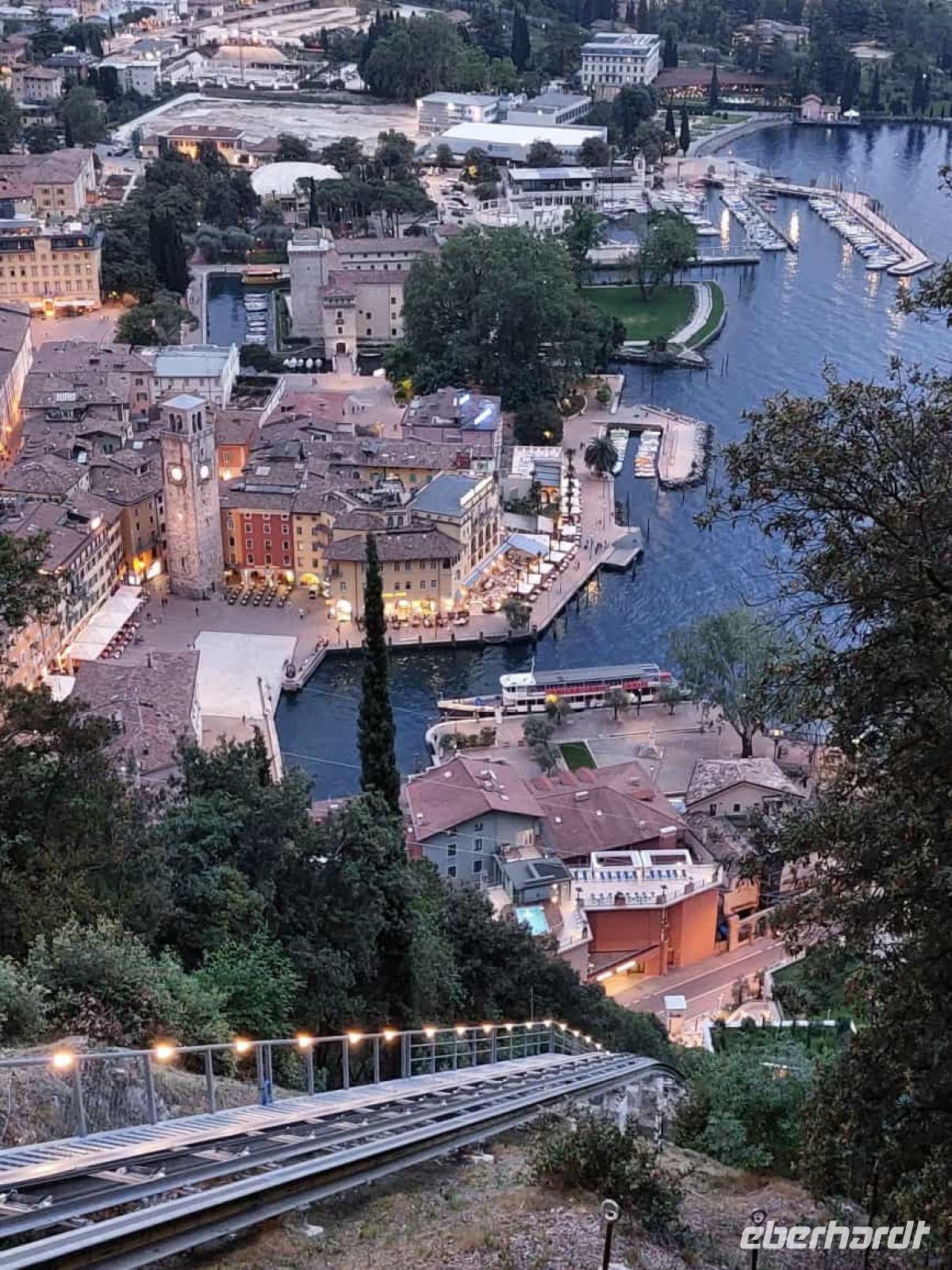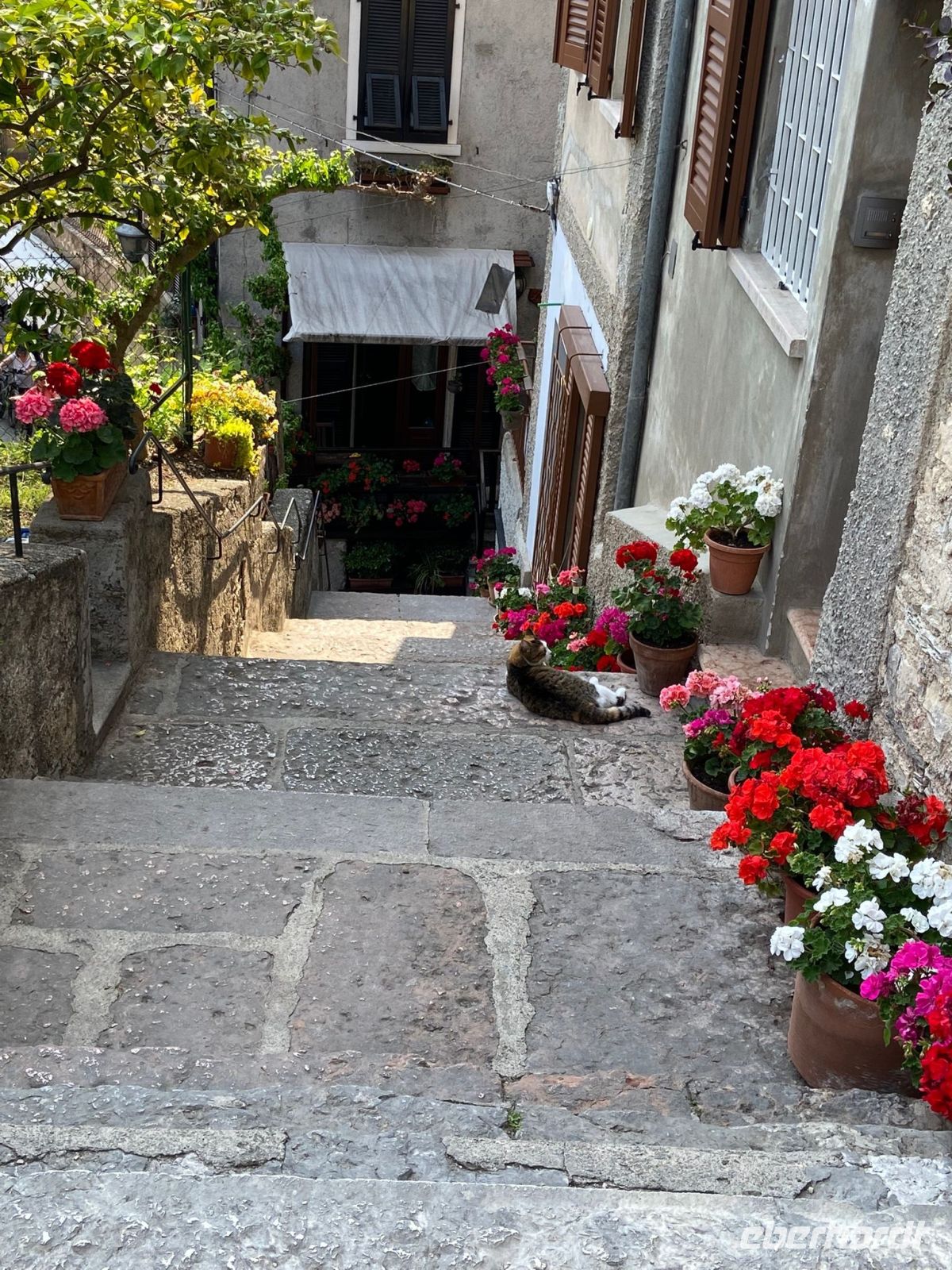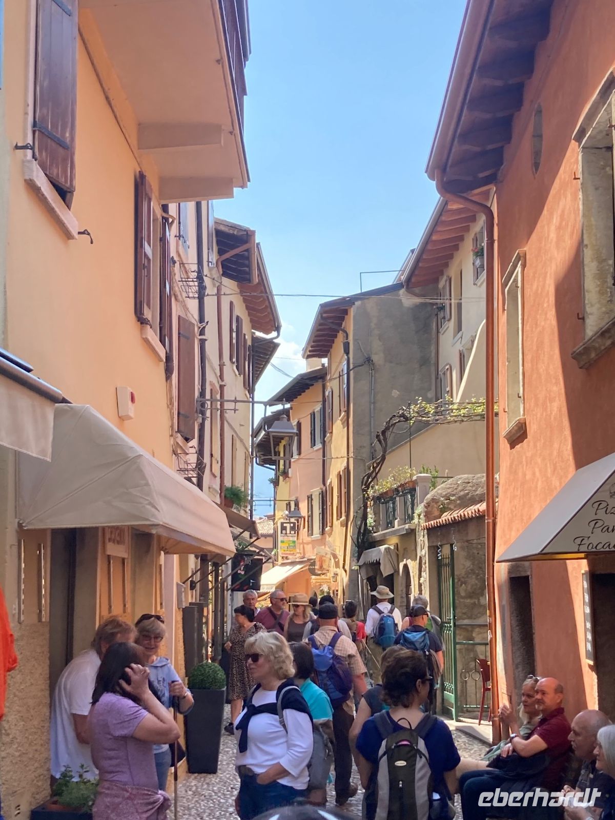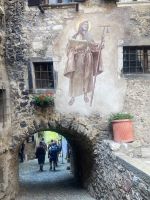 Nach der Talfahrt durchstöberten wir noch das malerische Städtchen Malcesine (3.700 Einwohner).Der Ort wird von der Skaligerburg stark dominiert. Diese thront über dem mittelalterlichen Ortskern. Kleine Gässchen, malerische Plätze, überwölbte Durchgänge und auch etwas holprige Wege faszinieren uns. Auch bot sich reichlich Gastronomie und so viel Wahl schwer, ja irgendwann musste oder sollte man sich entscheiden. Auf der Rückfahrt mit dem Bus konnten wir noch am Stadtende den Landeplatz der Gleitschirmfliger erkennen.