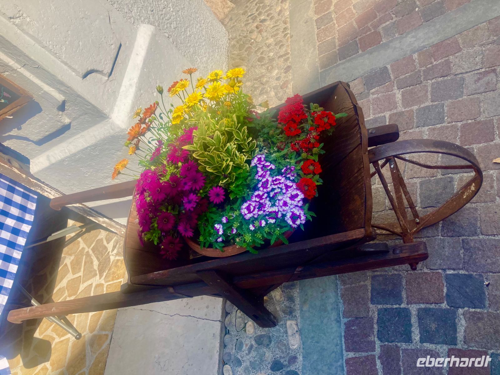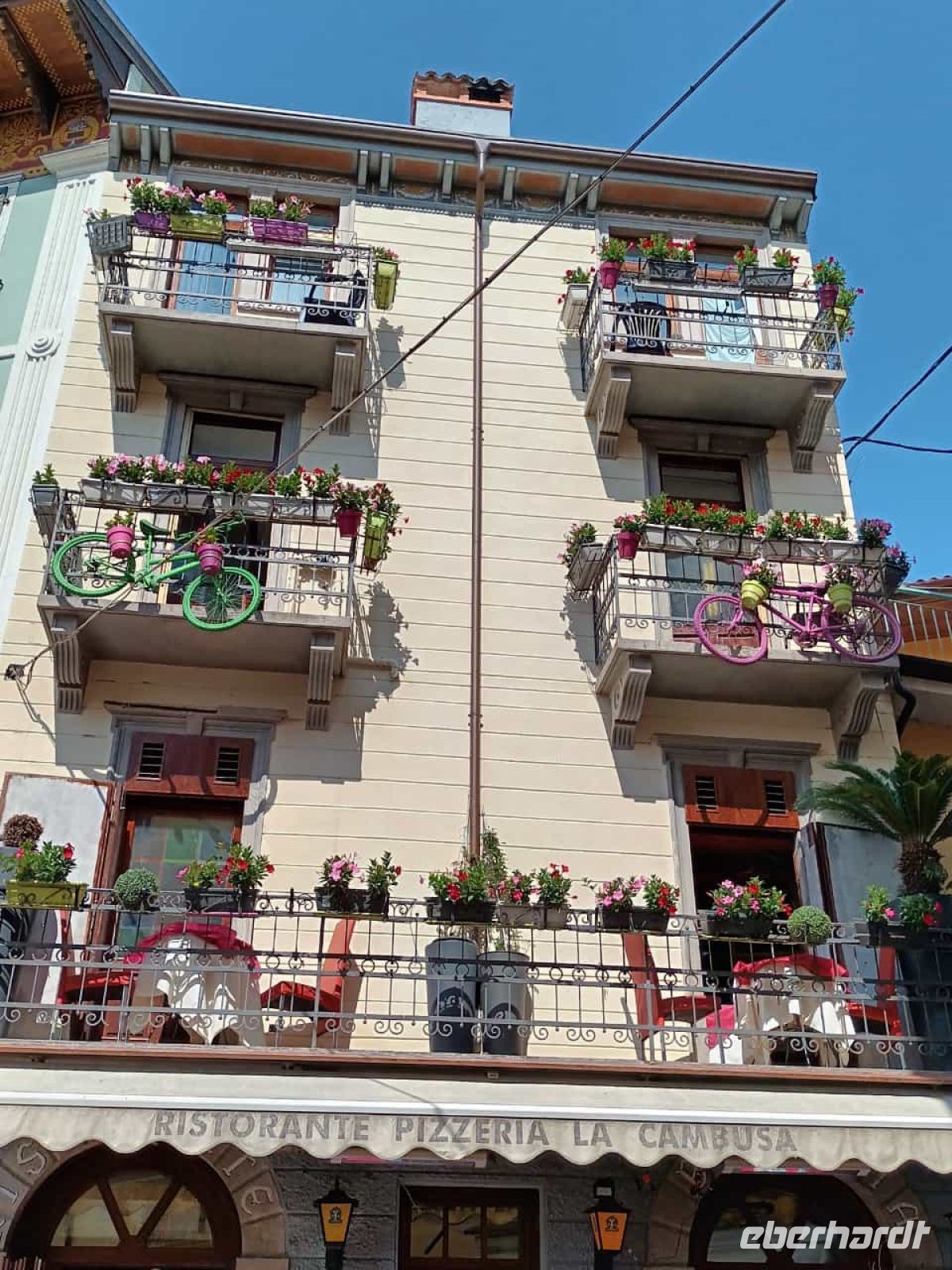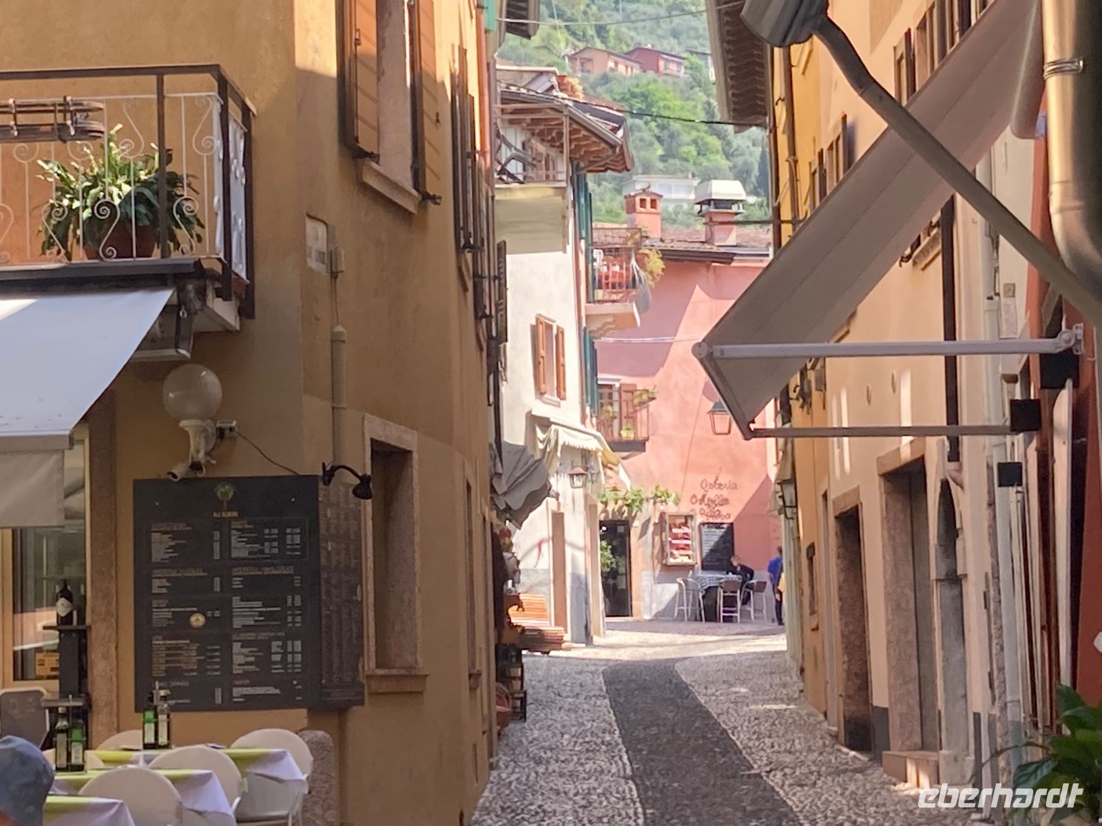 Nach der Talfahrt durchstöberten wir noch das malerische Städtchen Malcesine (3.700 Einwohner).Der Ort wird von der Skaligerburg stark dominiert. Diese thront über dem mittelalterlichen Ortskern. Kleine Gässchen, malerische Plätze, überwölbte Durchgänge und auch etwas holprige Wege faszinieren uns. Auch bot sich reichlich Gastronomie und so viel Wahl schwer, ja irgendwann musste oder sollte man sich entscheiden. Auf der Rückfahrt mit dem Bus konnten wir noch am Stadtende den Landeplatz der Gleitschirmfliger erkennen.