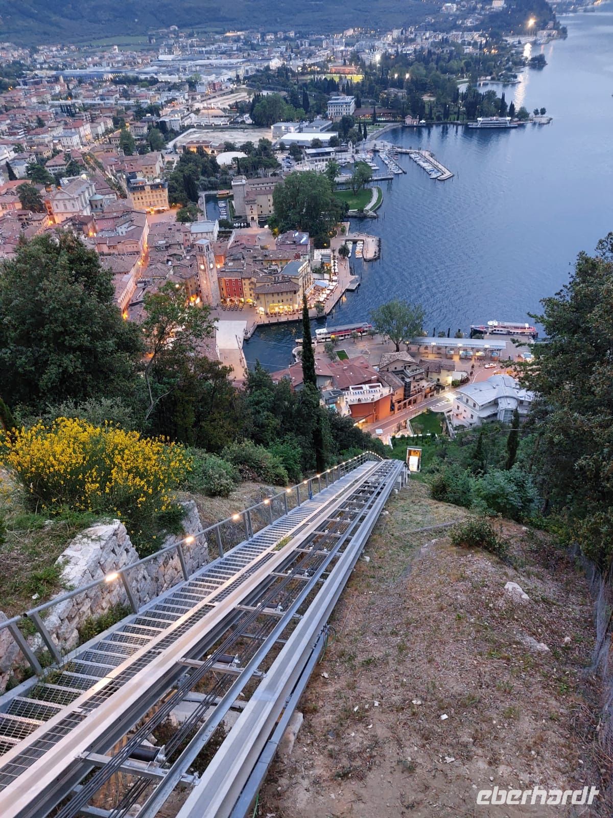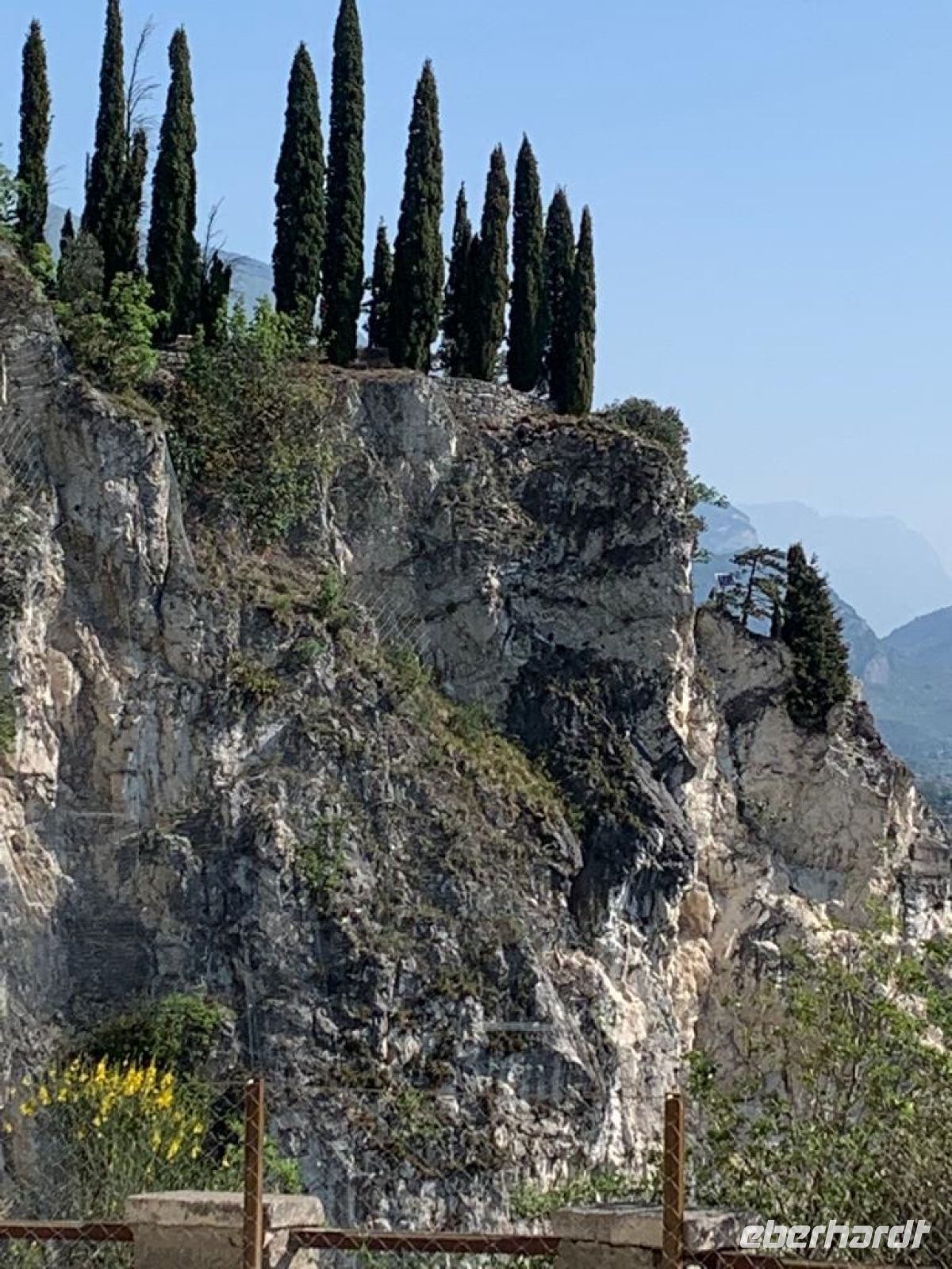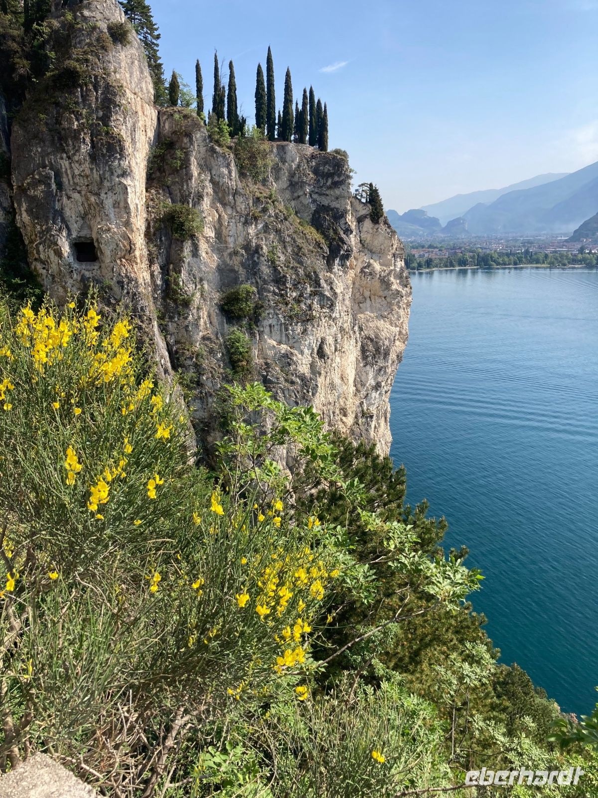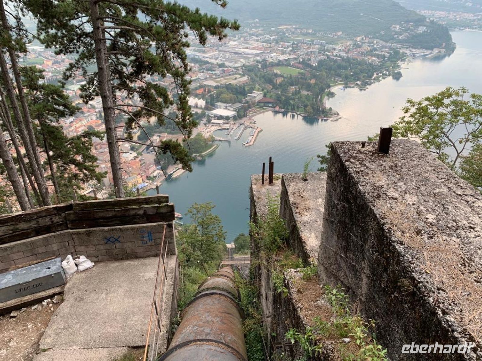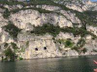Es sollte für den ersten Tag eine leichte Wanderung werden. Der kurze steile Anstieg mit vielen Stufen hatte es jedoch in sich. Jedoch gab es immer wieder einen Grund eine Kurze Rast ein zu schieben, denn traumhafte Aussichten über den See boten sich immer wieder. So waren es reichlich 350 Höhenmeter, die noch kurz von einer Besichtigung einer alten Bunkeranlage unterbrochen wurde. Auf dem Monte Brione (knapp 400 m hoch) angeklagt hatten wir auch Dagmar unsere Bergsprinterin eingeholt, wir hielten Ausschau, diesmal auch ins „Hinterland“. U.a. bot sich der Blick auf die Papierfabrik von Riva, der vermutlich größte Arbeitgeber in der Umgebung und auf unser nächstes Ziel.