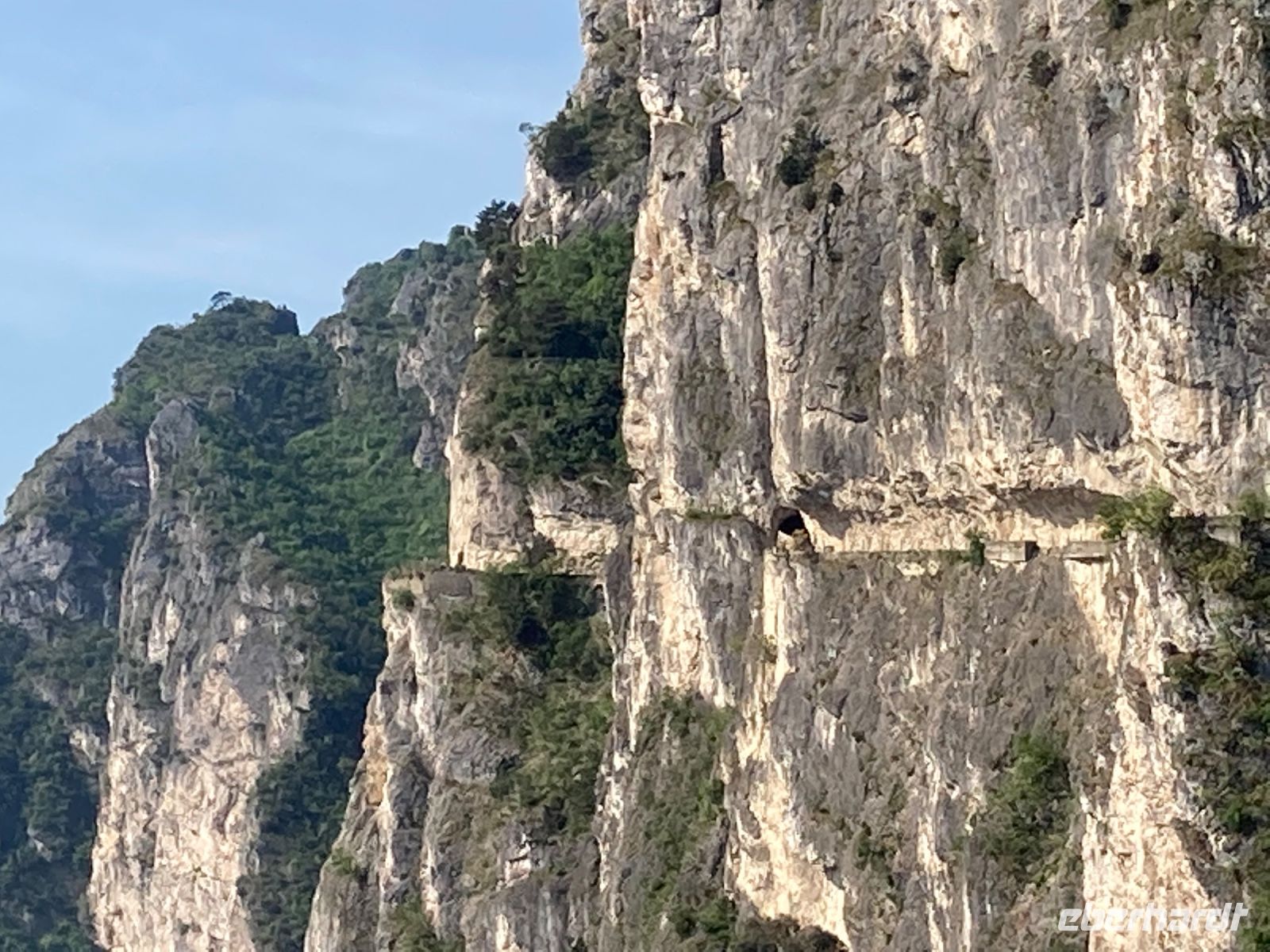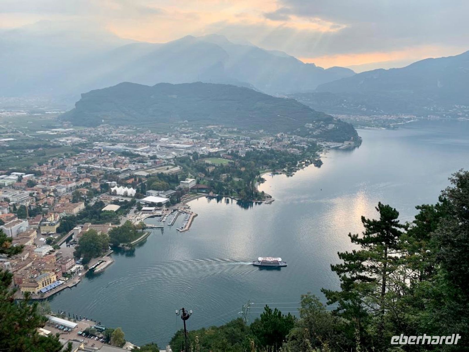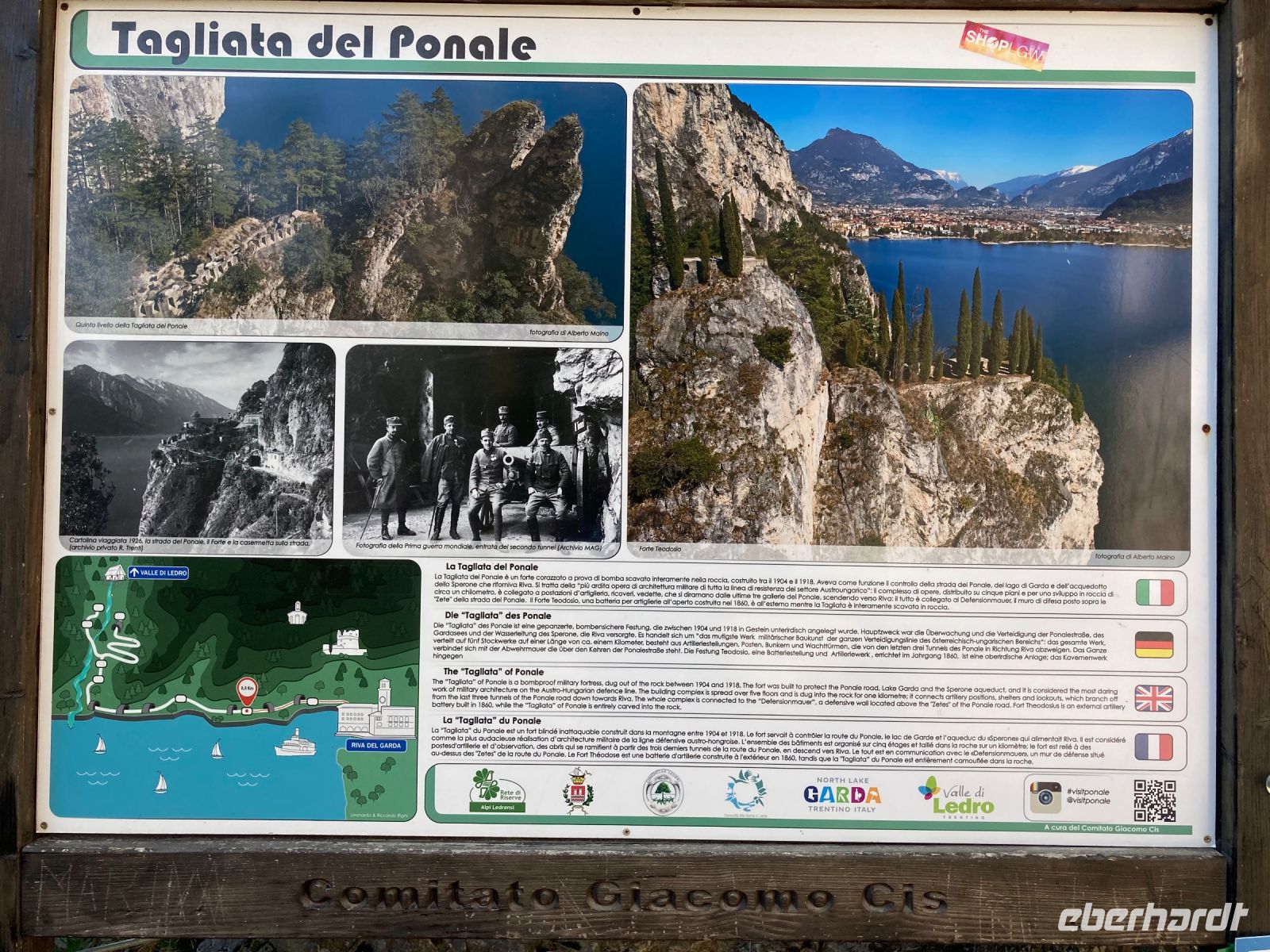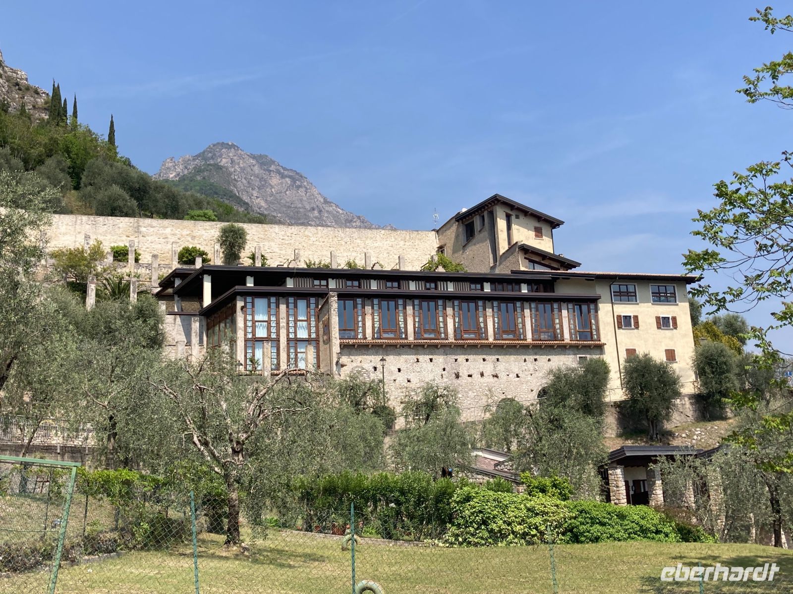 Es sollte für den ersten Tag eine leichte Wanderung werden. Der kurze steile Anstieg mit vielen Stufen hatte es jedoch in sich. Jedoch gab es immer wieder einen Grund eine Kurze Rast ein zu schieben, denn traumhafte Aussichten über den See boten sich immer wieder. So waren es reichlich 350 Höhenmeter, die noch kurz von einer Besichtigung einer alten Bunkeranlage unterbrochen wurde. Auf dem Monte Brione (knapp 400 m hoch) angeklagt hatten wir auch Dagmar unsere Bergsprinterin eingeholt, wir hielten Ausschau, diesmal auch ins „Hinterland“. U.a. bot sich der Blick auf die Papierfabrik von Riva, der vermutlich größte Arbeitgeber in der Umgebung und auf unser nächstes Ziel.