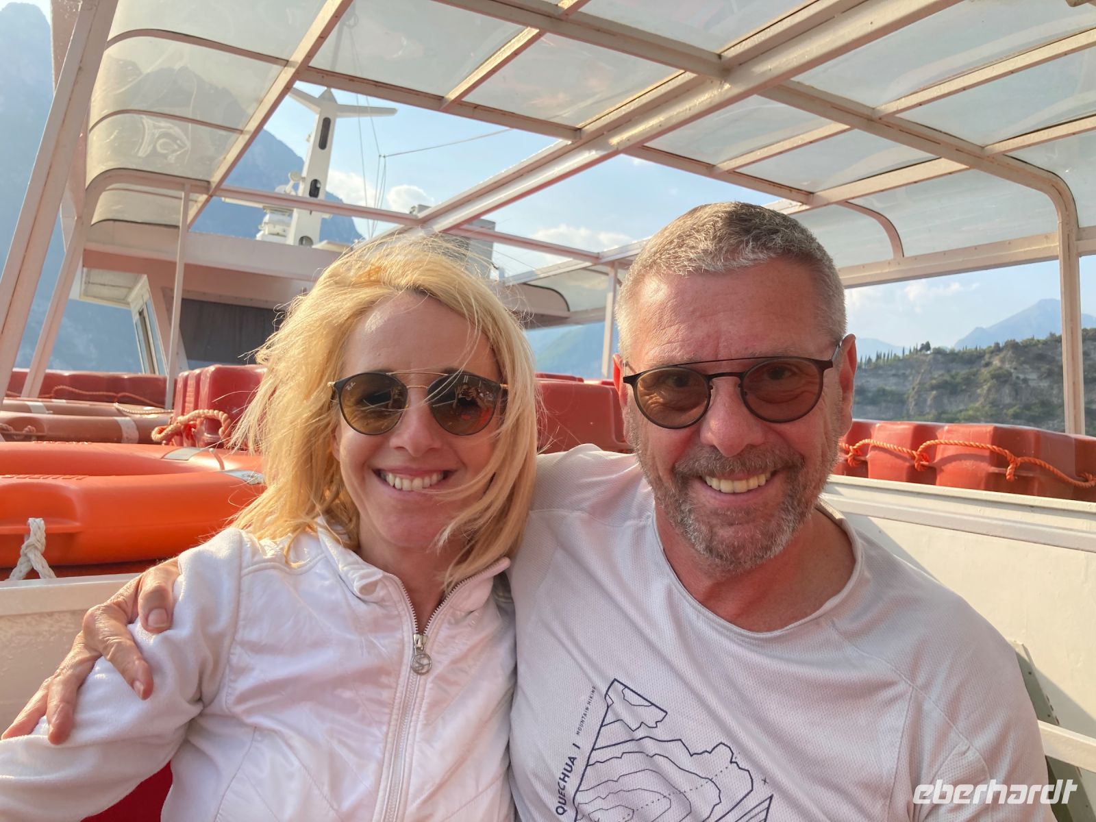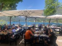 Wir steigen durch ein malerisches Tal im am Wasser entlang bis zu unserem ersten Ziel auf. In der Ölmühle der Genossenschaft Possidenti Olivieti (600 Mitglieder) werden wir schon erwartet. Der Rundgang beginnt mit einem Einführungsvideo auf Deutsch. Es werden uns die Plätze für die kurze Zwischenlagerung, die luftdurchströmt sein müssen, gezeigt, der Pressvorgang erläutert und auch die anderen Maschinen werden uns gezeigt. Die Erntemengen fallen Jahr für Jahr sehr unterschiedlich aus erfahren wir und 2021 war kein gutes Jahr. Anschließend wird verkostet und gekauft. Weiter geht es noch etwas bergauf, wo wir eine schöne Taverne mit grandiosem Ausblick (wie sollte es auch anders sein) erwartet. Nach gemütlicher Rast geht es weiter, zwei Programmpunkte erwarten uns noch. Nachdem wir einen schönen Wald durchschritten hatten erreichen wir vorbei an schönen Ferienwohnungen und Hotels, die ehemalige Wohn- und jetzige Gedenkstätte des Missionars Comboni. Bald erreichen wir wieder die Ortsmitte von Limone und wir besichtigen noch einen Zitronengarten, der hier als Museum noch erhalten und gepflegt wird. Der professionale Zitronenanbau findet hier schon lange nicht mehr statt. Nach einer ausgiebigen Pause geht es 17:10 Uhr wieder mit dem Schiff nach Riva der Garde. Zu meiner Überraschung treffen wir auf dem Schiff Barbara, die Partnerin von Bogi. Sie hat die Eberhardtgruppe auf der gleichen Wanderreise vorigen September geführt. Entsprechen herzlich erwartet das Wiedersehen.