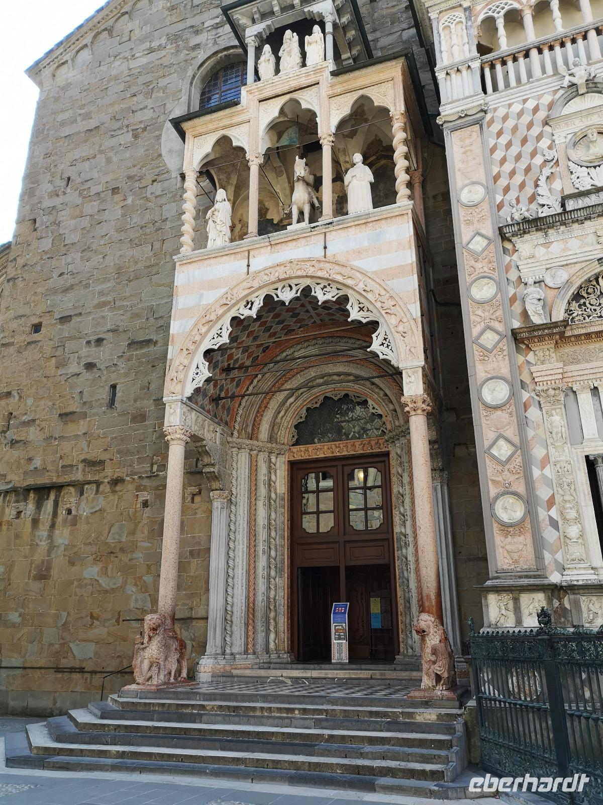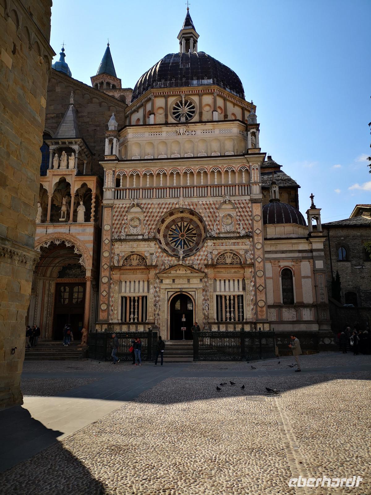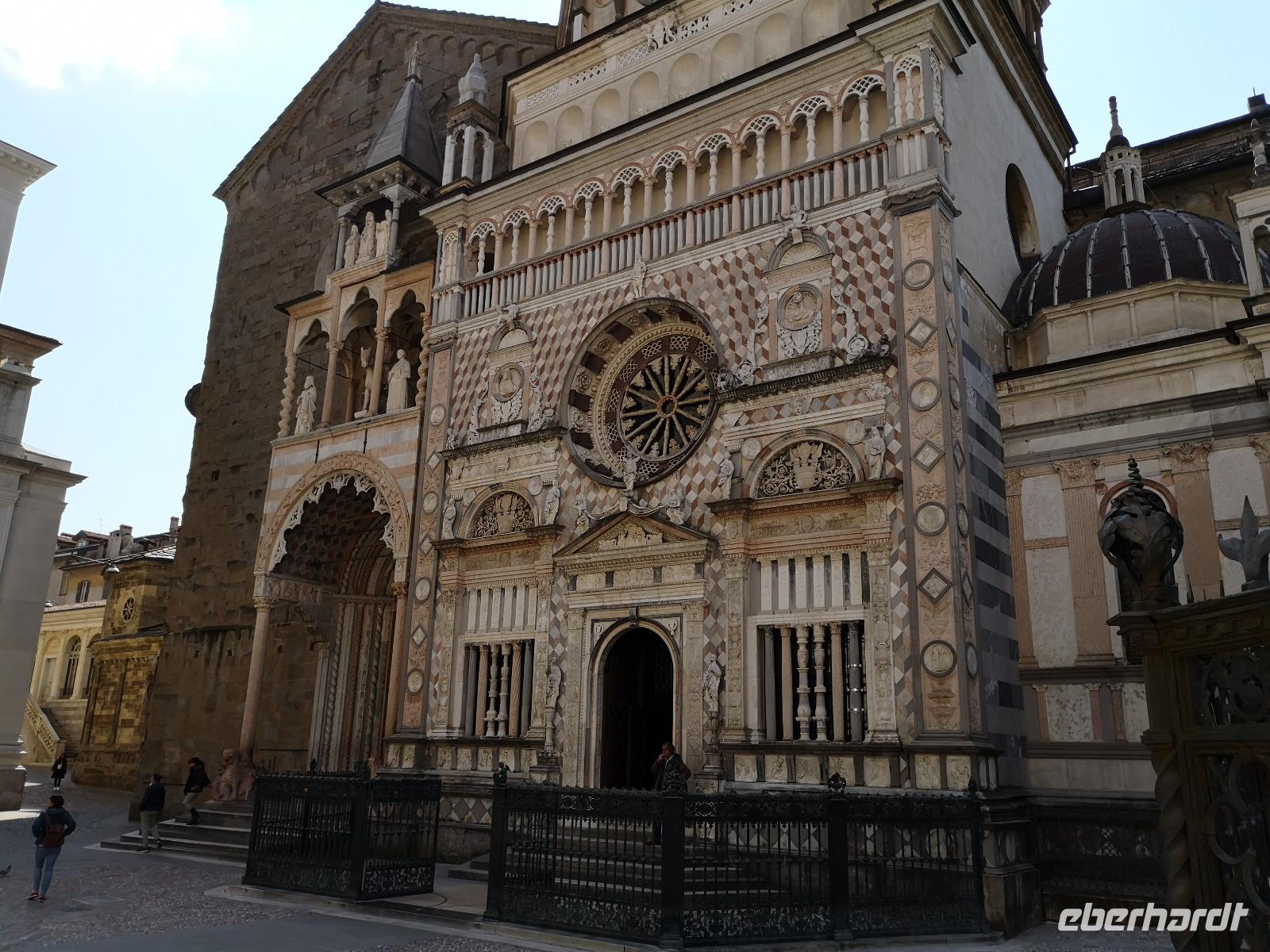 Heute steht etwas Besonderes auf dem Programm, was nicht jeder direkt mit dem Gardasee verbindet. Wir besuchen die Altstadt von Bergamo. Sie liegt oben auf dem Hügel, in ursprünglich sicherer Höhenlage erbaut. Der Zugang zu dem alten Stadtkern erfolgt für uns mit der Standseilbahn, die uns schnell die 100 Meter Höhendifferenz überwinden lässt. In der Oberstadt angelangt zeigt uns Elisabeth, unsere lokale Stadtführerin ihren Geburtsort Bergamo. Erst den Weg durch die engen Gassen und lässt uns gleichmal von dem regionalen Käse, dem Bitto kosten. Er wird aus Kuhmilch versetzt mit etwas Ziegenmilch hergestellt. Ganz oben auf dem Domplatz angelangt umgeben mit prachtvollen Bauten im romanischen und gotischen Stil. Leicht nach hinten versetzt liegt die Kathedrale Santa Maria Maggiore, die wir uns als erstes genauer anschauen. Danach geht es in die Taufkapelle und dann noch kurz in den kleinen Palast Cappela Colleoni.