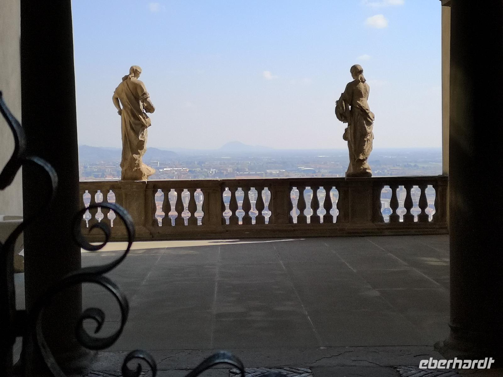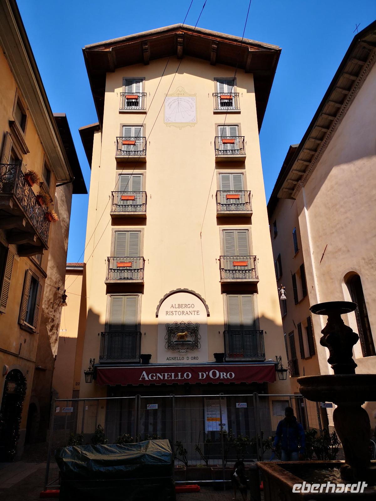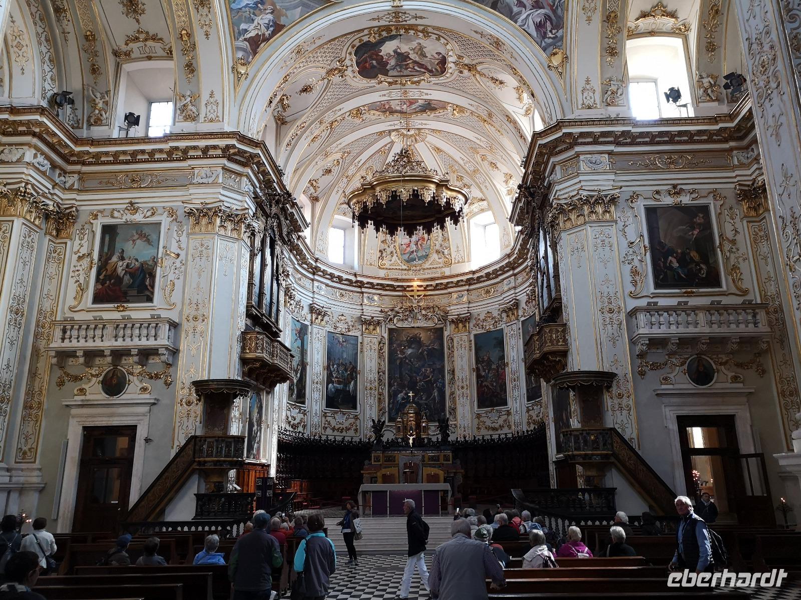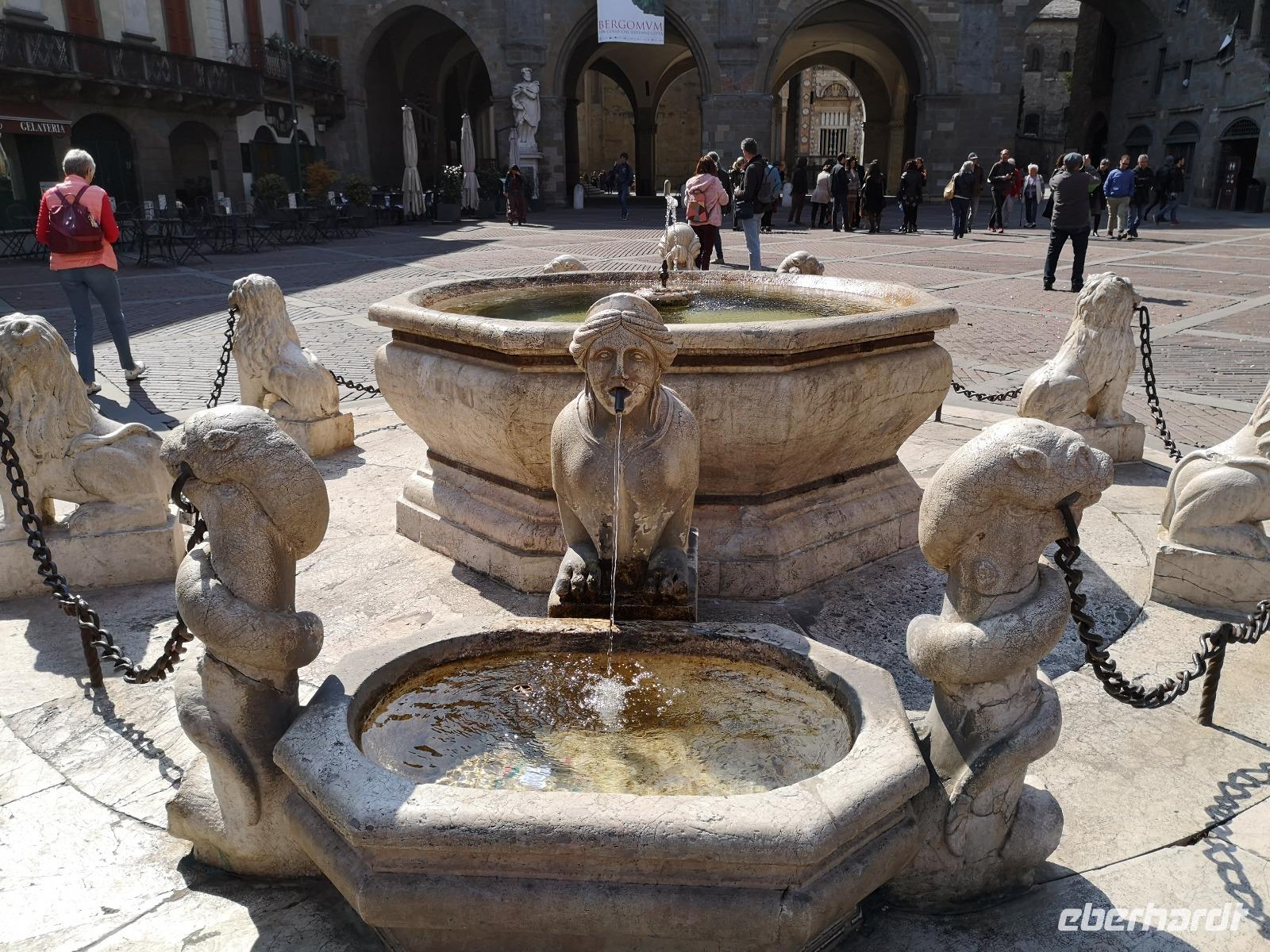 Heute steht etwas Besonderes auf dem Programm, was nicht jeder direkt mit dem Gardasee verbindet. Wir besuchen die Altstadt von Bergamo. Sie liegt oben auf dem Hügel, in ursprünglich sicherer Höhenlage erbaut. Der Zugang zu dem alten Stadtkern erfolgt für uns mit der Standseilbahn, die uns schnell die 100 Meter Höhendifferenz überwinden lässt. In der Oberstadt angelangt zeigt uns Elisabeth, unsere lokale Stadtführerin ihren Geburtsort Bergamo. Erst den Weg durch die engen Gassen und lässt uns gleichmal von dem regionalen Käse, dem Bitto kosten. Er wird aus Kuhmilch versetzt mit etwas Ziegenmilch hergestellt. Ganz oben auf dem Domplatz angelangt umgeben mit prachtvollen Bauten im romanischen und gotischen Stil. Leicht nach hinten versetzt liegt die Kathedrale Santa Maria Maggiore, die wir uns als erstes genauer anschauen. Danach geht es in die Taufkapelle und dann noch kurz in den kleinen Palast Cappela Colleoni.