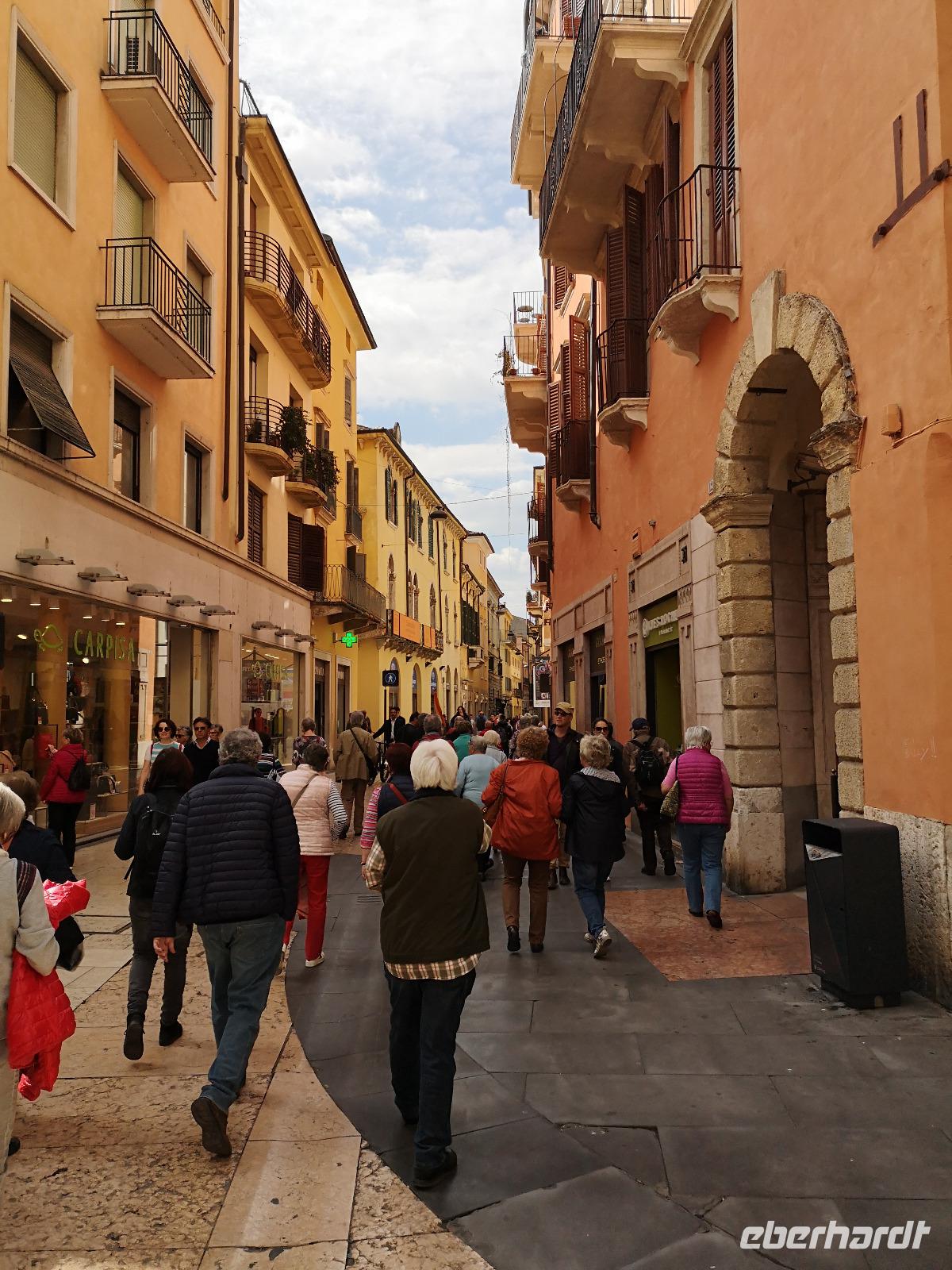 Wir gehen weiter in die via Mazzini, der schmucken Einkaufsstraße und besuchen das hier gelegene Julia Haus. Keiner möchte es missen seine Portion Glück von Julia's Glanz zu erhaschen ... sie ist aber auch schön die Julia. Durch Dieter hat es sich schnell herumgesprochen dass es hier in Verona das beste Eis gibt und das musste jetzt auf der Hand und zu Fuß genossen werden. Wir durchstreiften noch einige Gassen bis zum Castelveccio, überquerten dort den Fluss Etsch wo unsere Busse auf uns warteten.