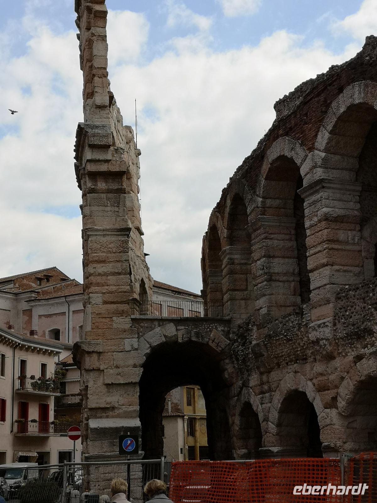 Mit dieser Vorbereitung sind wir nun gut eingestellt um uns zu Fuß auf den Weg in das Zentrum zu machen. Unseren Stadtführern Claudia und Janos folgend, kommen wir bald am Piazza Bra und der Arena, dem Amphitheater von Verona an. An diesem Ort vereinen sich die Architektur das römischen Reichs und des Mittelalters.