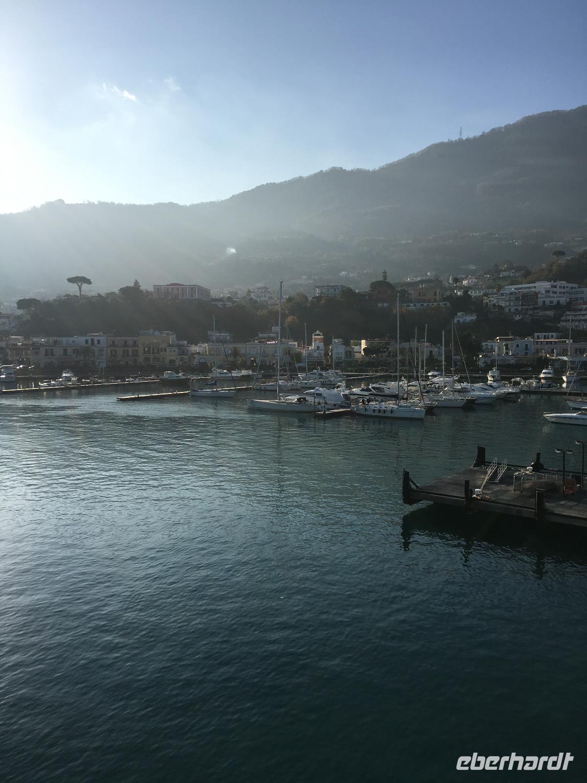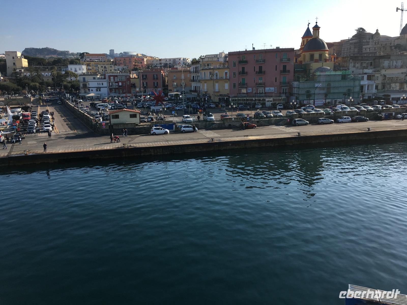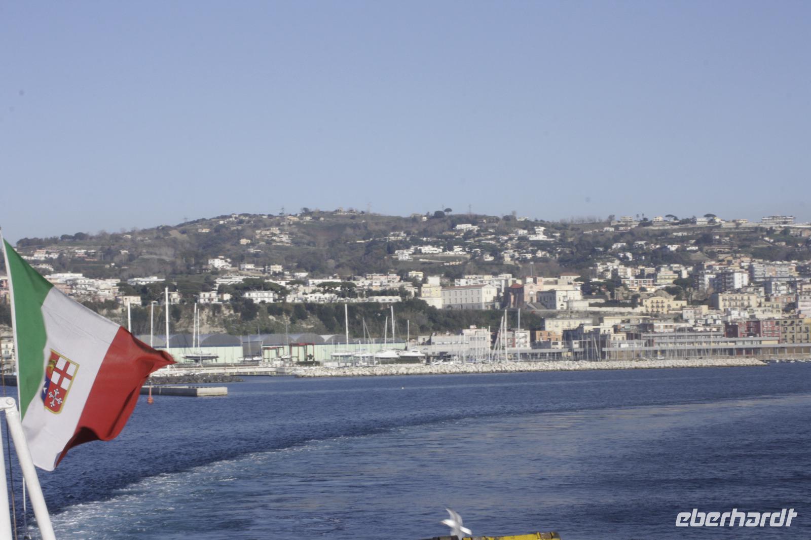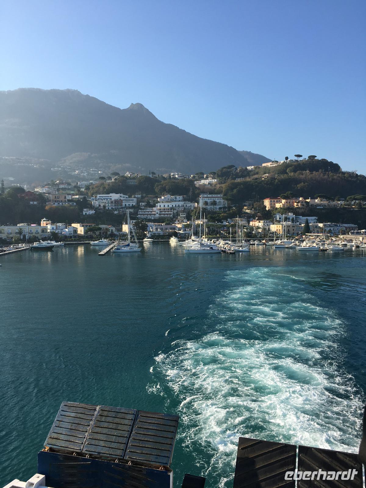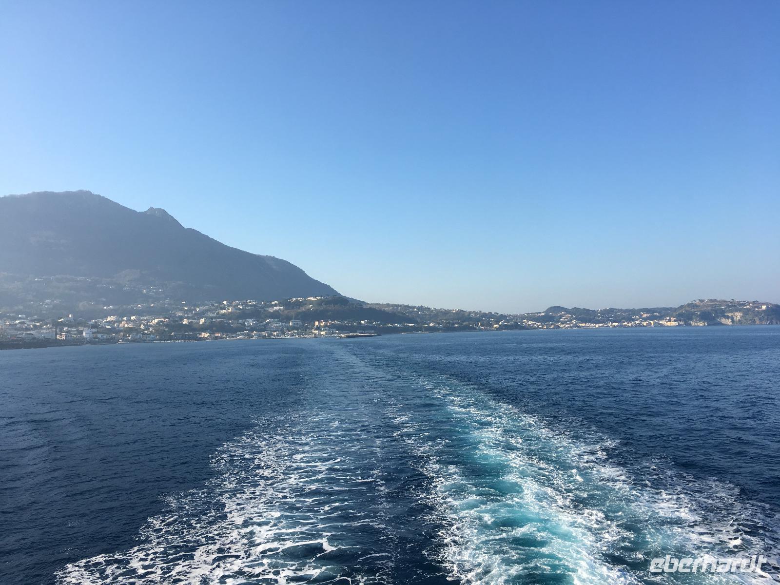 Nach unserem Frühstück werden wir von unserem Busfahrer empfangen, welcher uns nach Casamicciola zum Hafen chauffiert. Hier treffen wir auf Flavia, welche uns bis zum Flughafen ins Neapel begleiten wird. Auf dem Oberdeck der Fähre fangen wir nochmals ein paar Eindrücke der Insel sowie viele Sonnenstrahlen ein - ein guter Gedanke: denn in heimatlichen Gefilden wird uns Schneefall prognostiziert!