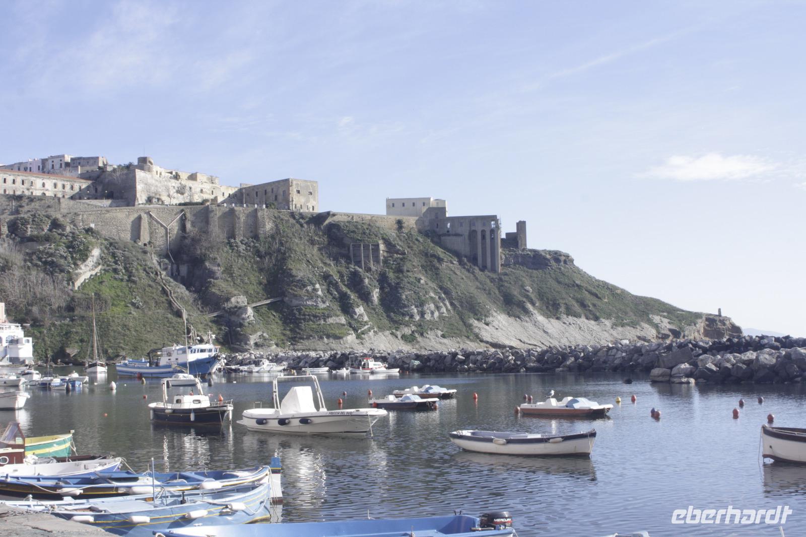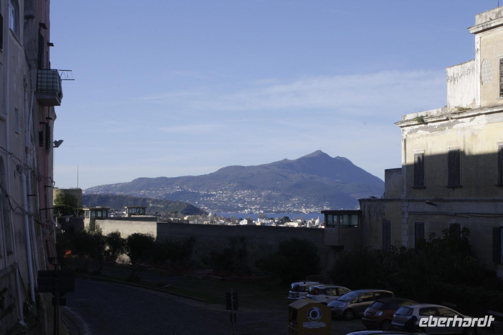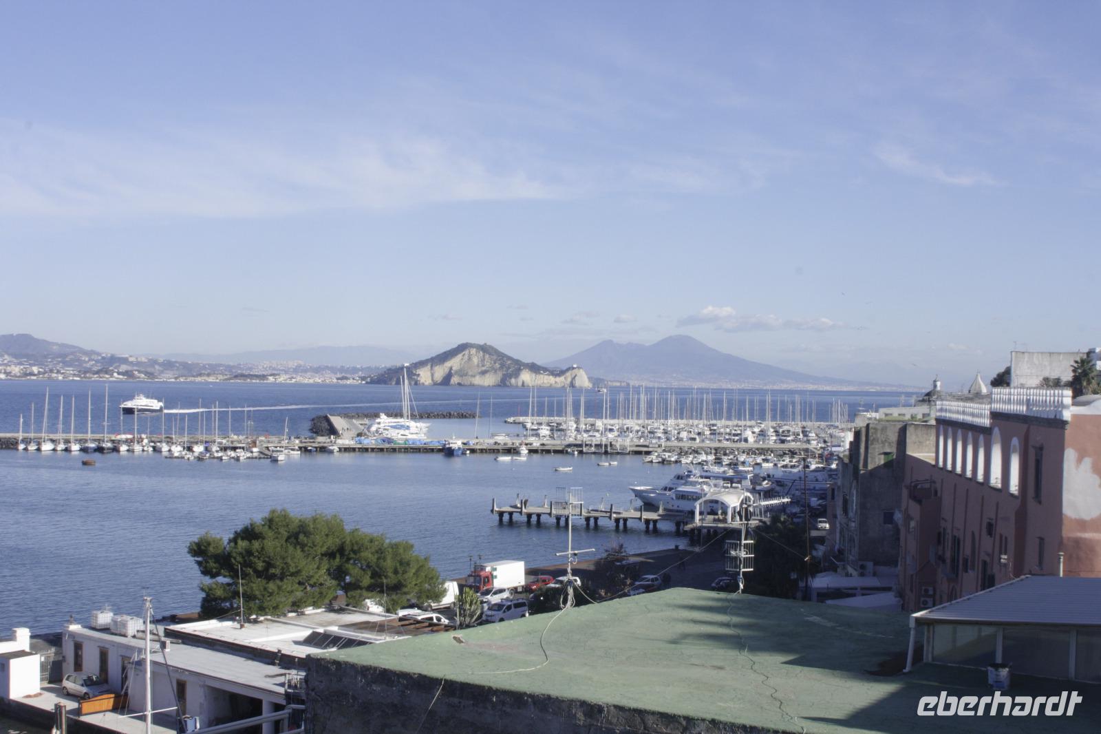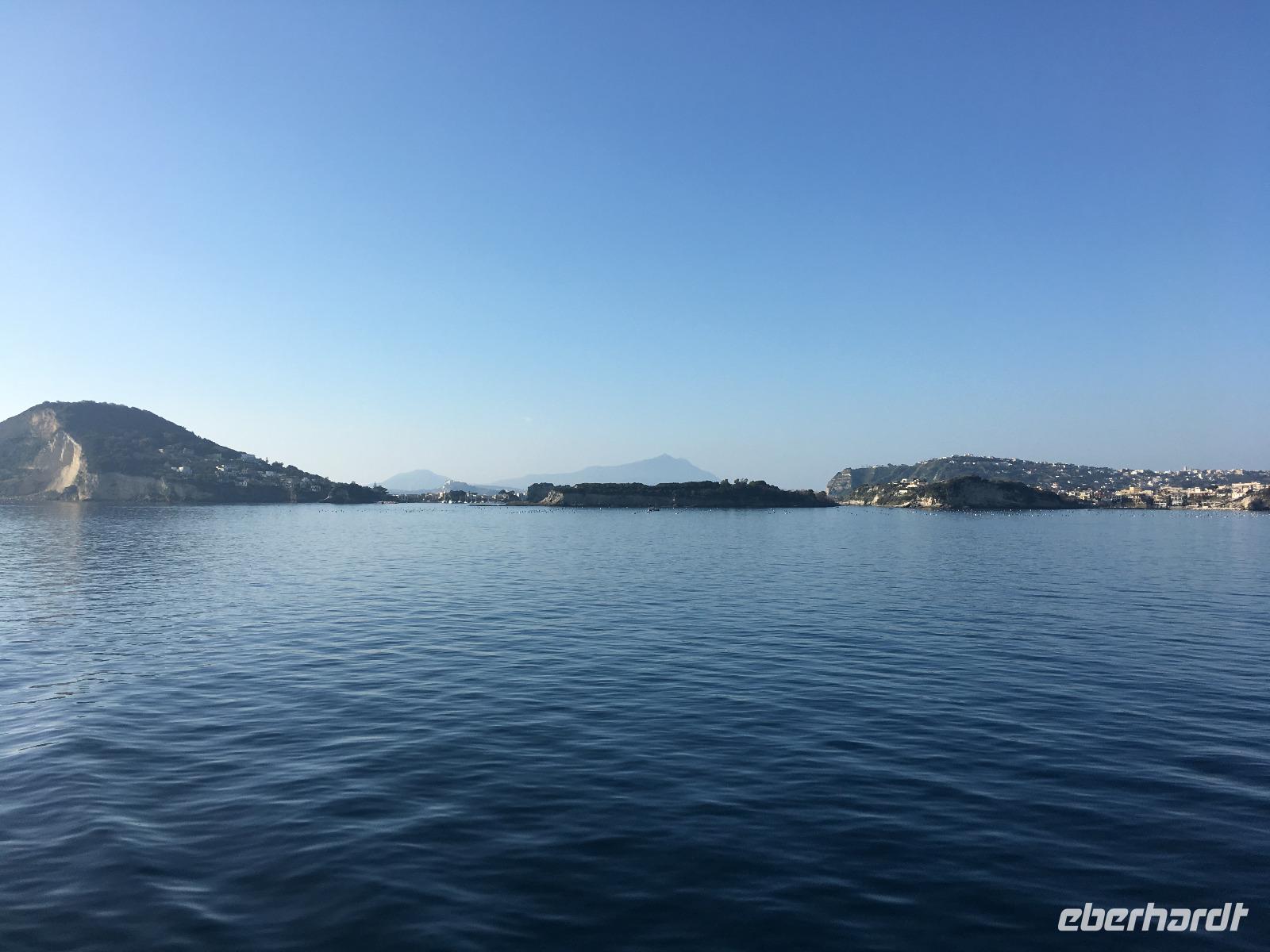 Um 12:30 Uhr landen wir bei bestem Wetter in Neapel. Dort angekommen, erwartet uns Flavia, um uns mit 3 Kleinbussen zum Fährhafen Pozzuoli zu begleiten. Auf dem Fährschiff angekommen, genießen wir die ersten Sonnenstrahlen auf dem Oberdeck und blicken auf den Golf von Neapel sowie den Vesuv. Nach rund 90 Minuten Überfahrt und einem kleinen Zwischenhalt an der Insel Procida, erreichen wir unser Ziel: Ischia.