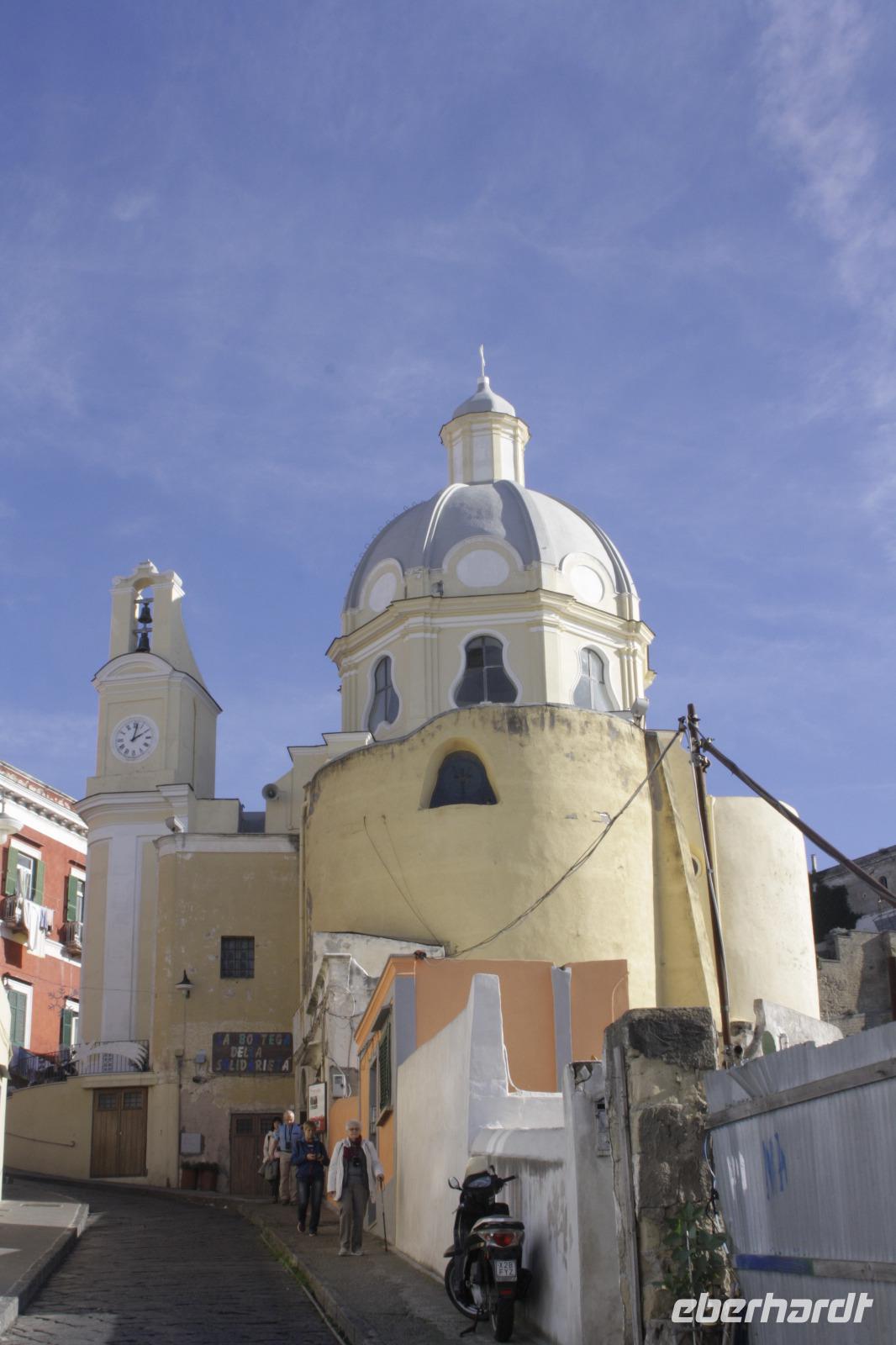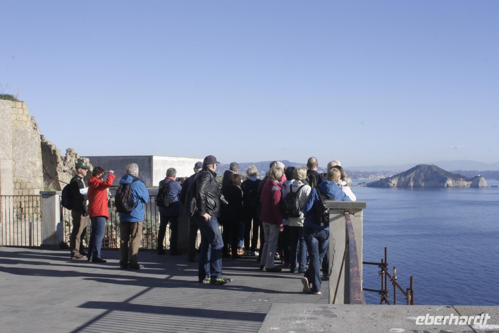 Am heutigen Tage steht ein Ausflug auf die benachbarte Insel Procida an. Die Insel ist die kleinste der drei Phlegräischen Inseln (Ischia, Capri, Procida) im Golf von Neapel. Sie ist trotz ihrer geringen Fläche von 4 Quadratkilometern mit über 10.000 Einwohnern die am dichtesten besiedelte Insel in Europa. Am Hafen von Casamicciola treffen wir auf unseren Wanderleiter Biagio und begeben uns mit einem Schnellboot zur Insel Procida. Dort angekommen, erwarten uns mehrere Mikro-Taxis zur Inselrundfahrt. Von der Aussichtsplattform der Abtei von San Michele genießen wir bei strahlendem Sonnenschein den wunderschönen Ausblick auf den Golf von Neapel, den Vesuv sowie die Insel Capri. Im Anschluss besichtigen wir noch die Abtei von San Michele sowie den Hafen Procidas. Nach einem beschwerlichen Aufstieg über circa 150 Treppen steigen wir wieder in unsere Mikro-Taxis. Diese bringen uns nach einer kurzen Rundfahrt zu einem Restaurant, in welchem wir unsere Mittagspause bei Pasta und Wein verbringen. Die Fahrer der Mikro-Taxis beweisen mehrmals ihre Fahrkünste in den engen Gassen Procidas. Nach unserer Stärkung laufen wir hinunter zum Hafen und fahren zurück zur Insel Ischia. Den Tag lassen wir abermals in den heißen Thermalquellen ausklingen.