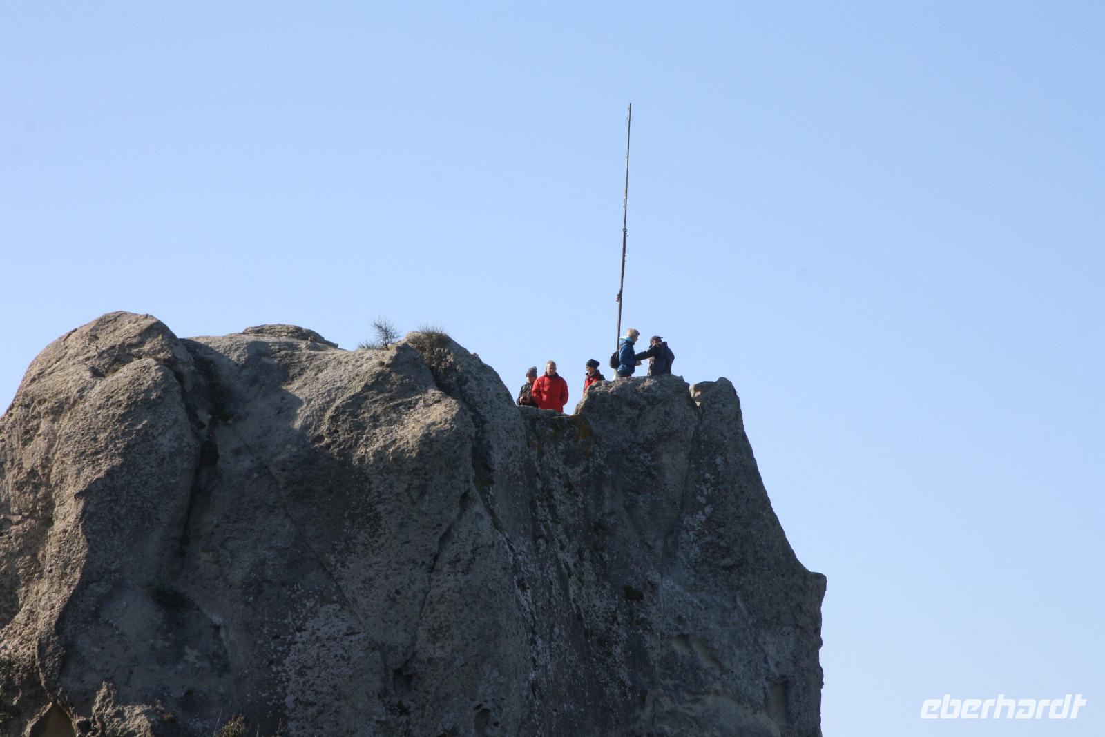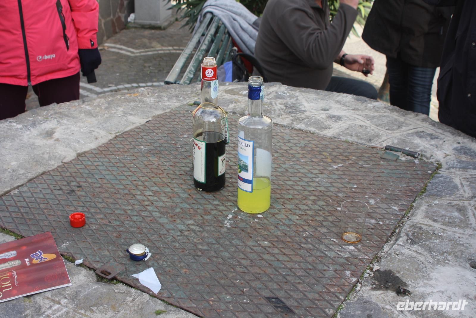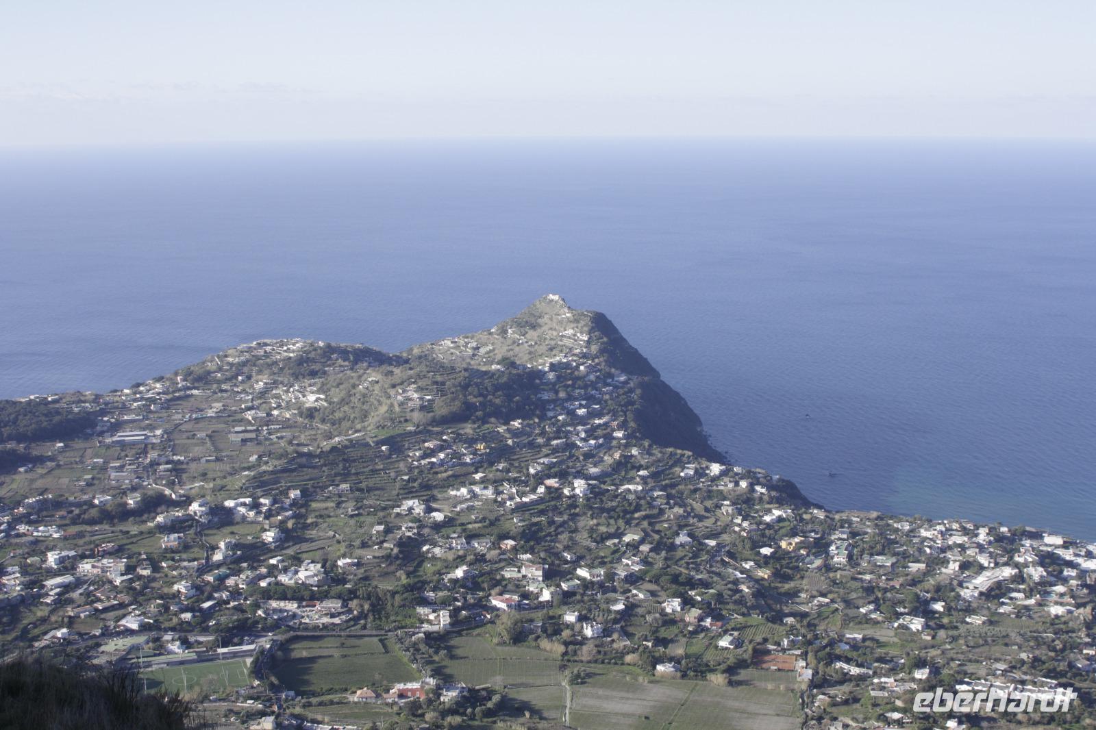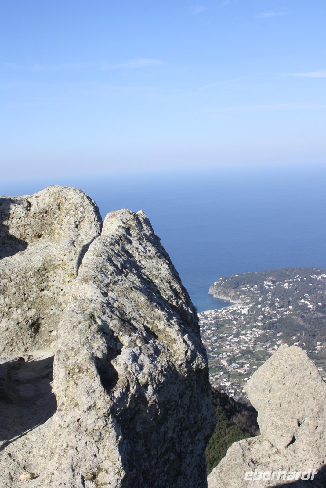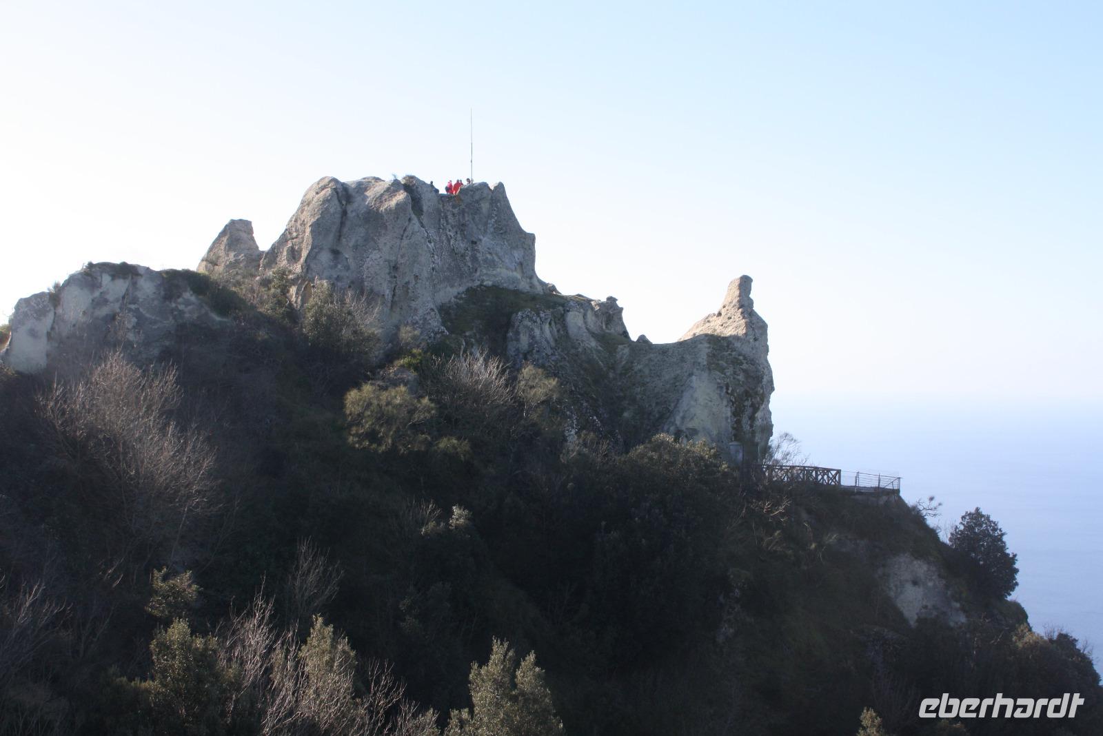 Heute ist es endlich soweit. Unsere Wanderung zum Monte Epomeo, dem mit 789 Metern höchste Berg der Insel Ischia, steht an. Unser Fahrer sowie Wanderleiter Biagio erwarten uns am Hotel. Biagio hat für einige aus unserer Gruppe noch ein paar Wanderstöcke aus Schilf organisiert. Der Bus bringt uns in die kleine Ortschaft Calimera. Von hier aus beginnen wir den Aufstieg über einen Panoramaweg und einen Tuffsteinklamm. Schon jetzt ergibt sich eine einzigartige Aussicht. Am Horizont erkennen wir sogar die Insel Santo Stefano, eine ehemalige Gefängnisinsel nordwestlich von Ischia. Oben angekommen, erklimmen wir noch den Tuffsteinfelsen des Epomeo. Eine atemberaubende Sicht lässt den kühlen Wind ganz rasch vergessen. Wir blicken auf Neapel, den Vesuv, Capri, die Halbinsel Sorrent. Sogar das Cilento kann man in der Ferne entdecken. Wir genießen unsere Mittagspause im Restaurant bei Bruschetta, Pasta und Wein. Da eine andere deutsche Reisegruppe ein wenig früher war, müssen wir uns ein wenig gedulden. Das ist allerdings kein Problem bei diesem wunderschönen Panorama. Nach unserer Mittagspause folgt der Abstieg durch den Falanga-Wald. Im Anschluss wandern wir noch durch einen Pinienwald und genießen den Ausblick auf Ischia Porto sowie den Golf von Neapel. Im Anschluss bringt uns unser Bus wieder zurück ins Hotel nach Forio.